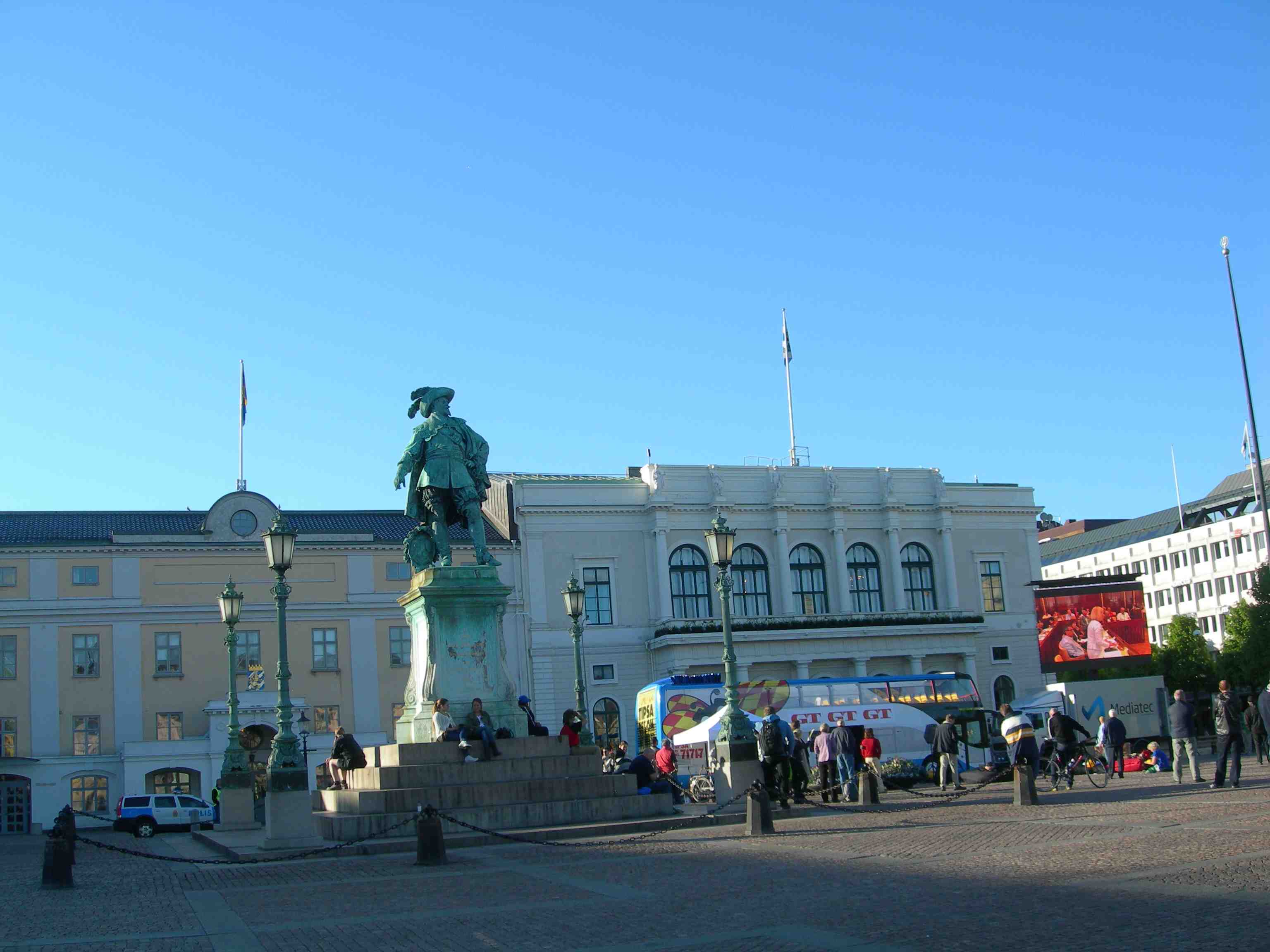 City founder Gustaf II Adolf in his pride surrounded by Rainbow flags. Från 6:ans spårvagn på Södra Hamngatan onsdag 22 maj 2013 kl 19:08.