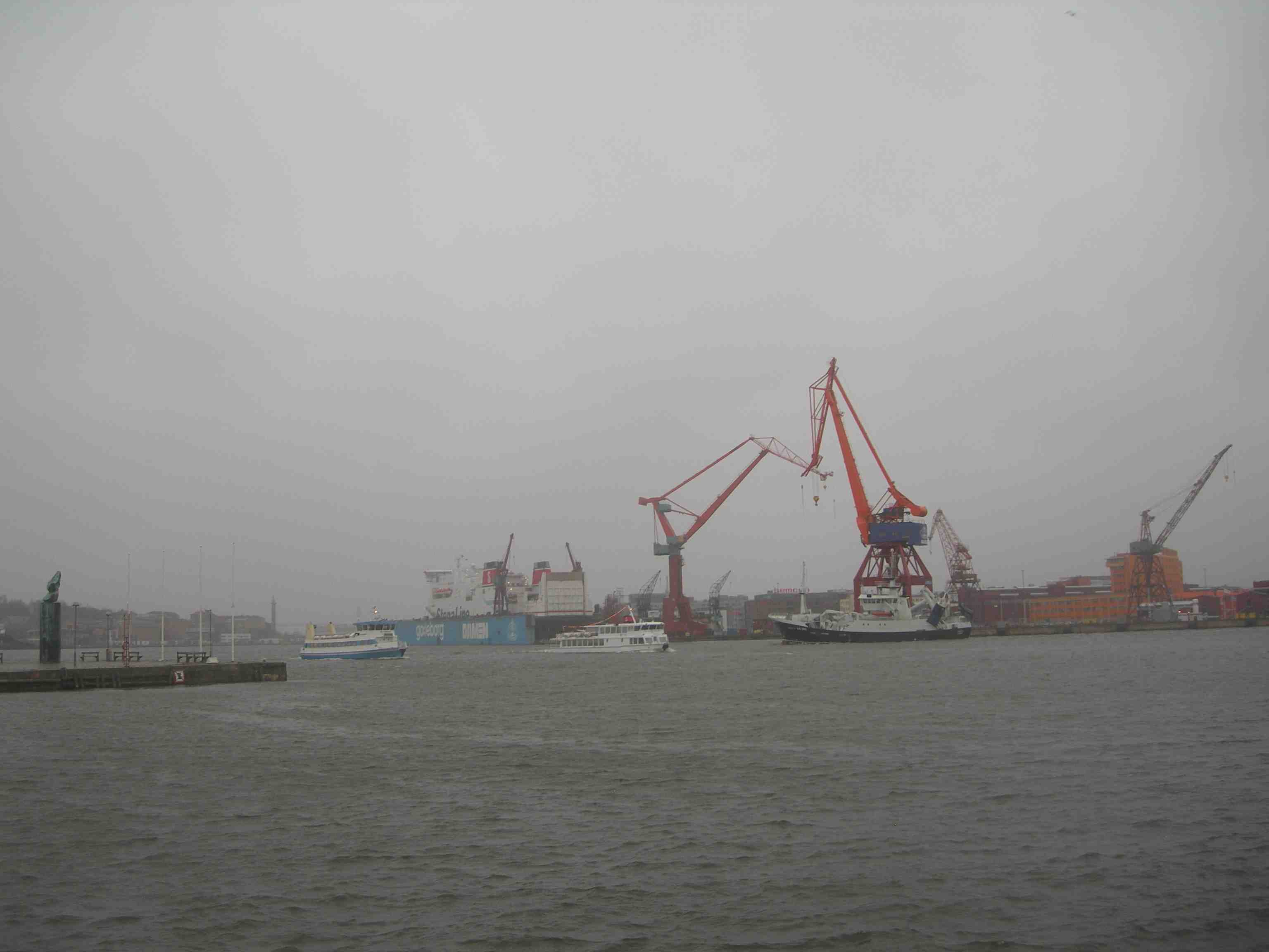 Älv-Snabben 3, Stena Jutlandica, Carl Michael Bellman och fiskebåten GG 203 Ginneton på en disig, regnig och blåsig Göta älv. Torsdag 18 april 2013 kl 18.22.