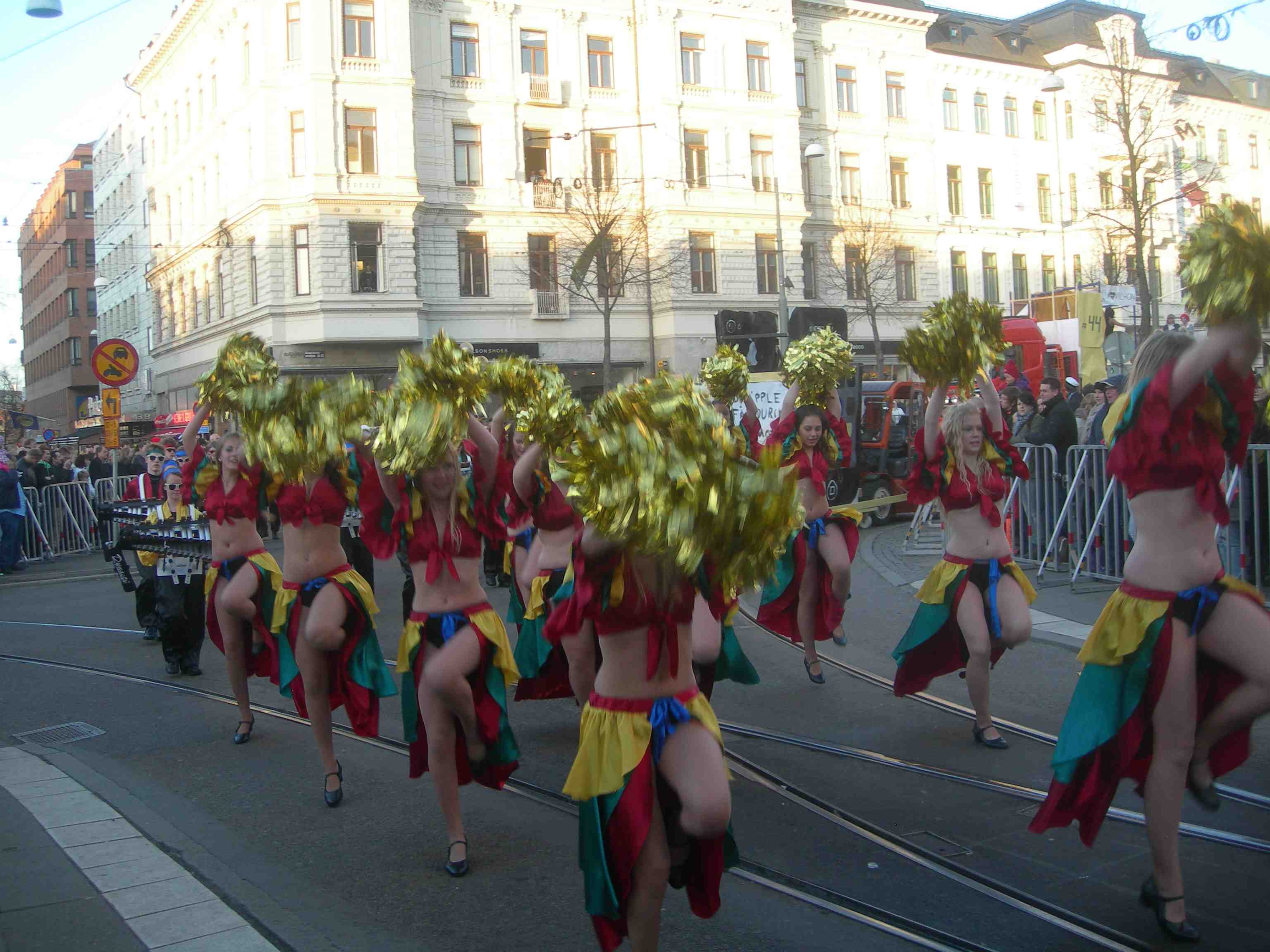 Modiga flickor i Chalmeristcortègen dansar fram i kylan inför påbyltad publik. Valand tisdag 30 april 2013 kl 20.17.