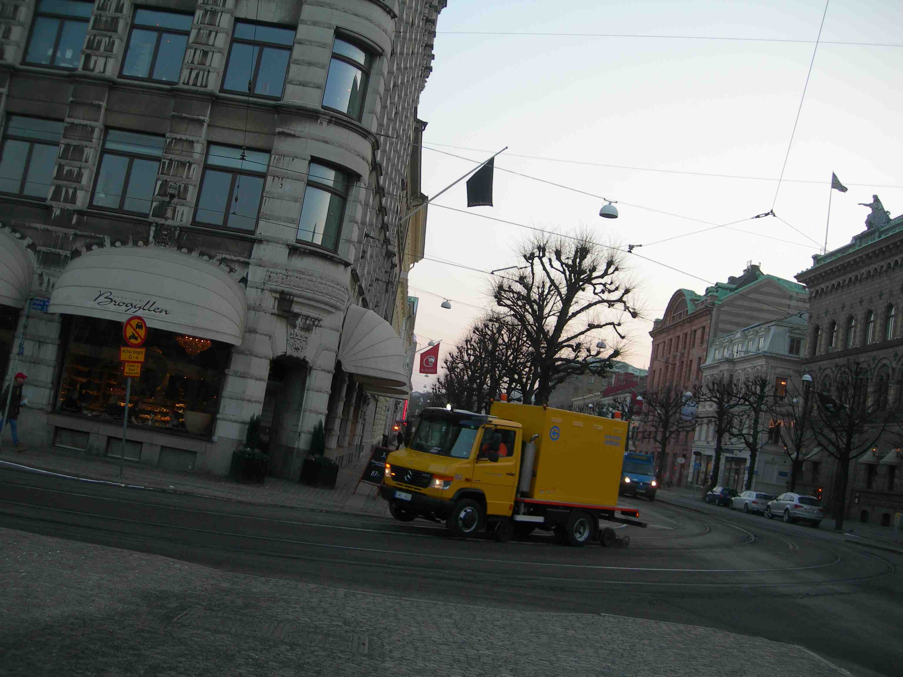 GL:s smörjbil glider genom kurvan från Västra till Södra Hamngatan. Måndag 14 januari 2013 kl 15.22.