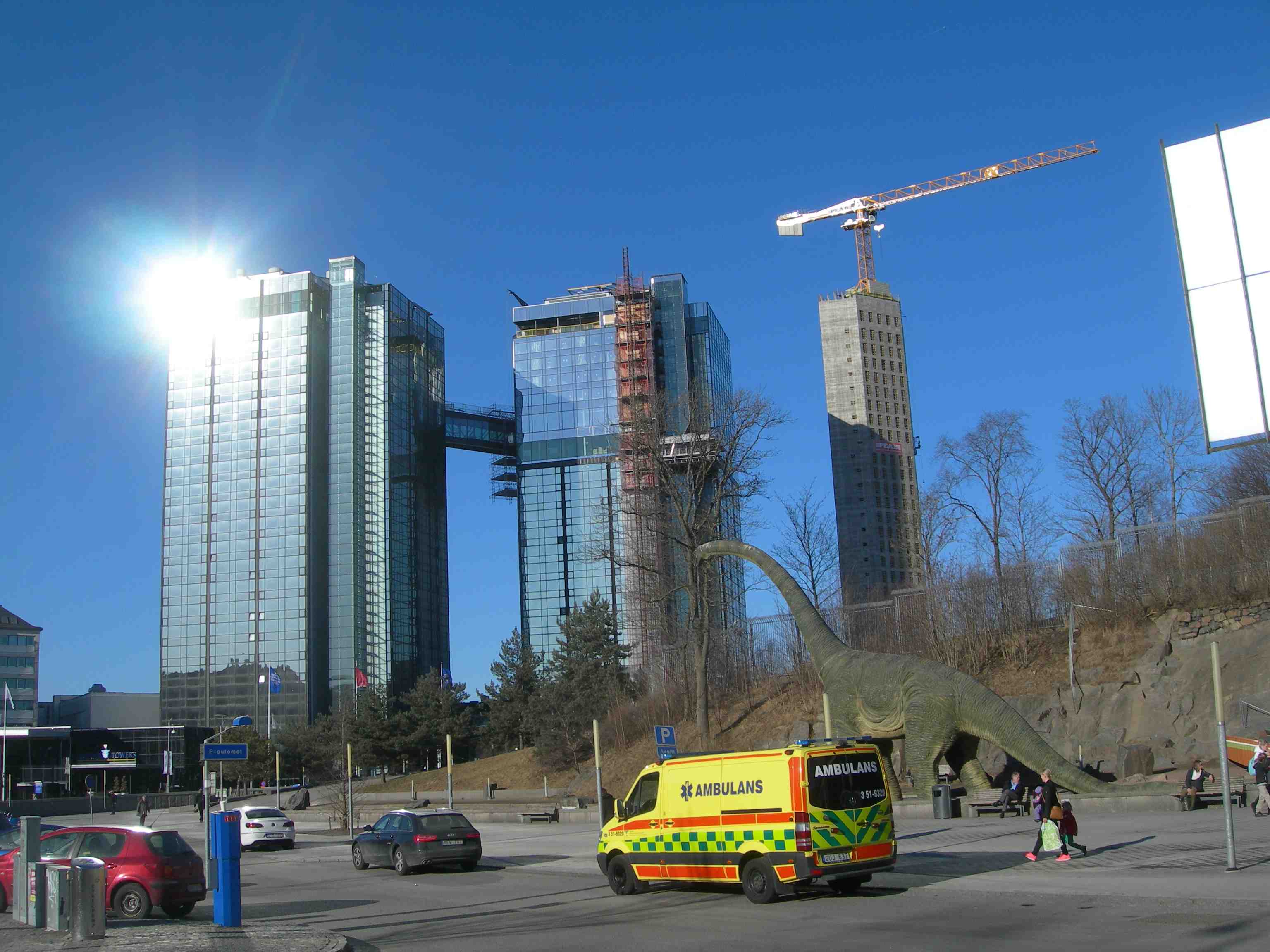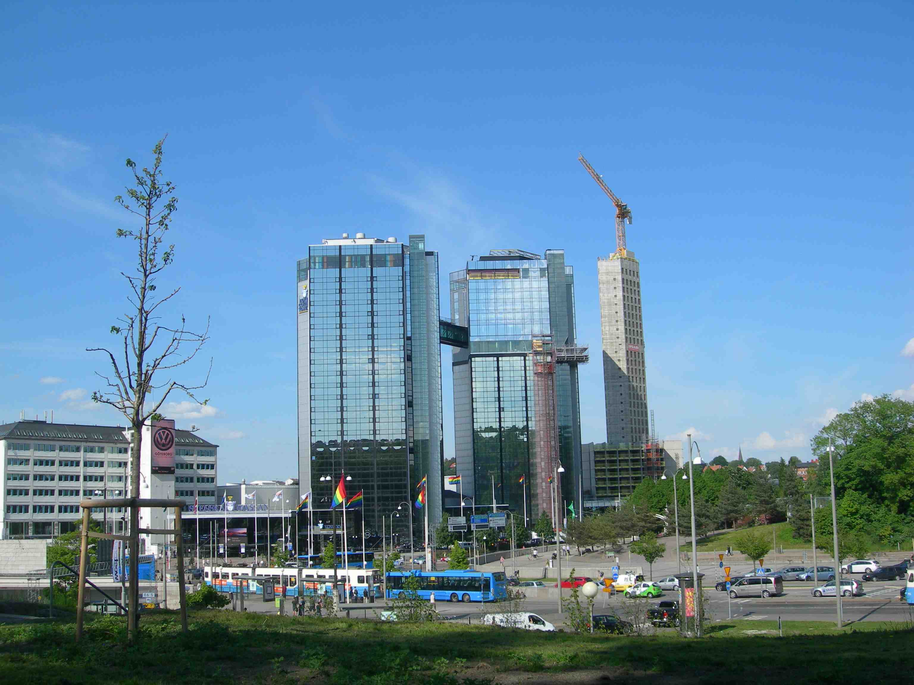 Gothia West Tower, Crown Tower – byggs på med sex våningar – och East Tower som ska bli 100 meter högt och vara färdigt 2015. Universeums dinosaurie tycks beta på ett träd. Onsdag 3 april 2013 kl 17.23.