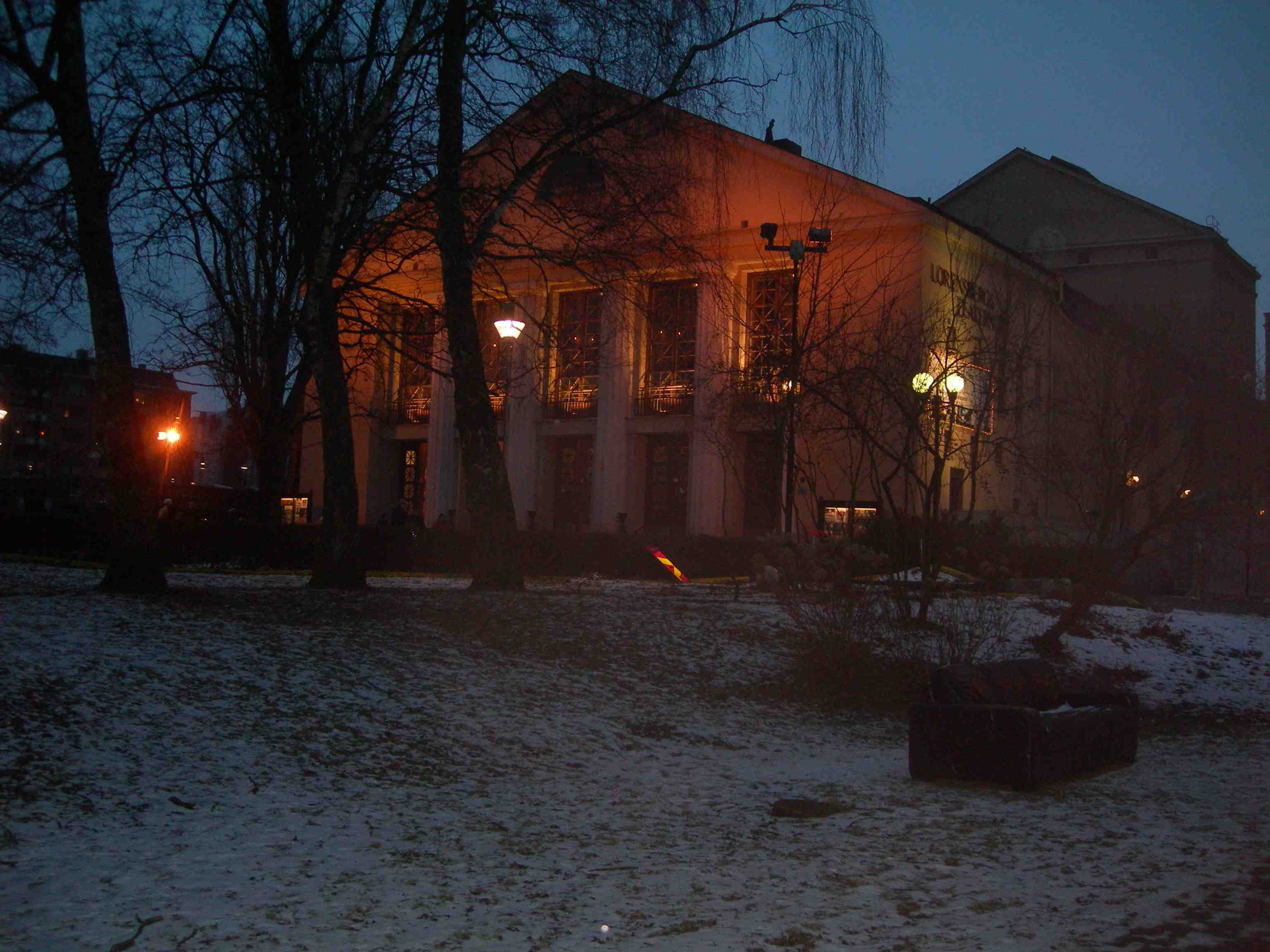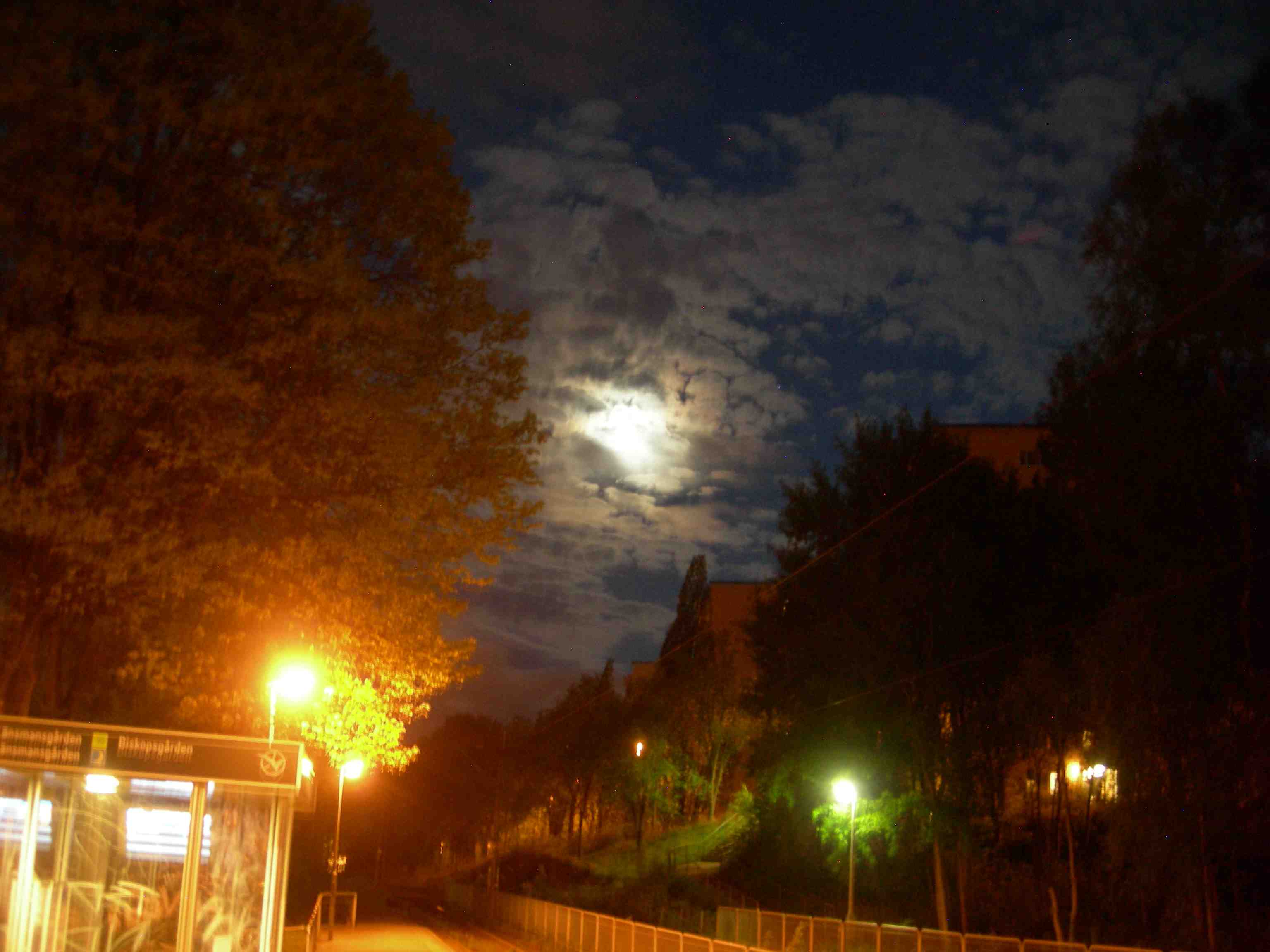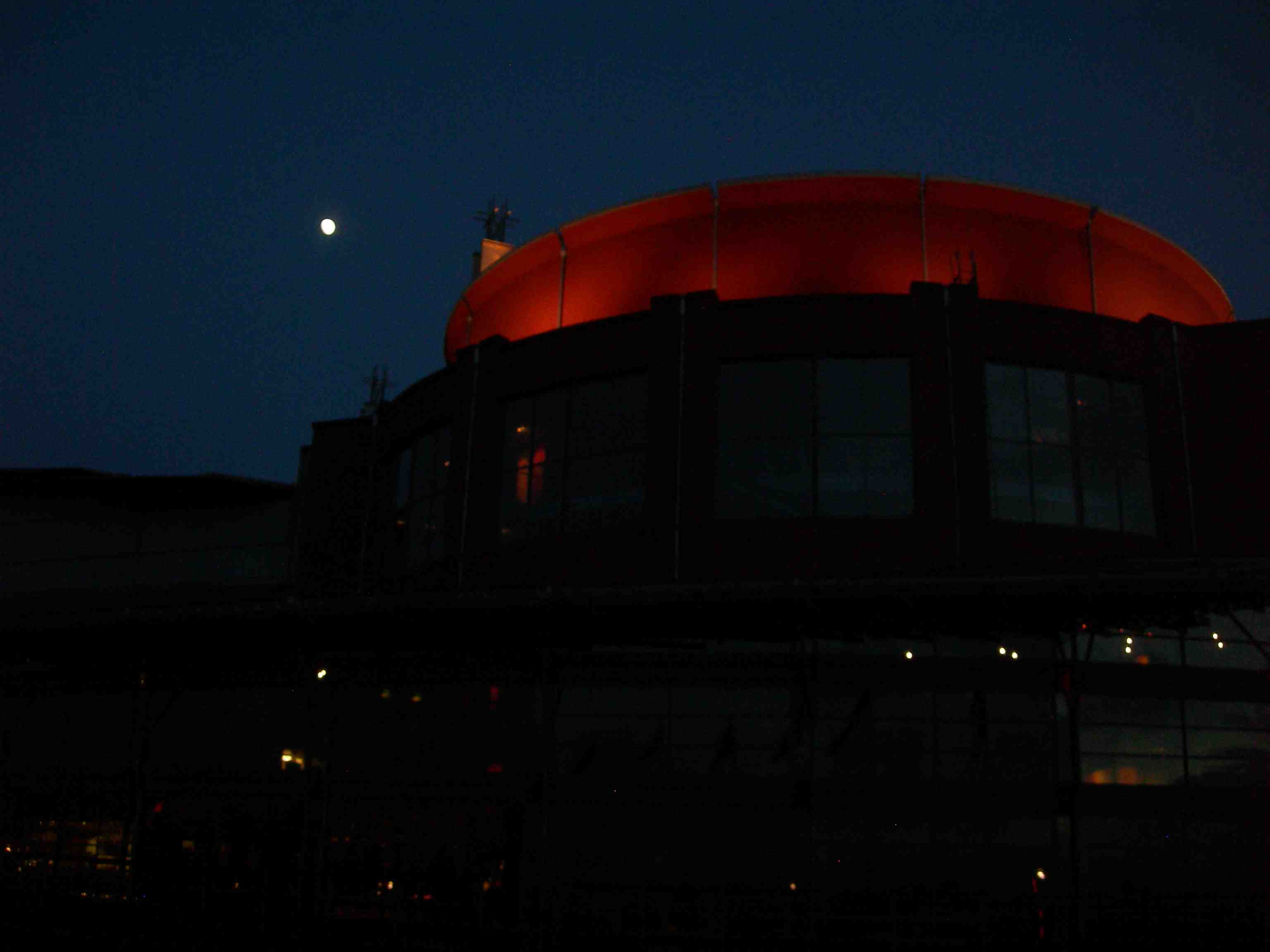 Månen lyser över Operan och bilden från dansföreställningen 33, rue Vandenbranden. GöteborgsOperan lördag 20 april 2013 kl 21.16.