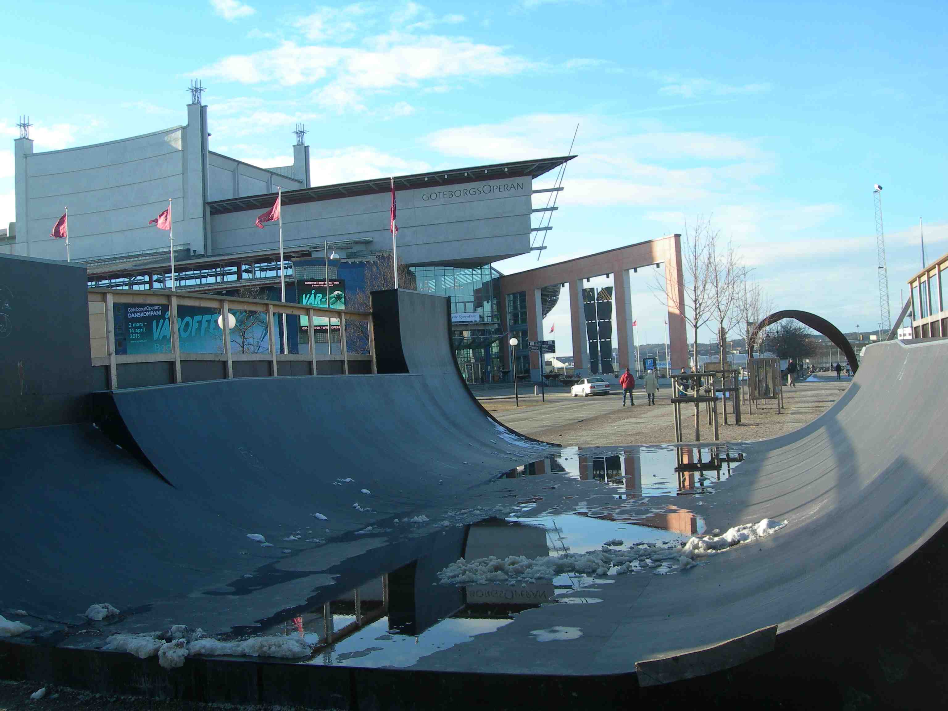 Operan i all sin skateboardrampsspegelglans efter nattens kalla snöfall. Söndag 17 mars 2013 kl 16.12.