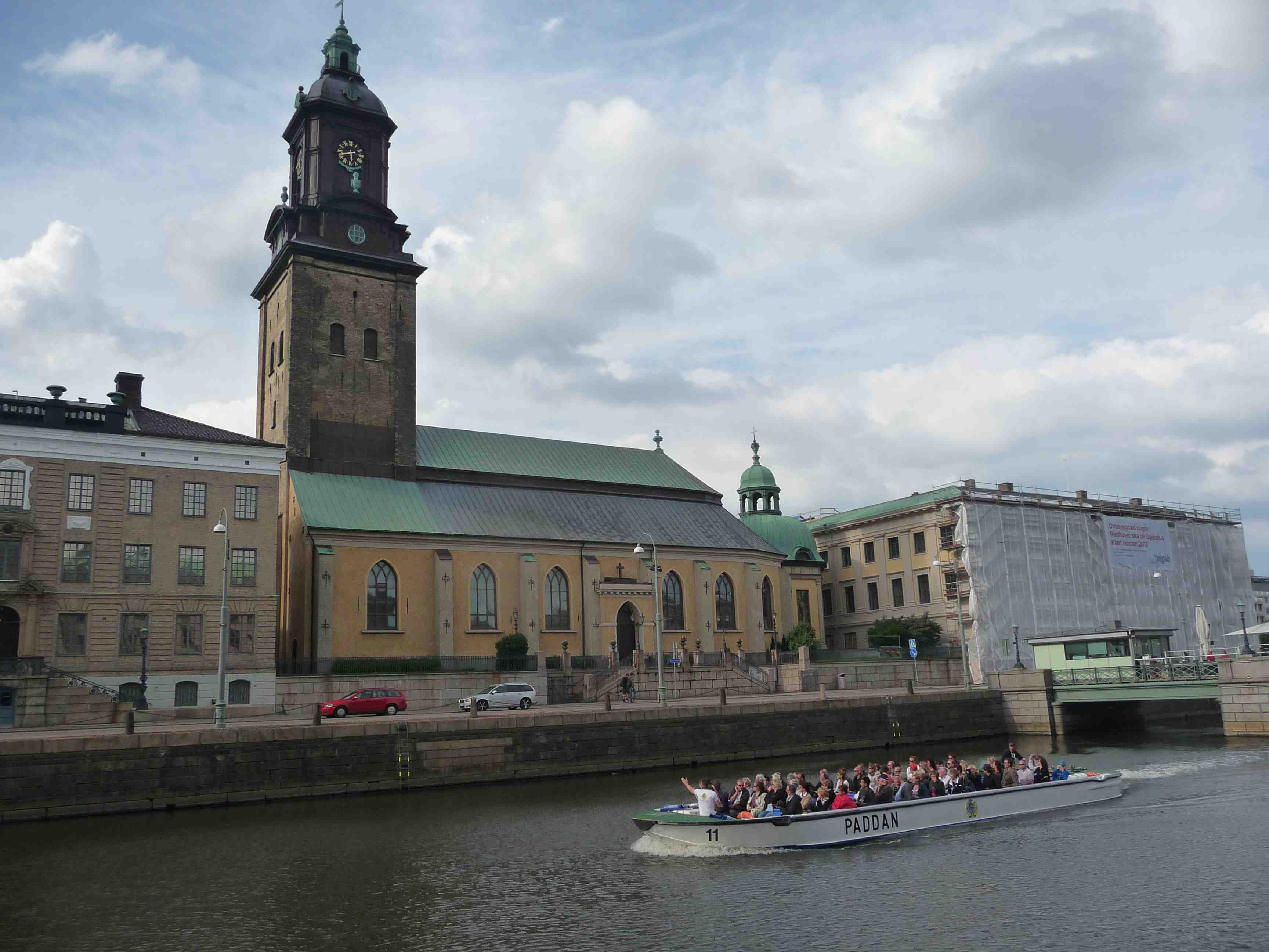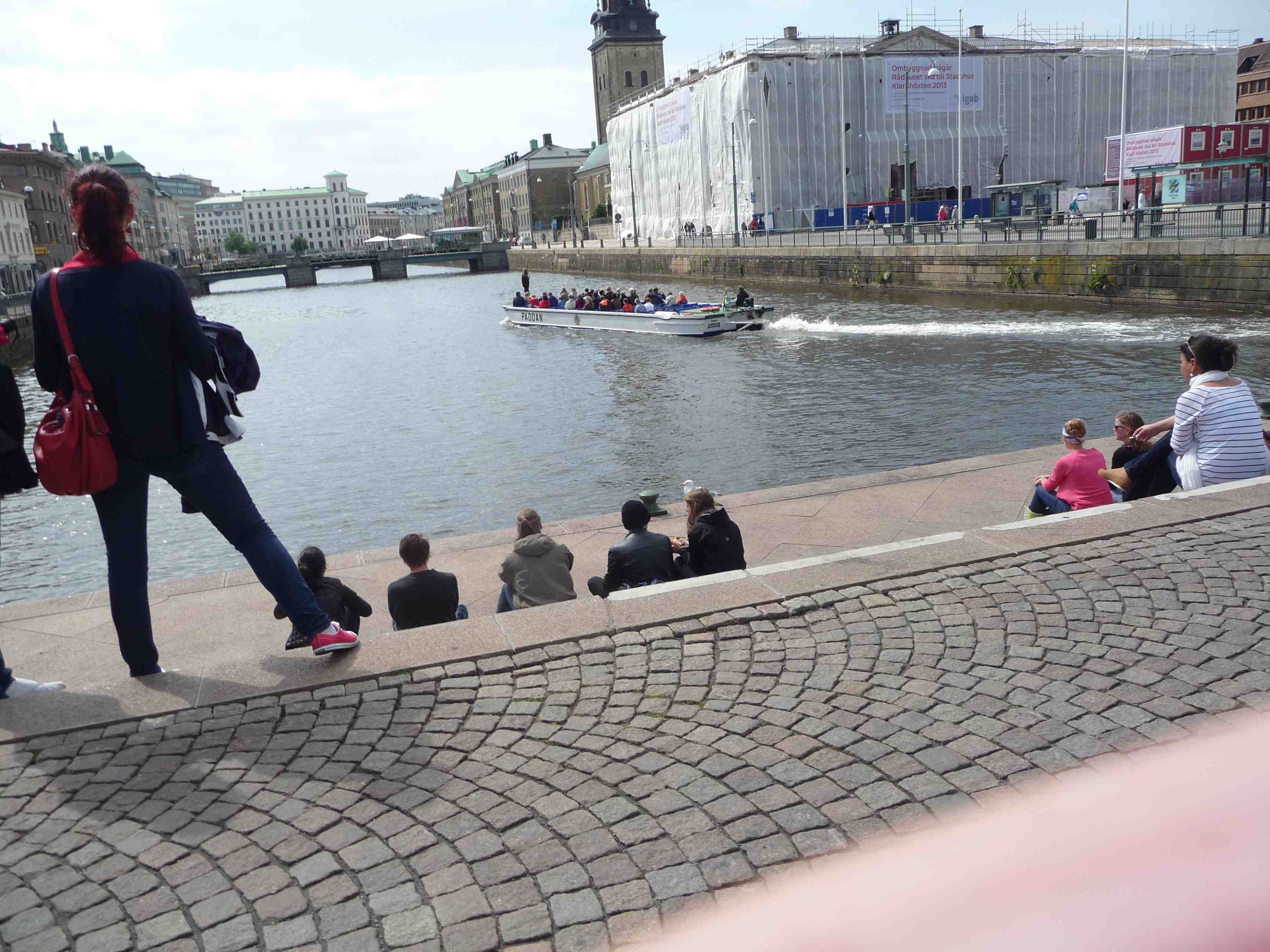 Paddan med guide på fördäck passerar Lejontrappan och Gustaf Adolfs Torg. Torsdag 13 juni 2013 kl 15:13.