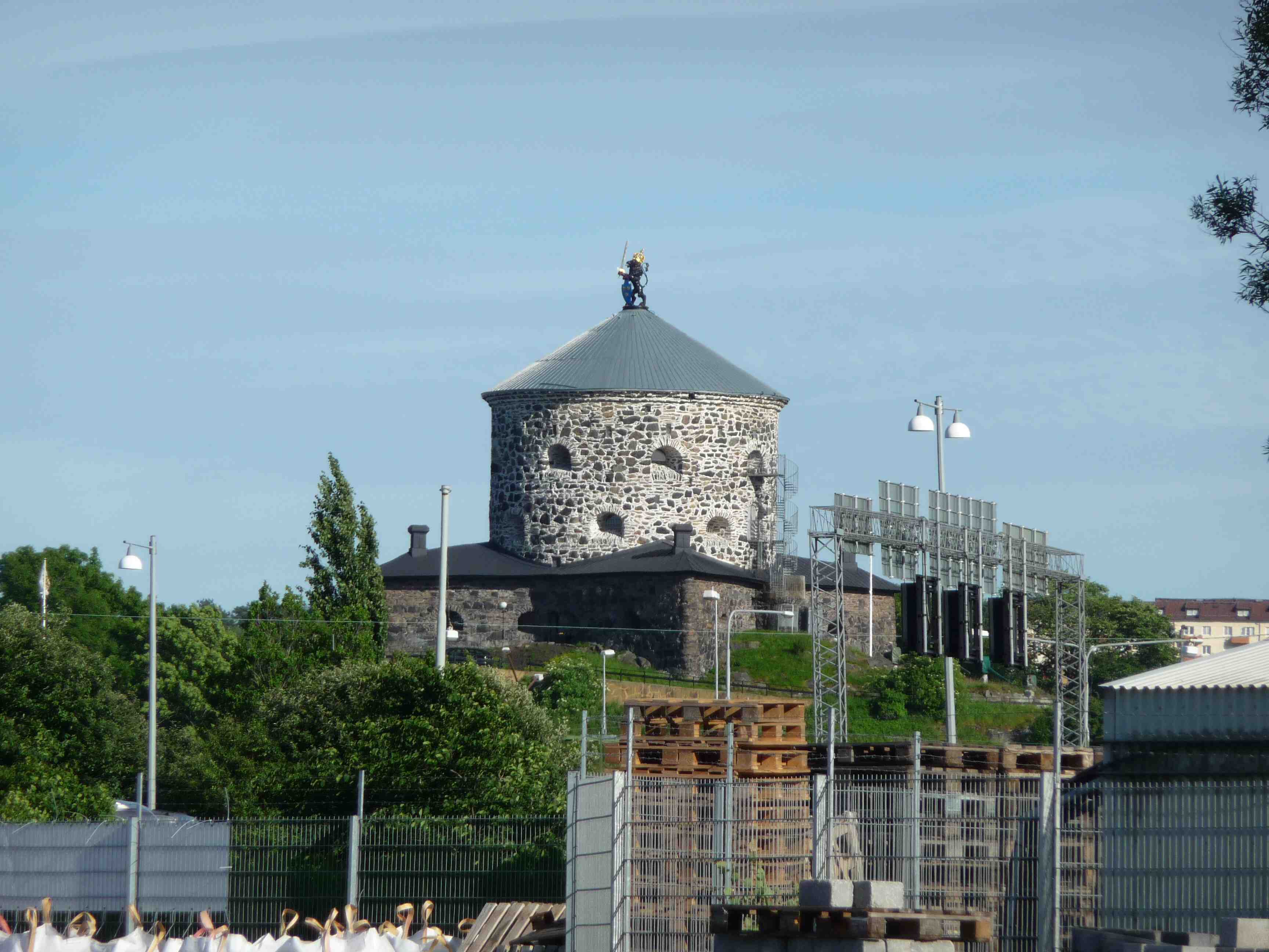 Gasklockan, med fönsterbeklädda huven på kupolen och hisschaktet till höger, sedd från Skansen Lejonet. Tisdag 18 juni 2013 kl 19:28.