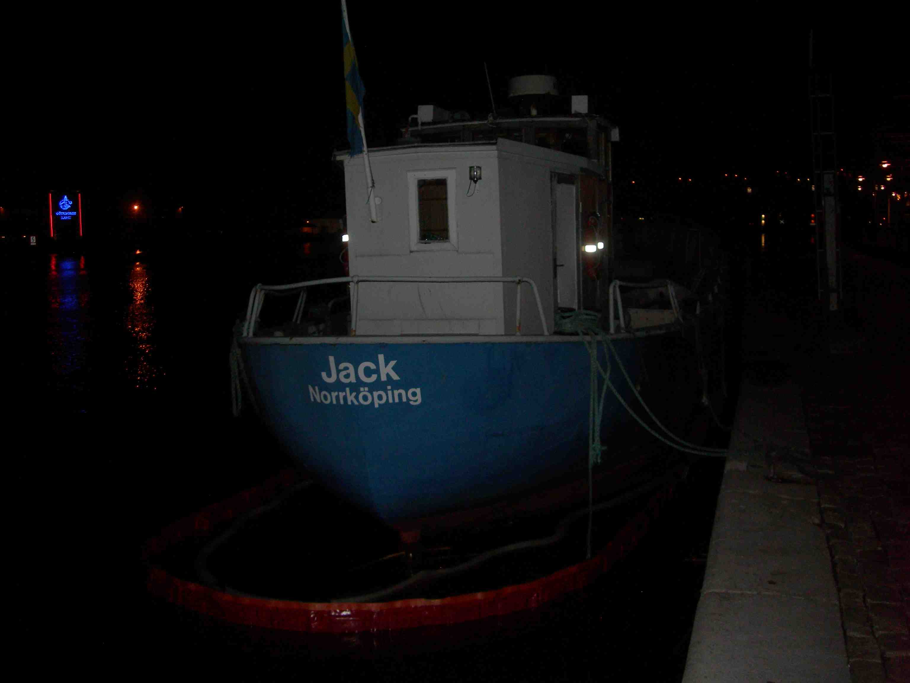 Skutan Jack från Norrköping länsar ensam vid Operakajen med skylten GÖTEBORGS HAMN om babord på andra sidan Götaälv. Kristi himmelsfärds dag torsdag 9 maj 2013 kl 23:47.