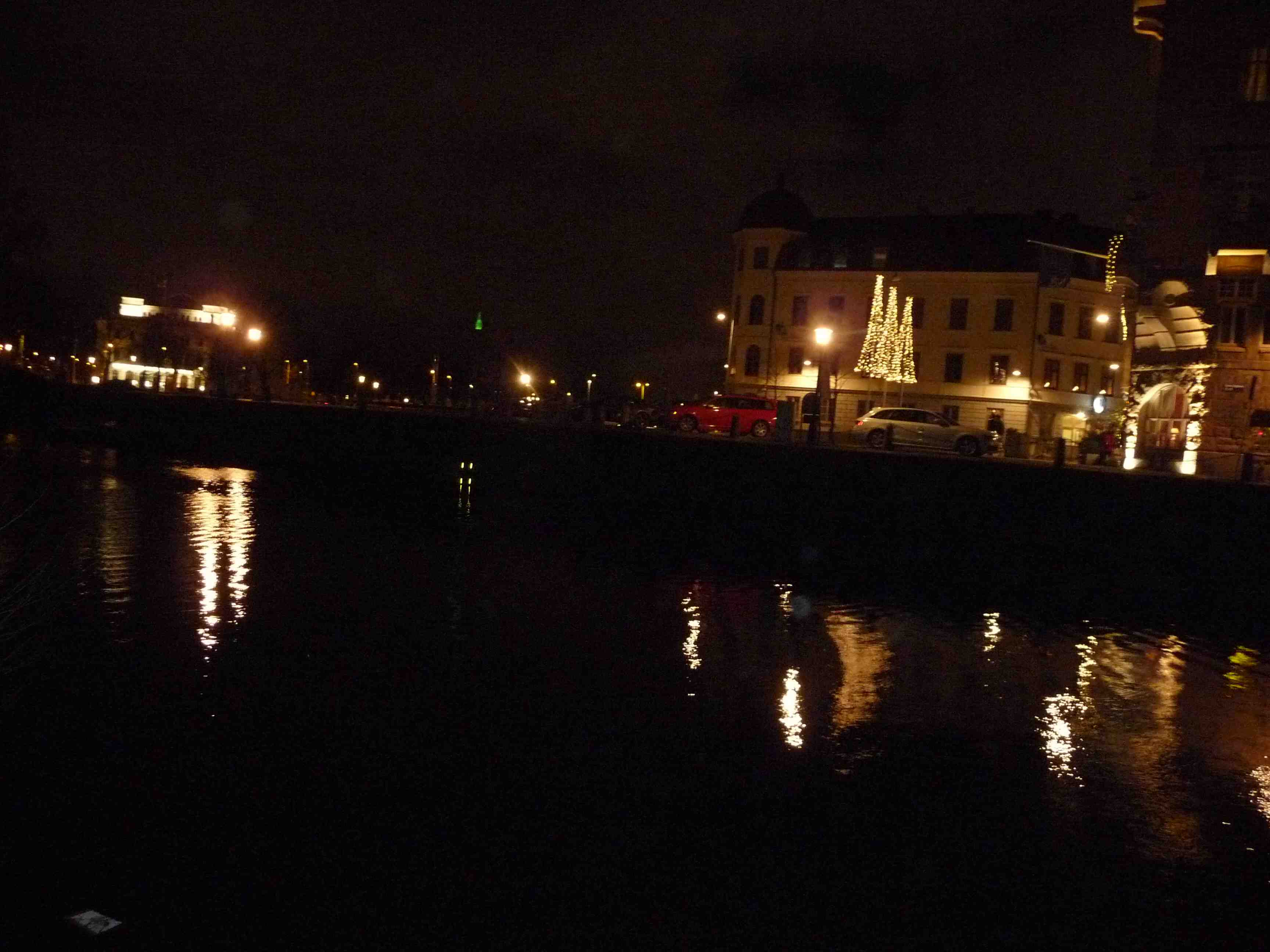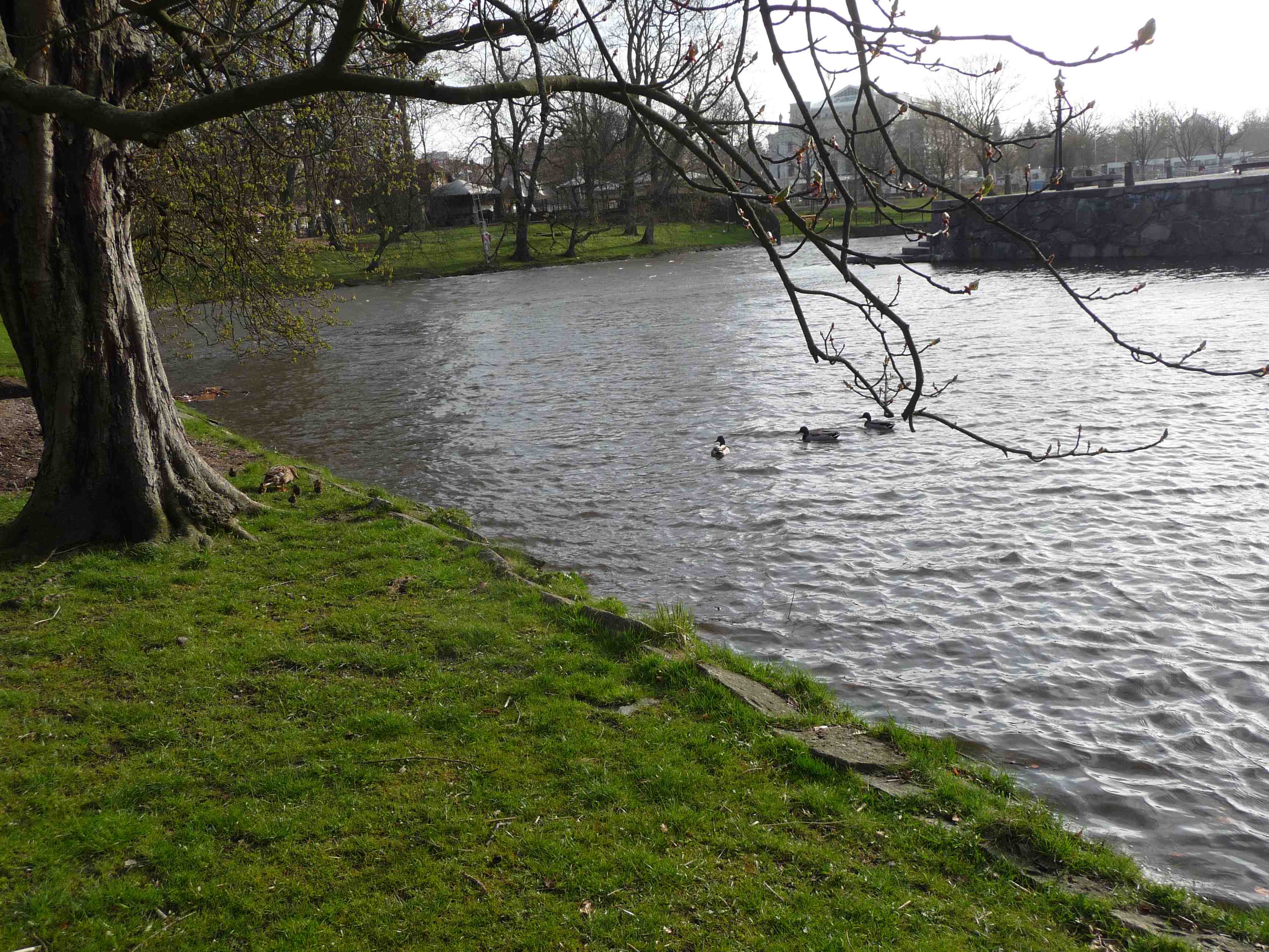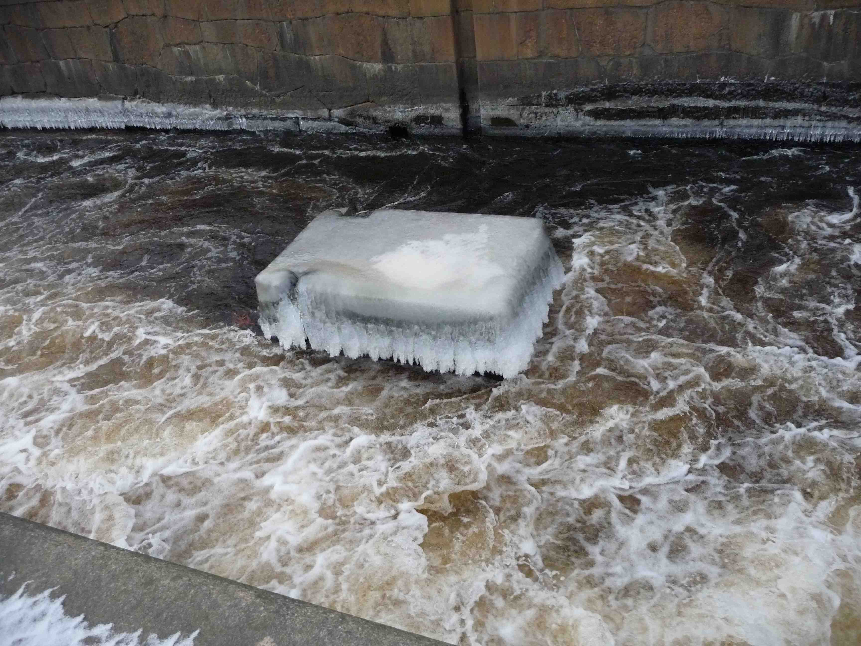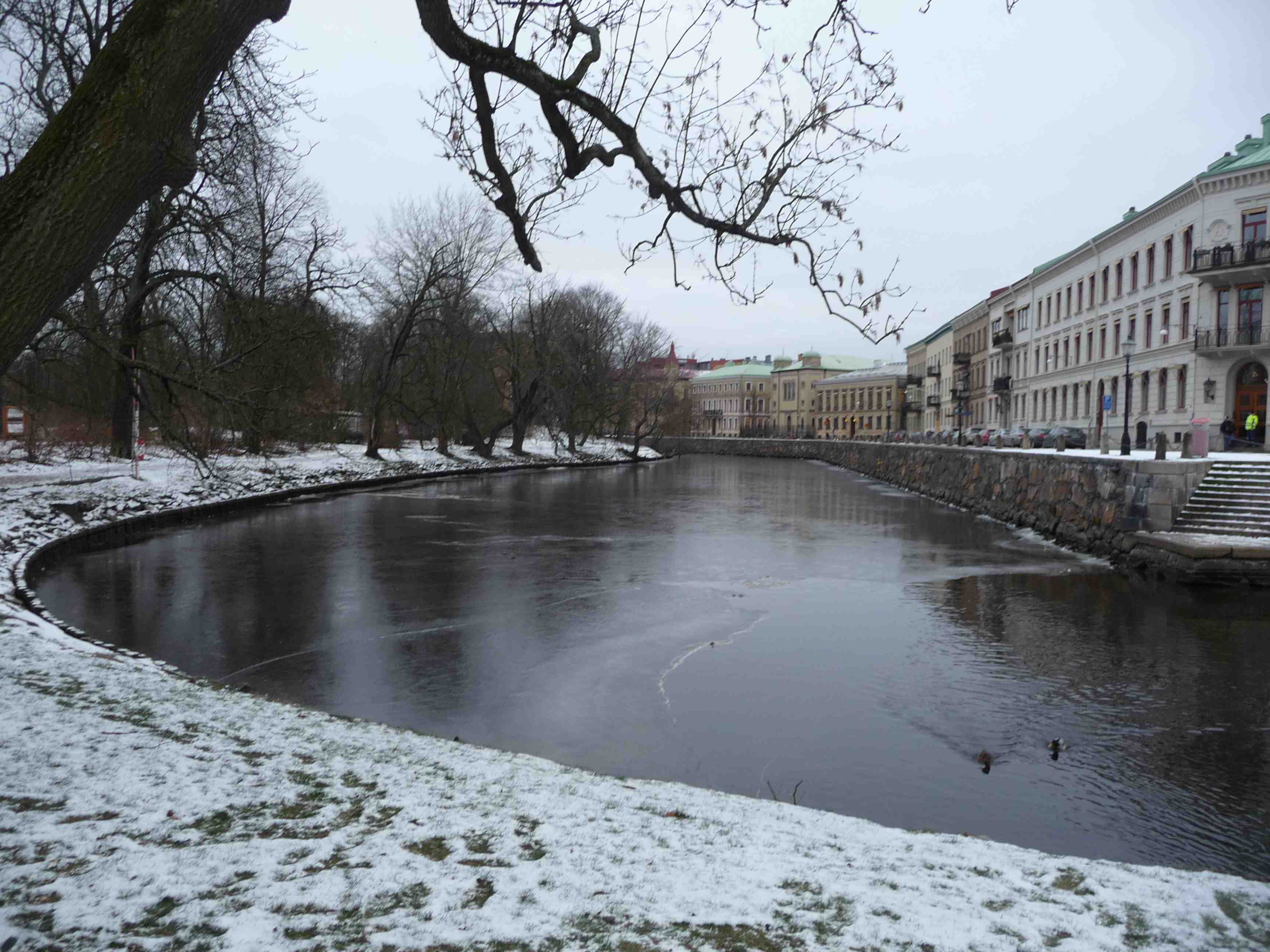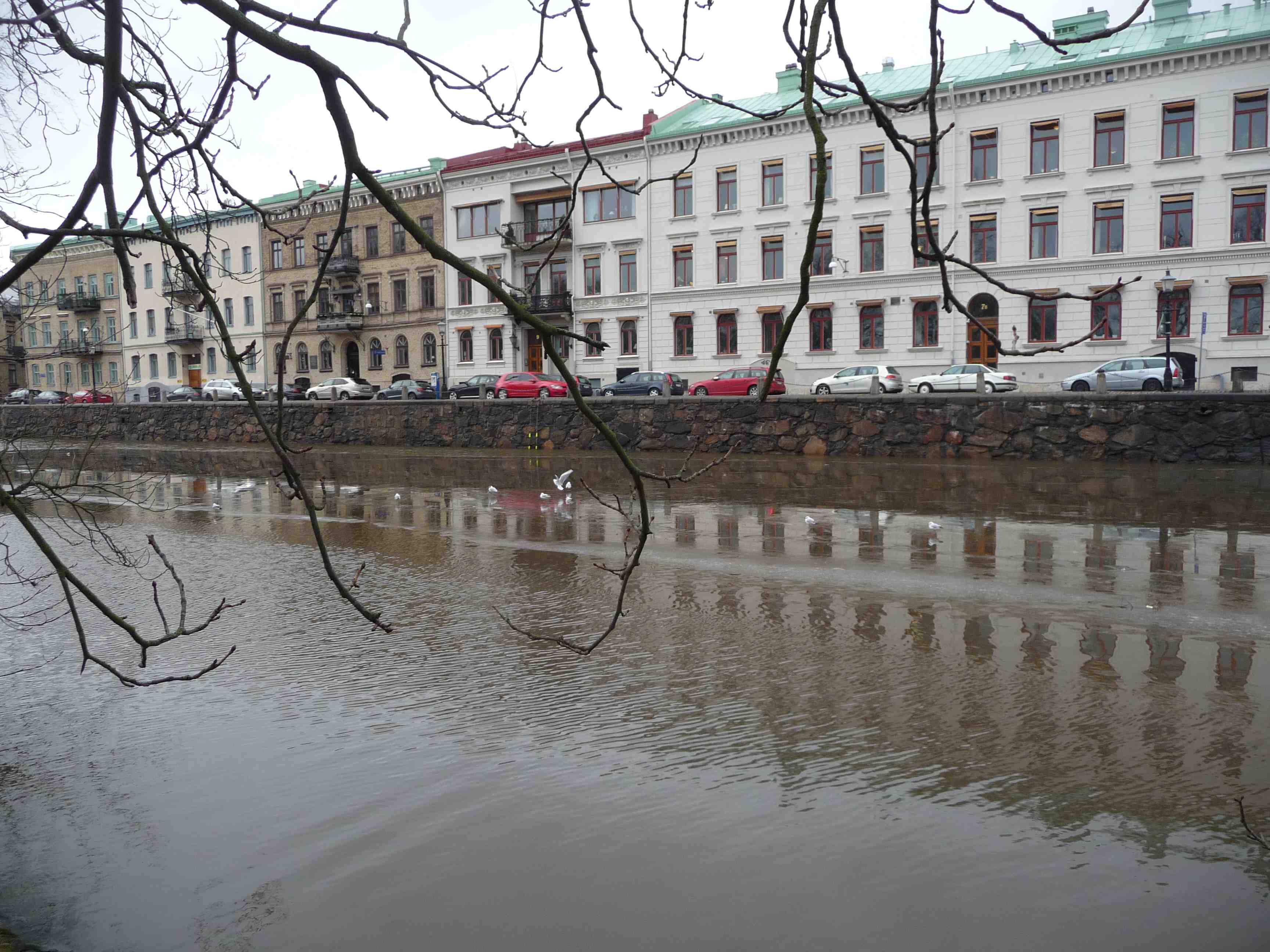 Våren är här med upptinat måleriskt skräp i Vallgraven vid Slussbron. Från Stora Nygatan onsdag 12 mars 2014 kl 17:45.