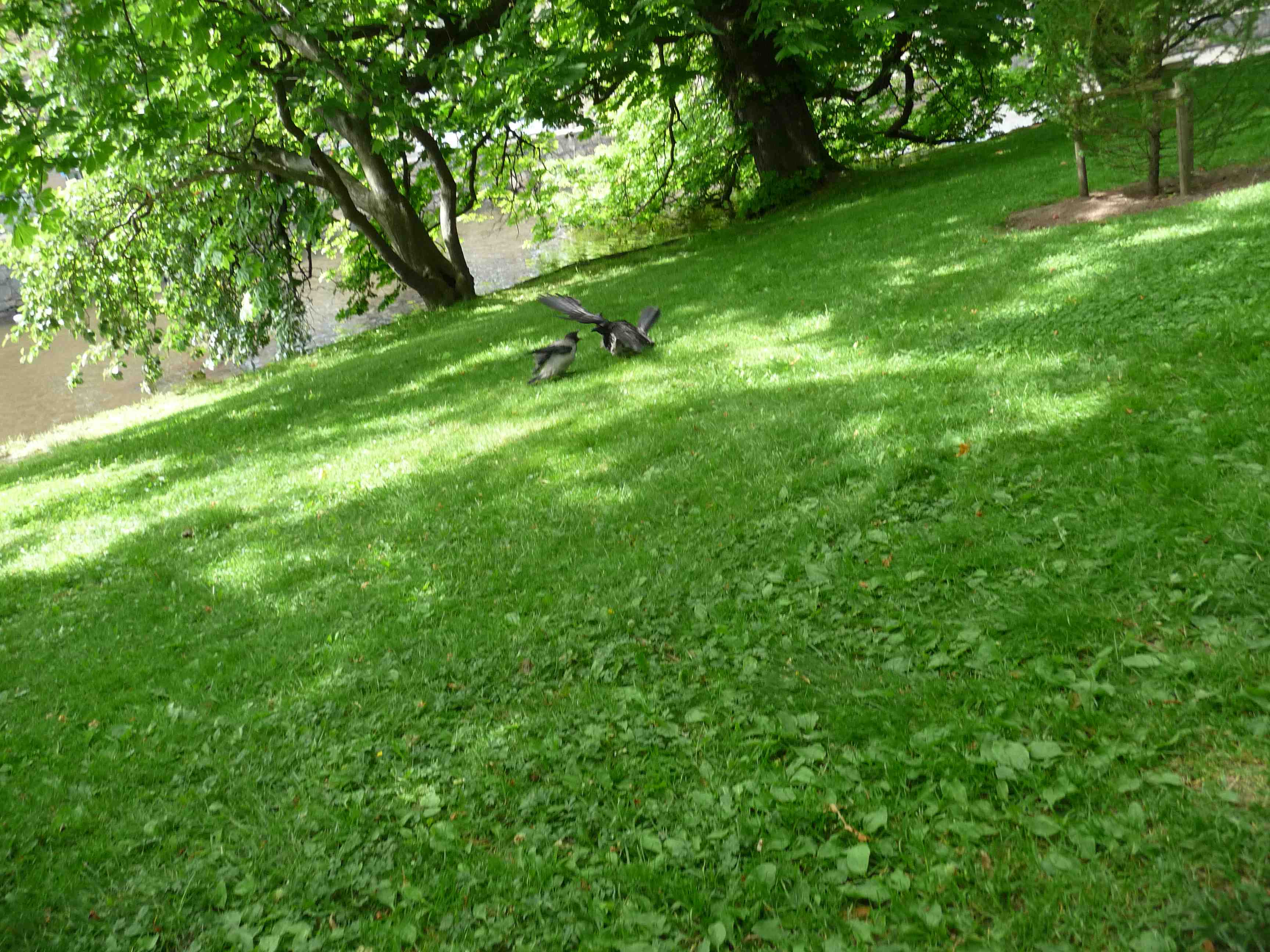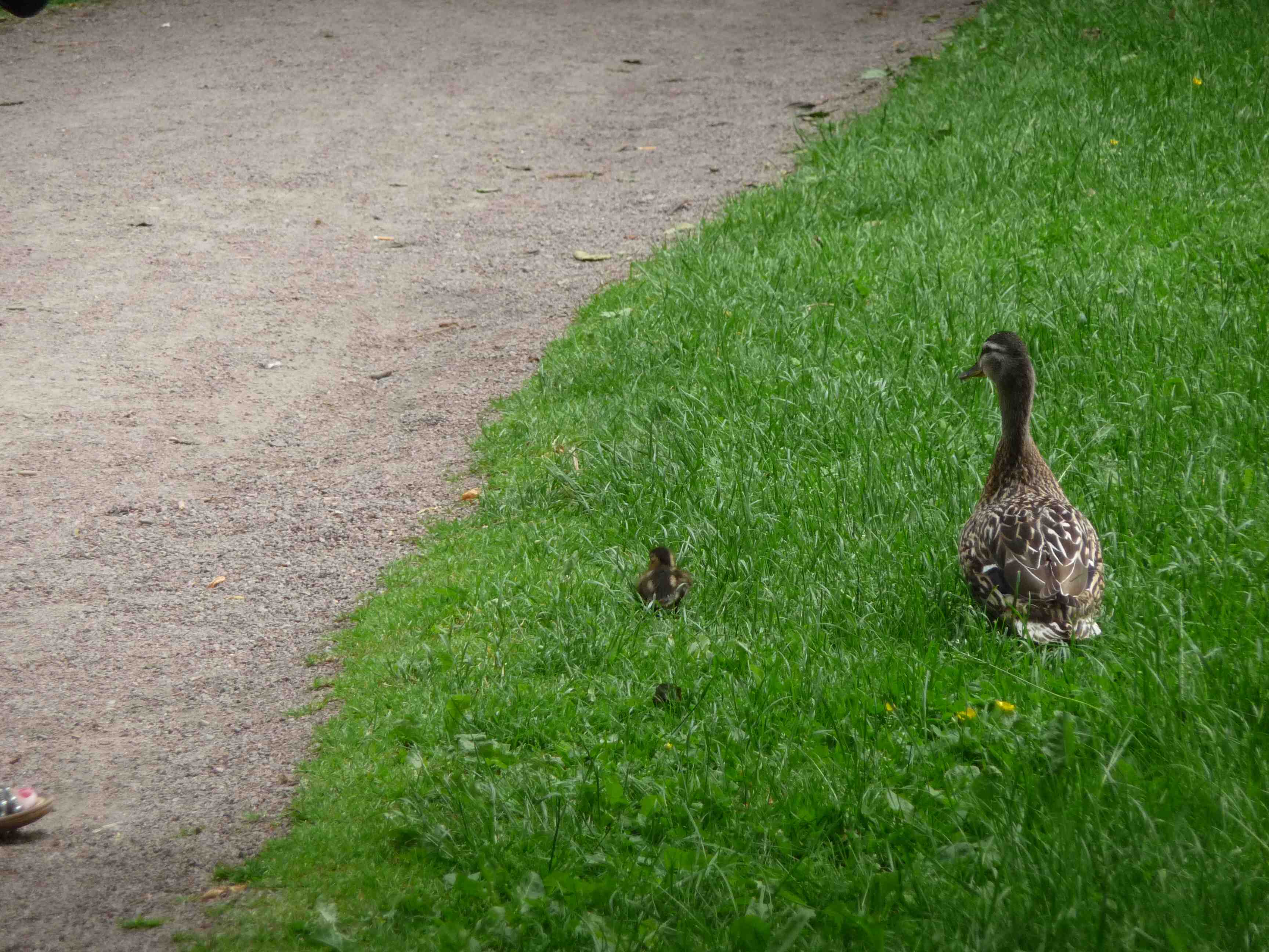 Andmamman håller inte truten utan jagar bort den för att sedan jaga ifatt sin lilla unge. Det gick bra den här gången också. Sens moral: Människor ska inte mata andungar och måsar samtidigt. Trädgårdsföreningen tisdag 24 juni 2014 kl 15:46.