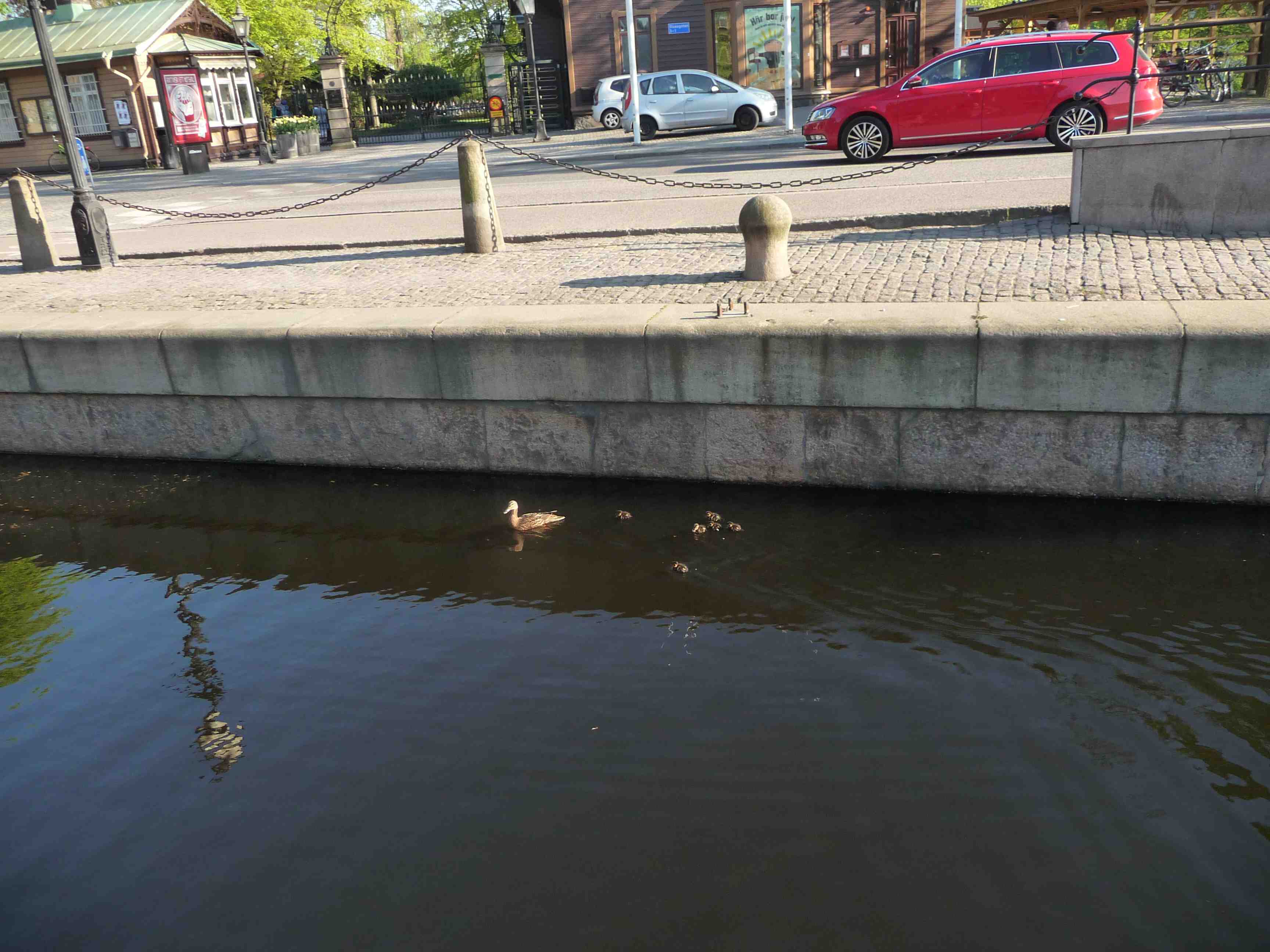 Dramatik i djurvärlden! Andmamma och sex ungar fångar i Slussen mellan Drottningtorget och Trädgårdsföreningen. Räddades av tjej med Djurambulansen vid 21:30-tiden. Efter att förgäves ha letat efter en planka ringde jag efter kl 18 till 112 som inte ville koppla mig till Räddningstjänsten men väl till Polisen som inget kunde göra. Tidningen Metro hade stängt, men en hjälpsam dam på GT/Expressen i Stockholm (!) kollade på Nätet och gav mig numret till Fågelcentralen i Kungälv där en vänlig kvinna svarade att jag skulle återkomma dit i morgon om änderna är kvar i sin fångenskap eller om dom släppts ut av en passerande Paddan. Måndag 28 april 2014 kl 18:03.
