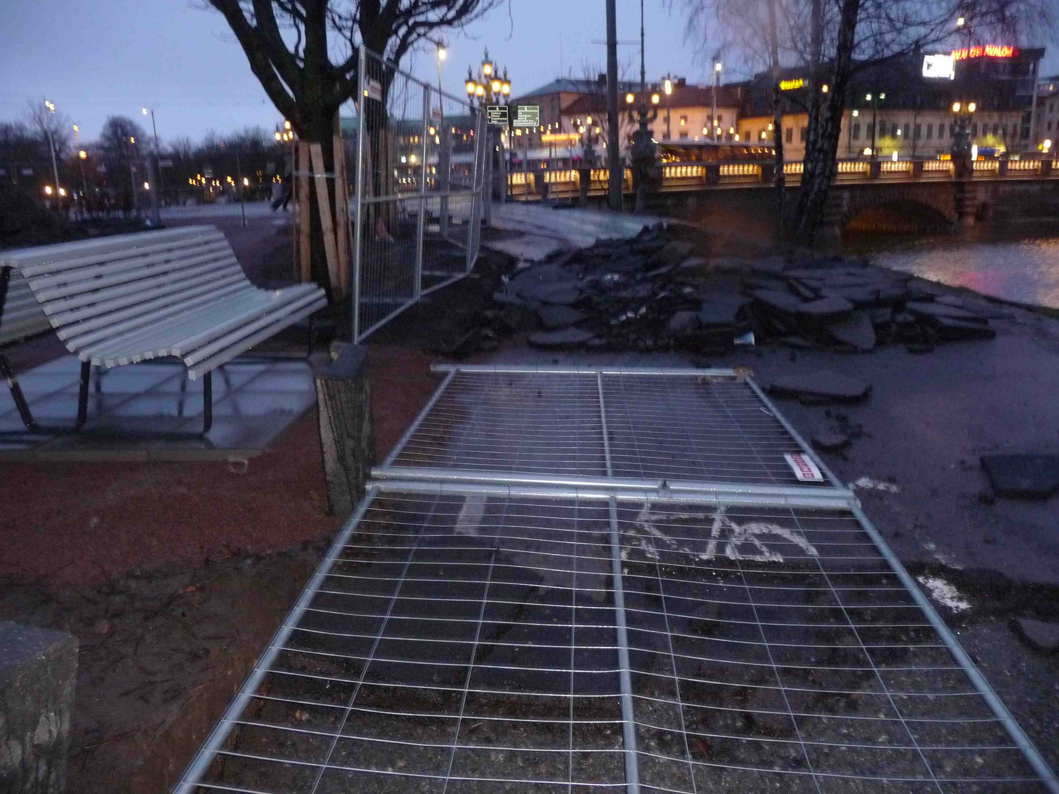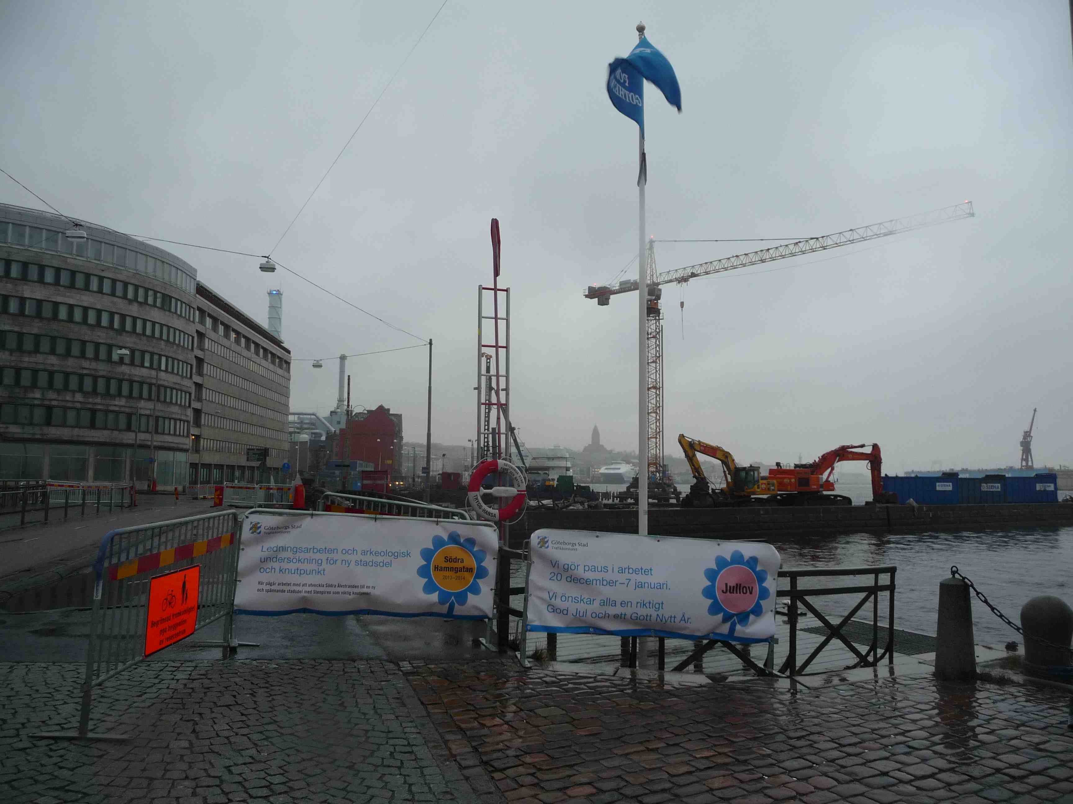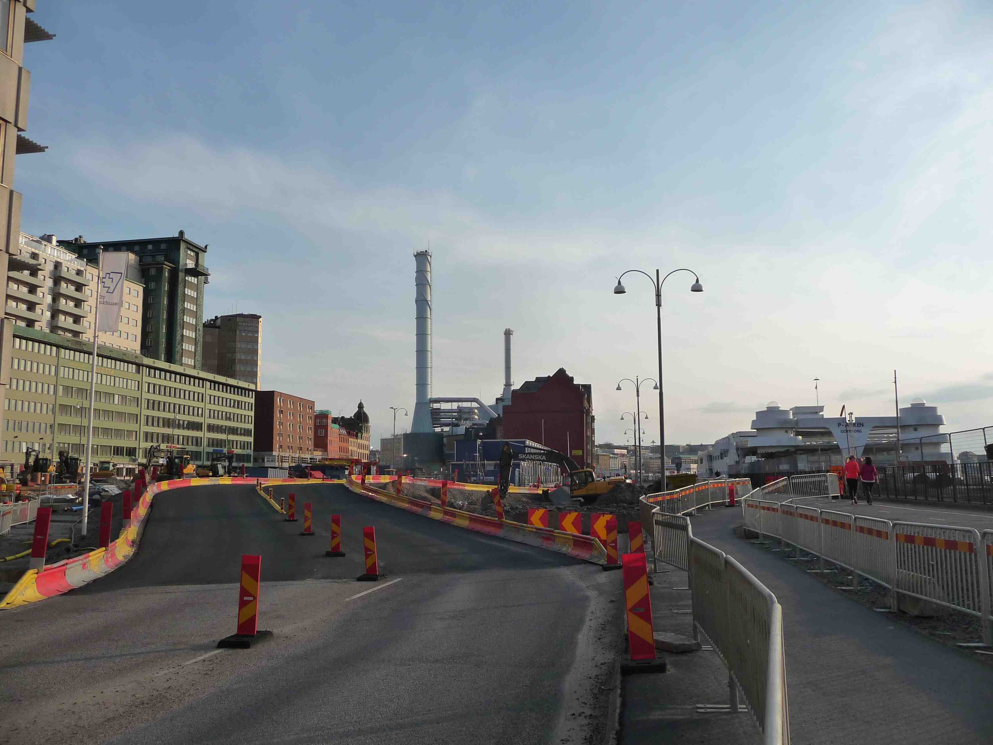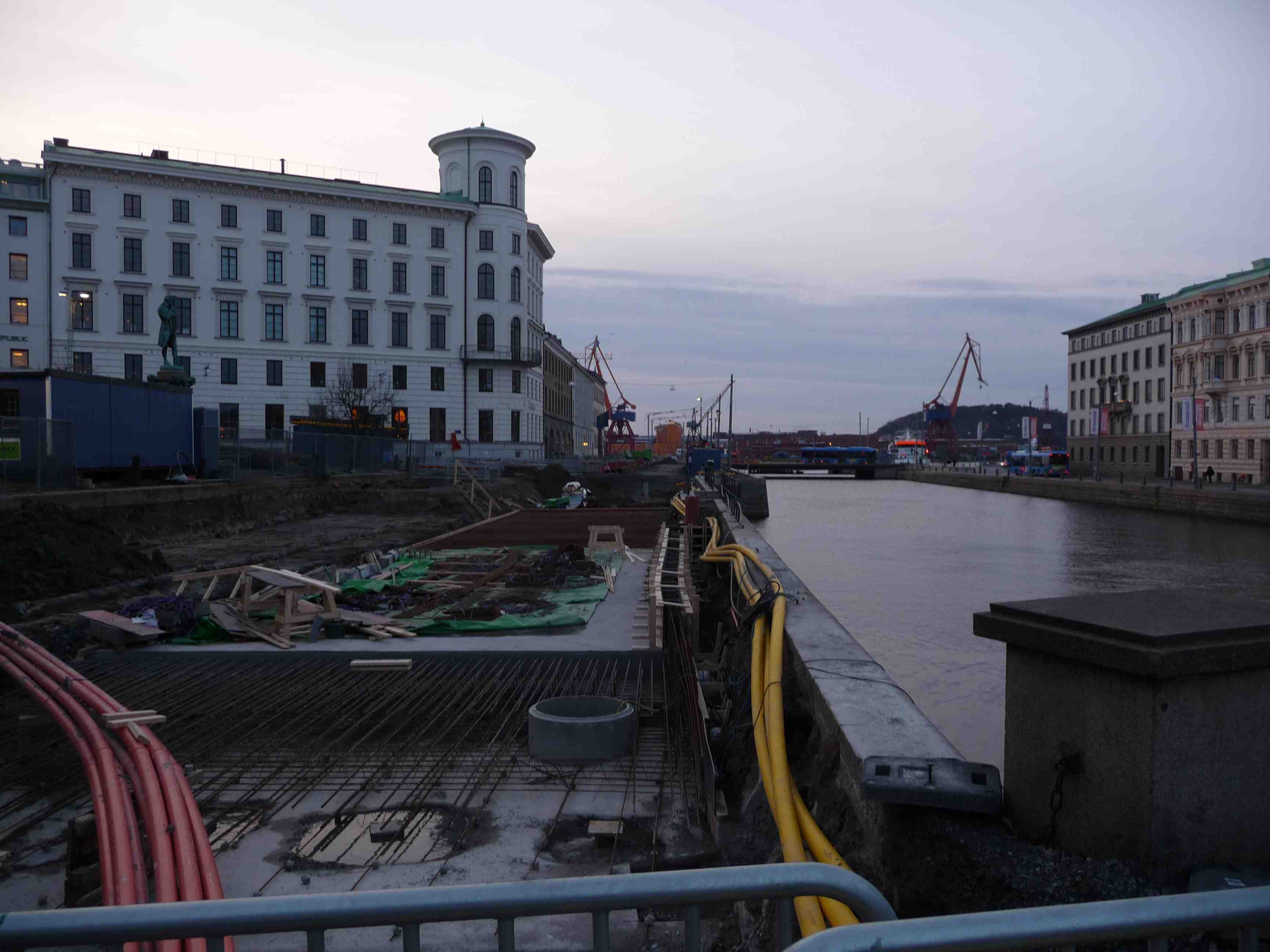I väntan på nya spårvägen till Stora Badhusgatan och Järntorget har en provisorisk vägbana lagts vid Skeppsbron över det som en gång var Keillers Verkstad och som sedan blev Götaverken på Hisingen tvärs över Göta älv. Måndag Annandag påsk 21 april 2014 kl 18:52.