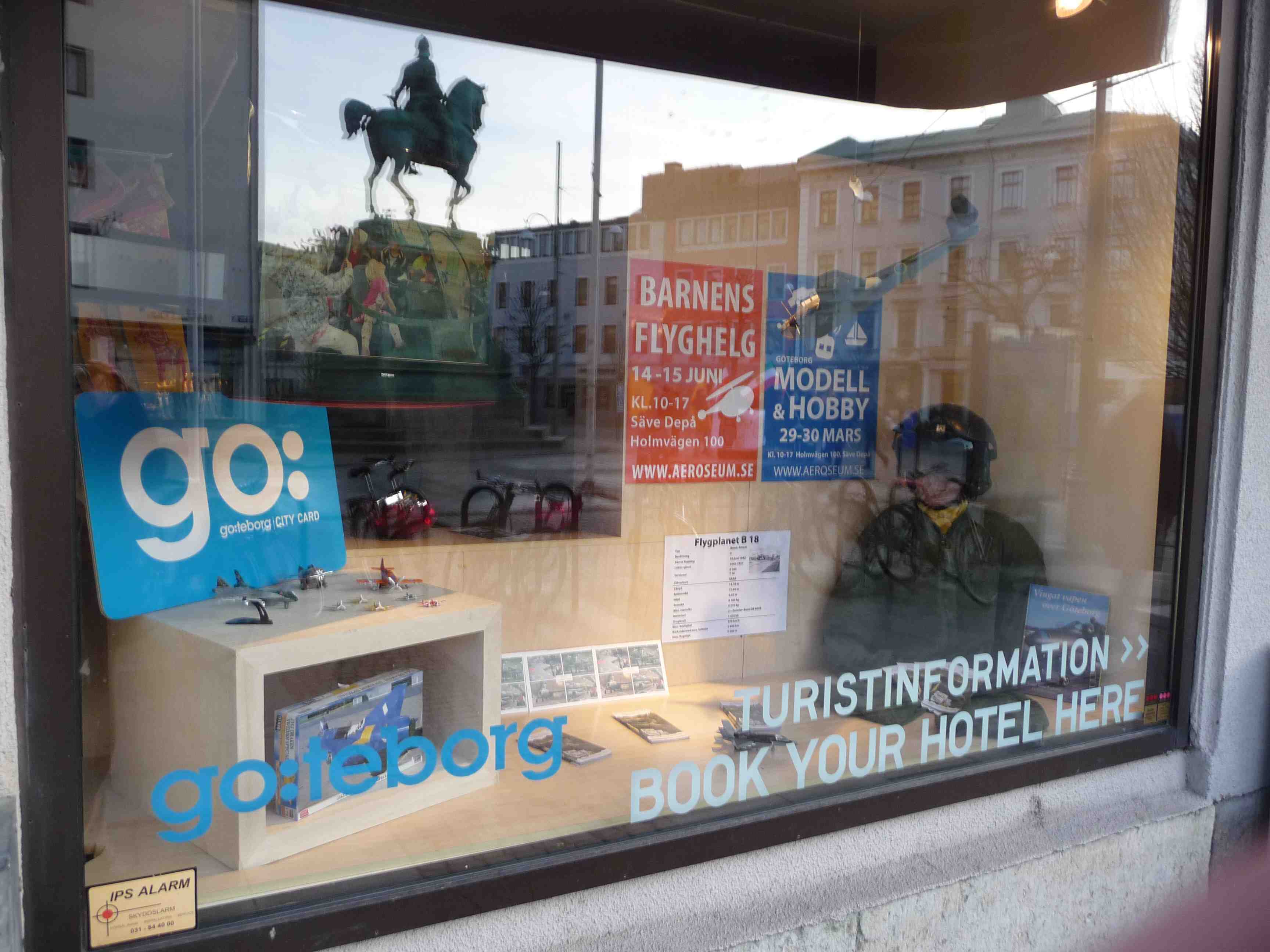 Barnens Flyghelg i Göteborgs Turistbyrås skyltfönster med Kopparmärras spegelbild. Kungsportsplatsen måndag 10 mars 2014 kl 17:42.