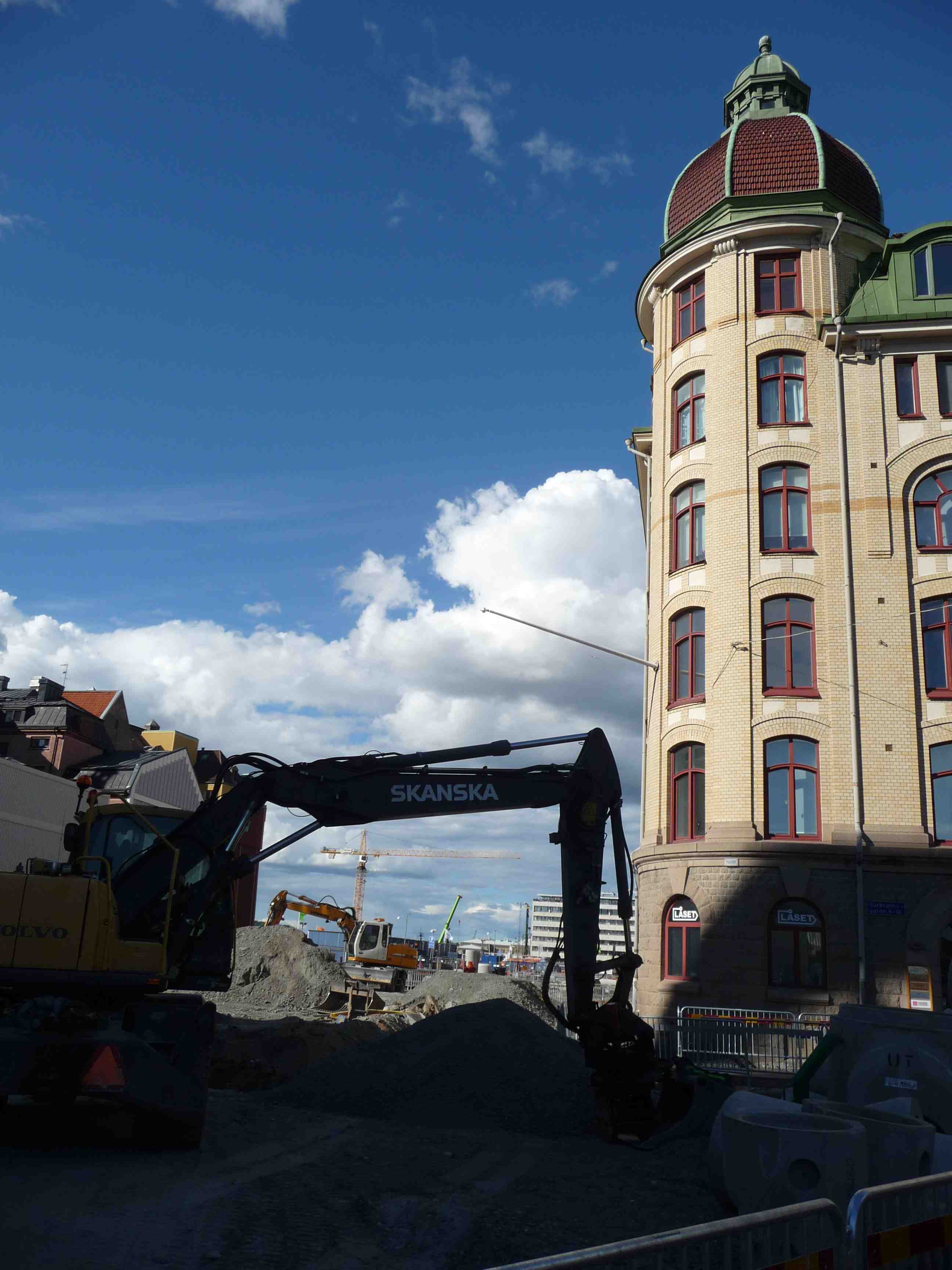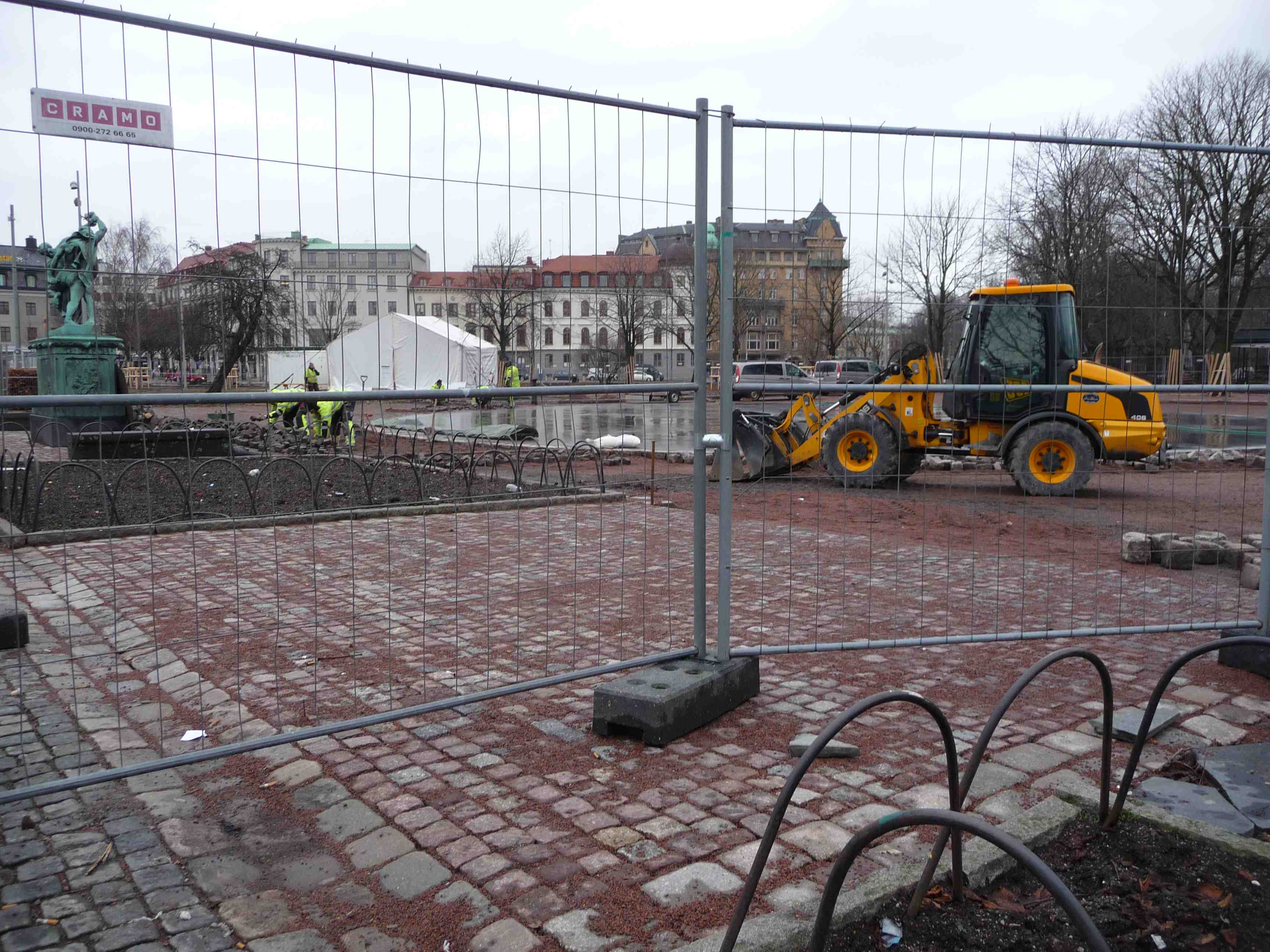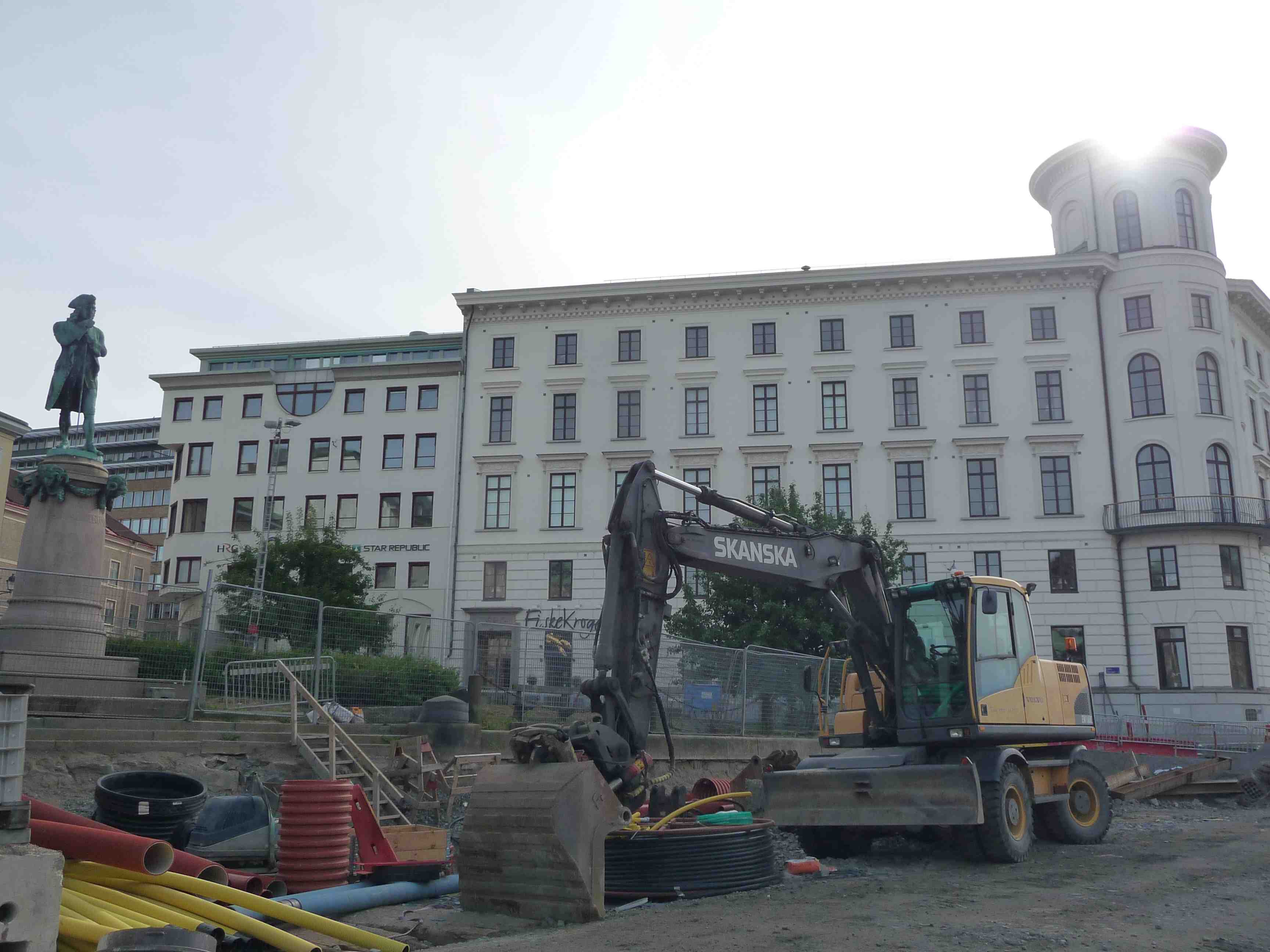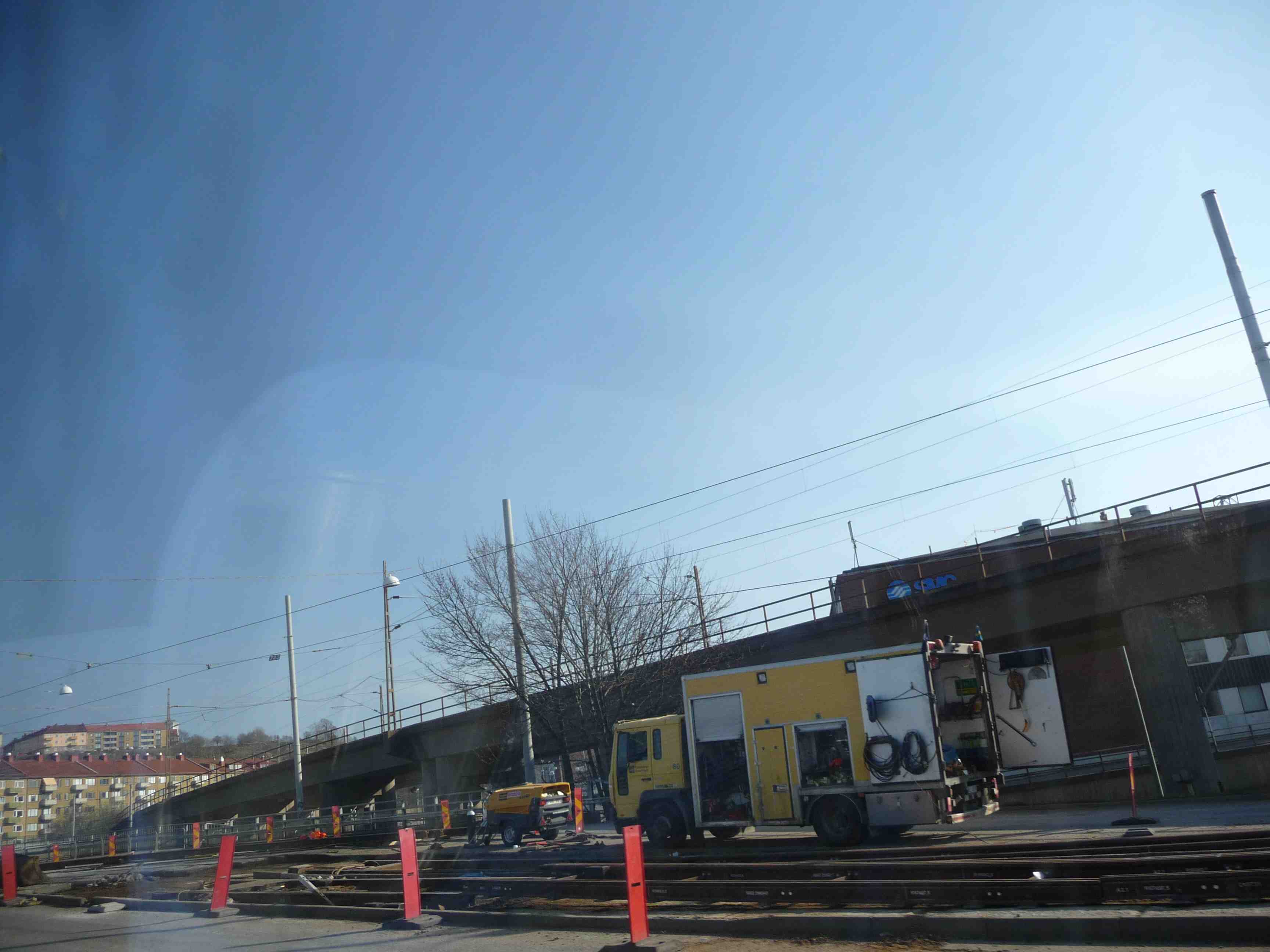 Residensgropen på Södra Hamngatan utanför landshövdingens arbetsplats: Mycket väsen för lite spårvagnsräls. Torsdag 27 mars 2014 kl 14:14.
