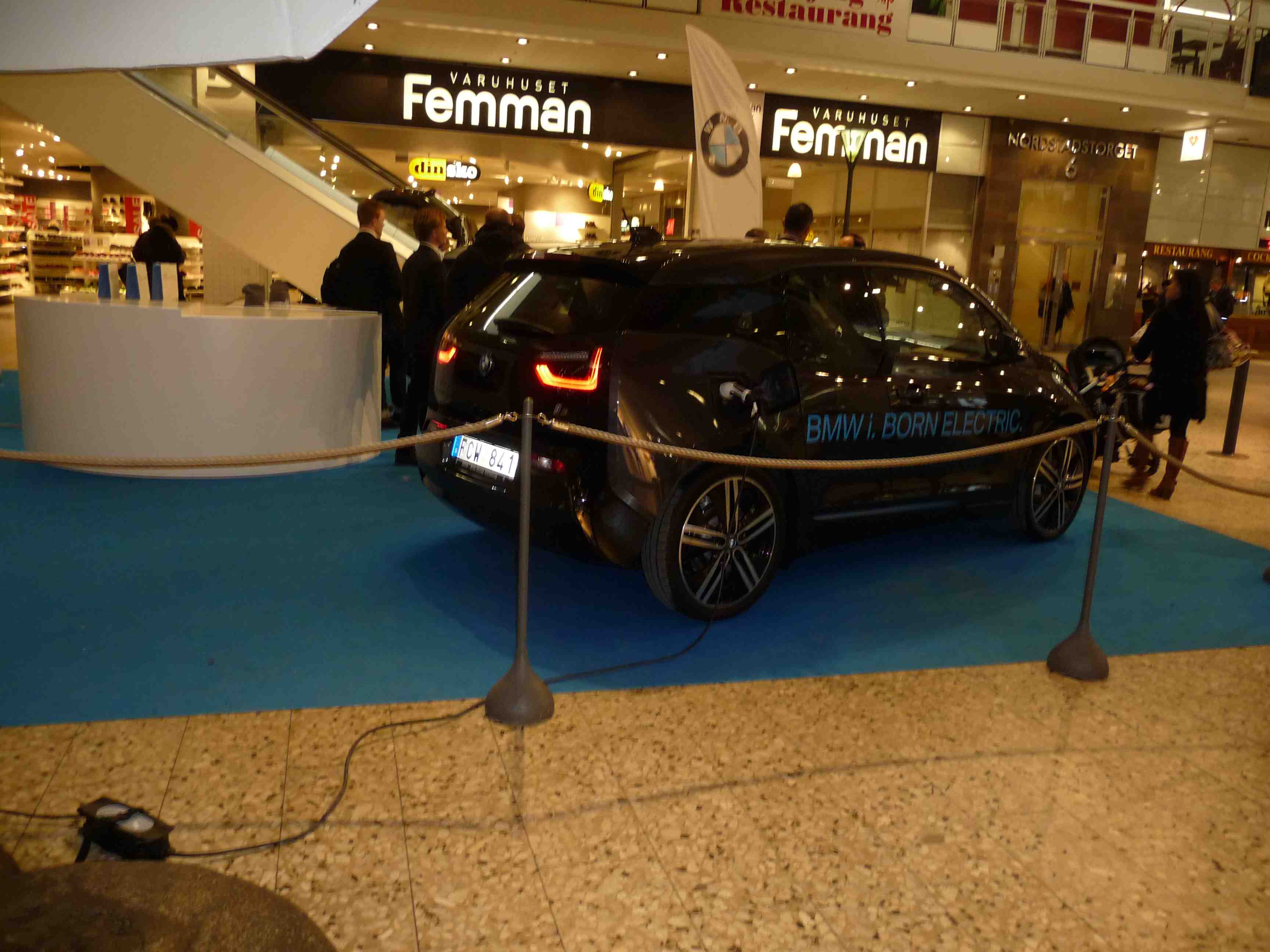 BMW i3 Electric demonstreras i Nordstan. Äntligen riktig bil från BMW, frånsett att den bara går 16 mil på en laddning istället för åtminstone 40, som Tesla. Tisdag 28 januari 2014 kl 16:01.