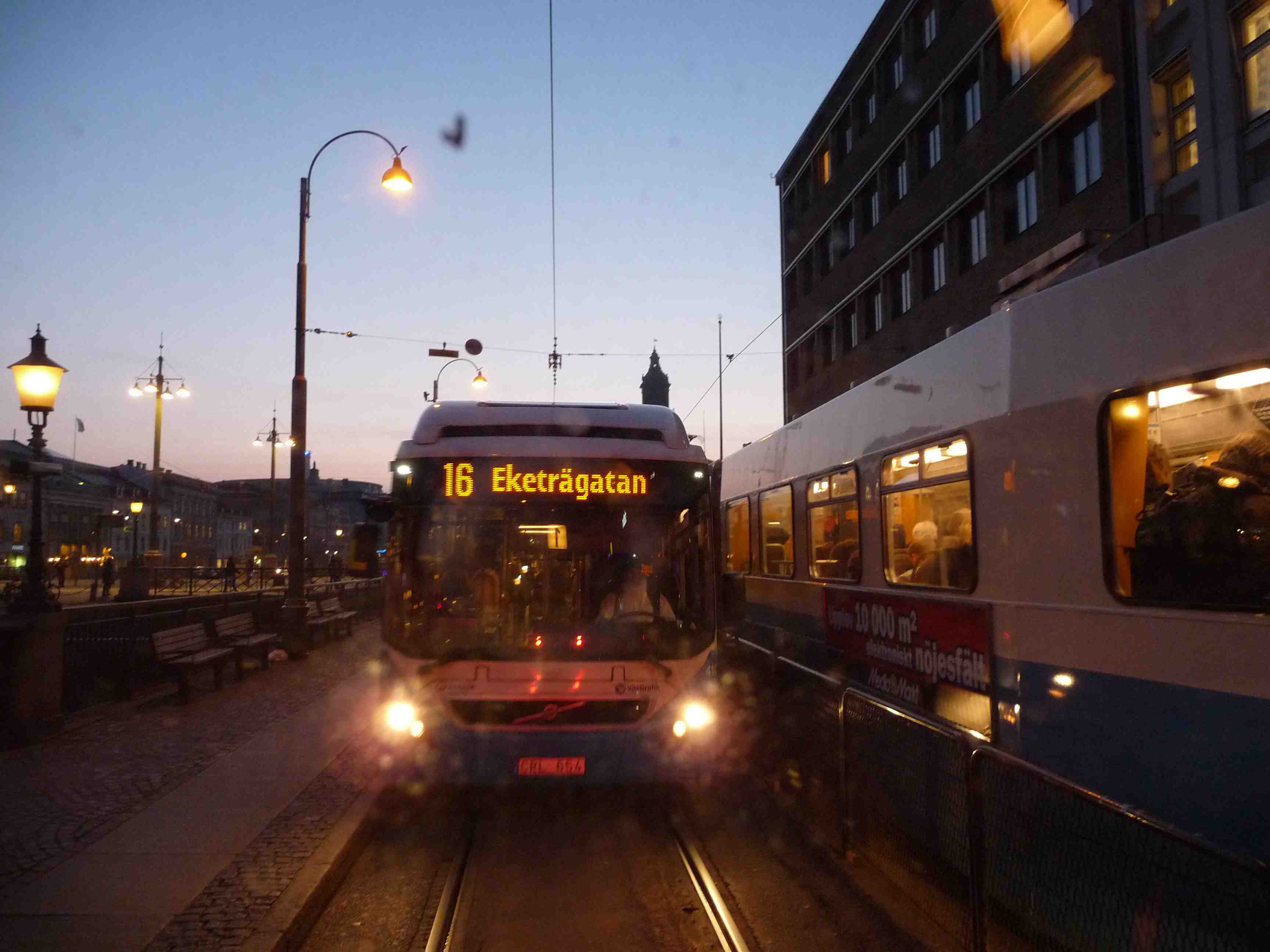 Volvo elektrisk laddhybridbuss 397 på Linje 60. Hörnet Södra Hamngatan–Stora Nygatan onsdag 19 mars 2014 kl 18:00.