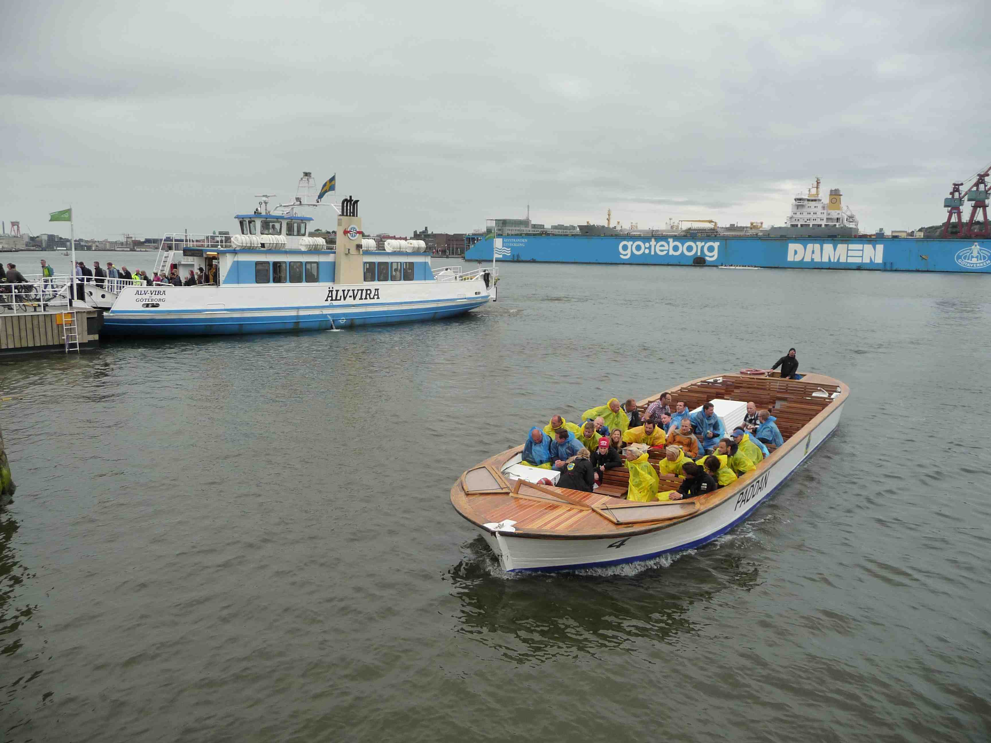 Gamla kära Paddan 4, byggd i Sjötorp 1947, ska strax gå under Yttre Järnvågsbron. Älv-Vira ligger vid Rosenlunds brygga och M/T Ek-Sky, byggd i Shanghai 1999, ligger i Götaverkens docka. Tisdag 3 juni 2014 kl 16:47.