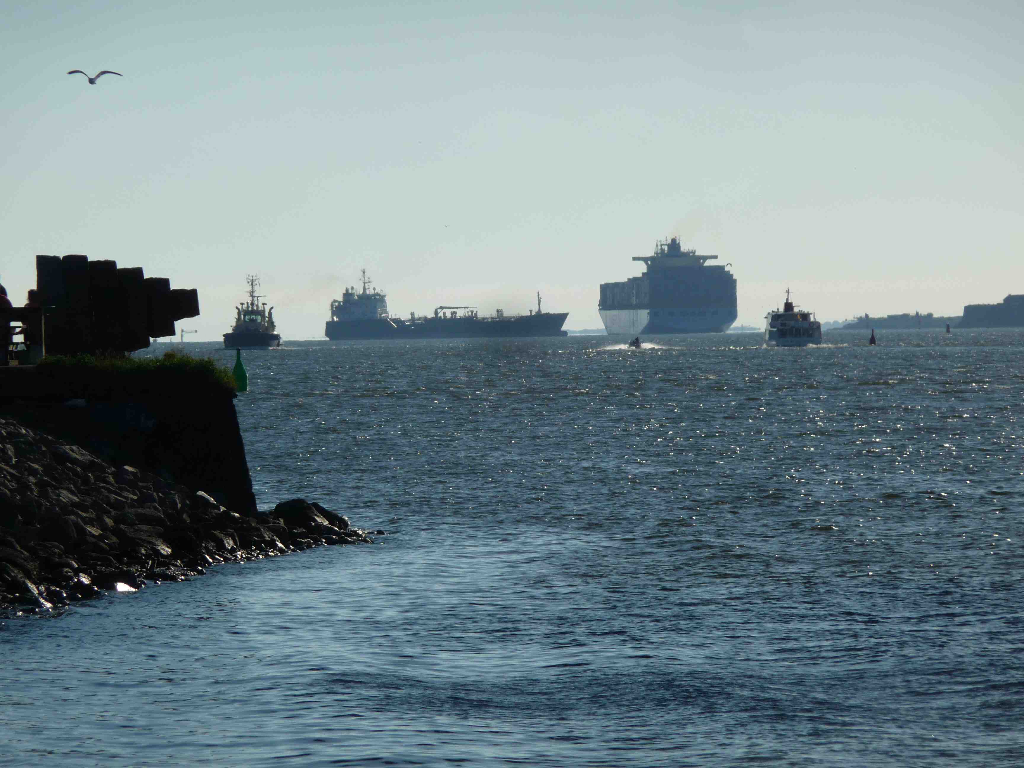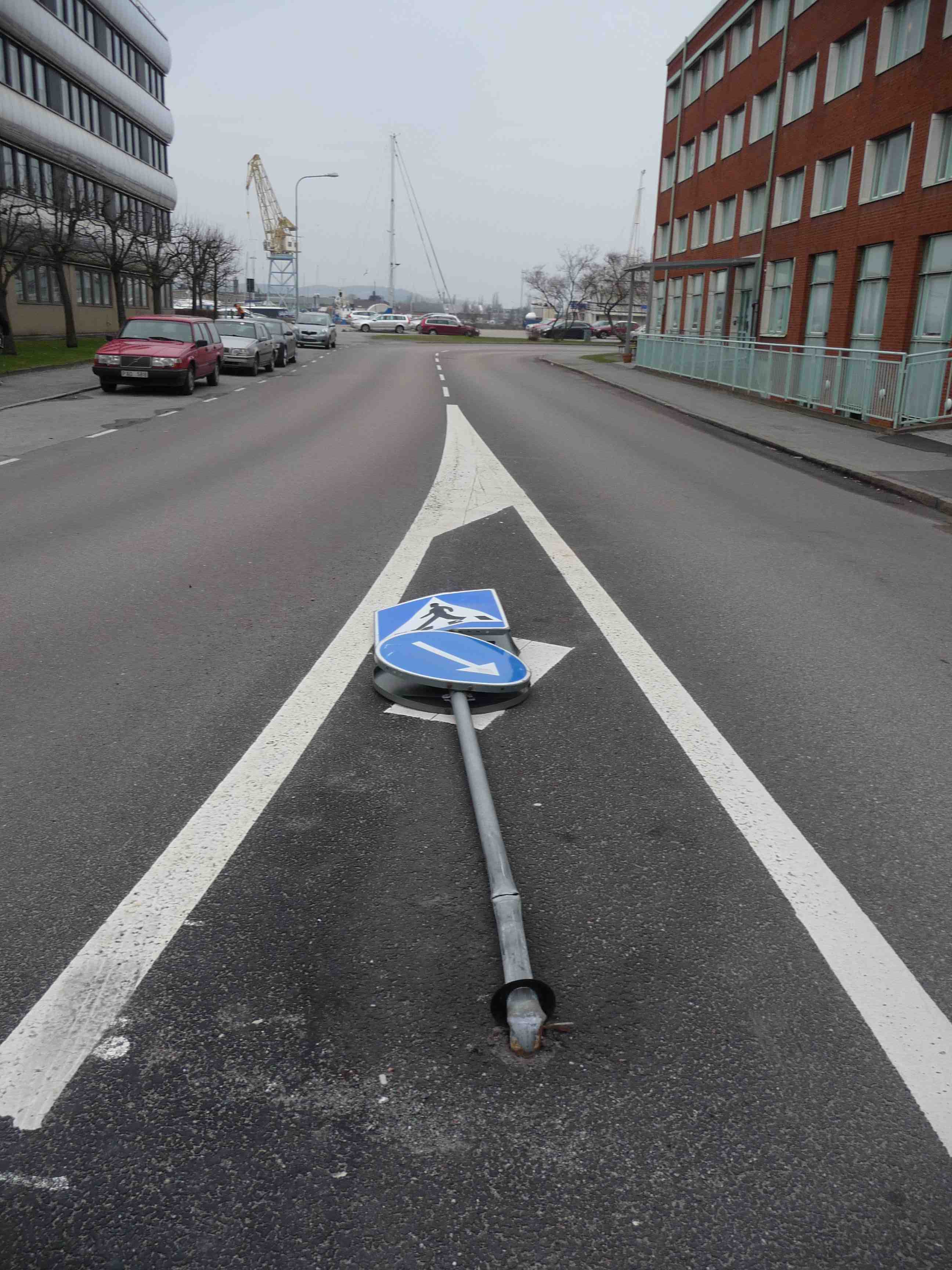 Uppstickande varningsskylt för ubåtar i farvattnet mellan Stora Bommens bro och den urgröpta Stenpiren. Torsdag 16 januari 2014 kl 15:56.