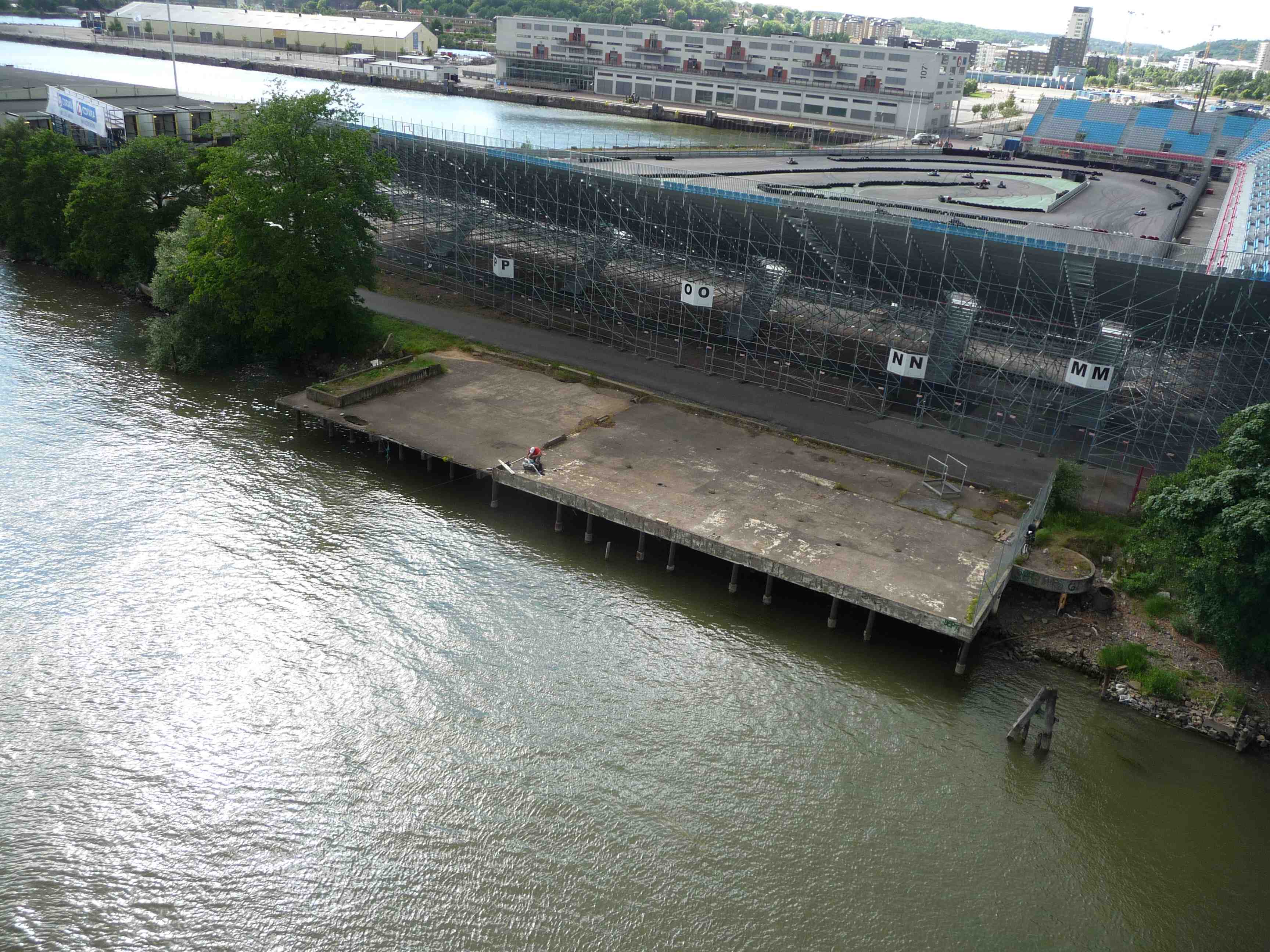 En spinnfiskare har parkerat sin cykel utanför staketet på gamla roddarpiren och förbereder sig i godan ro medan unga gokartsförare brötar på för fullt bakom hans rygg. Från Göta älvbron vid Frihamnen fredag 13 juni 2014 kl 17:13.