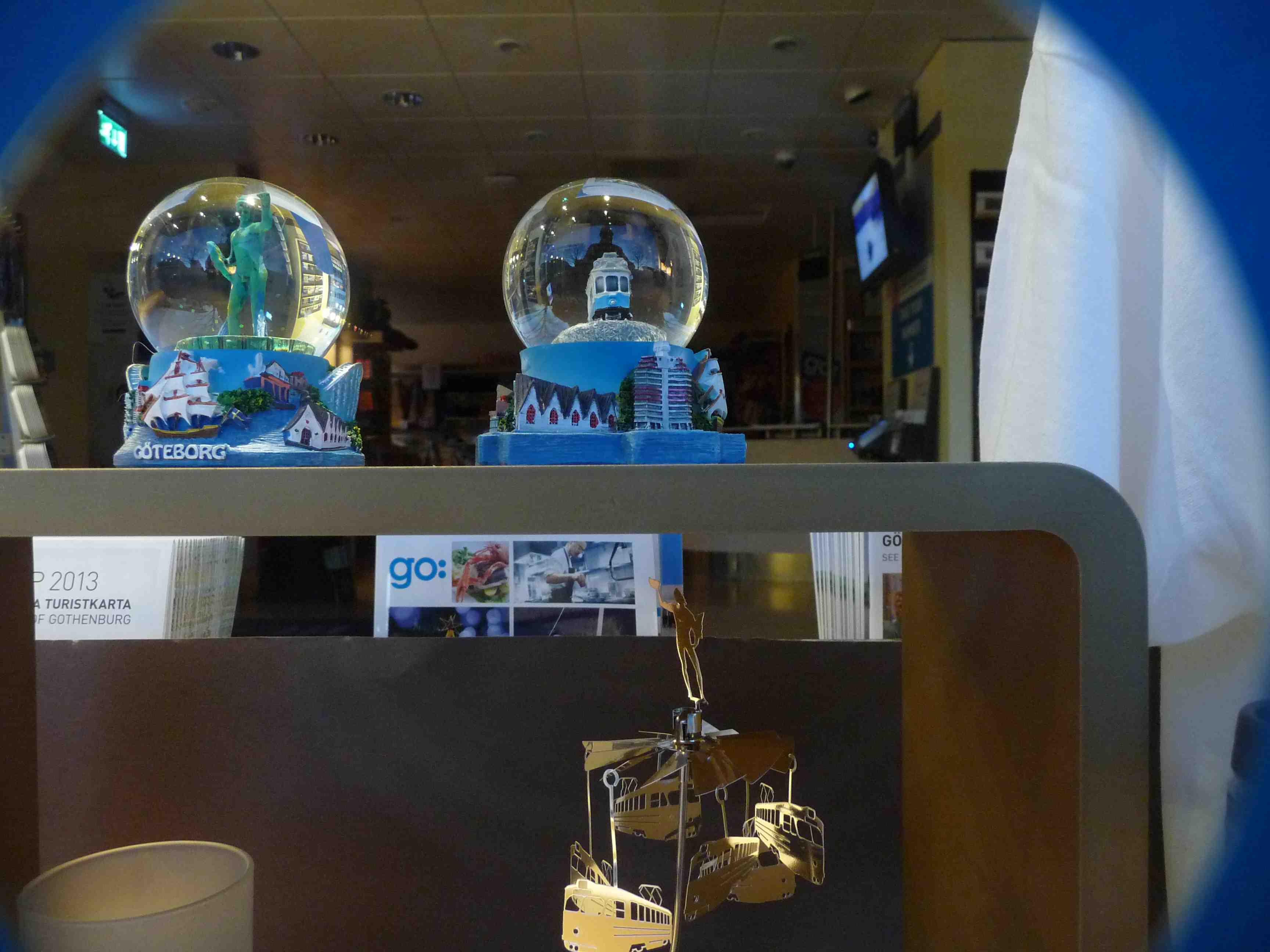 Poseidon och spårvagn i glaskulor och änglaspel hos Göteborgs Turistbyrå vid Kungsportsplatsen. Söndag 12 januari 2014 kl 16:16.