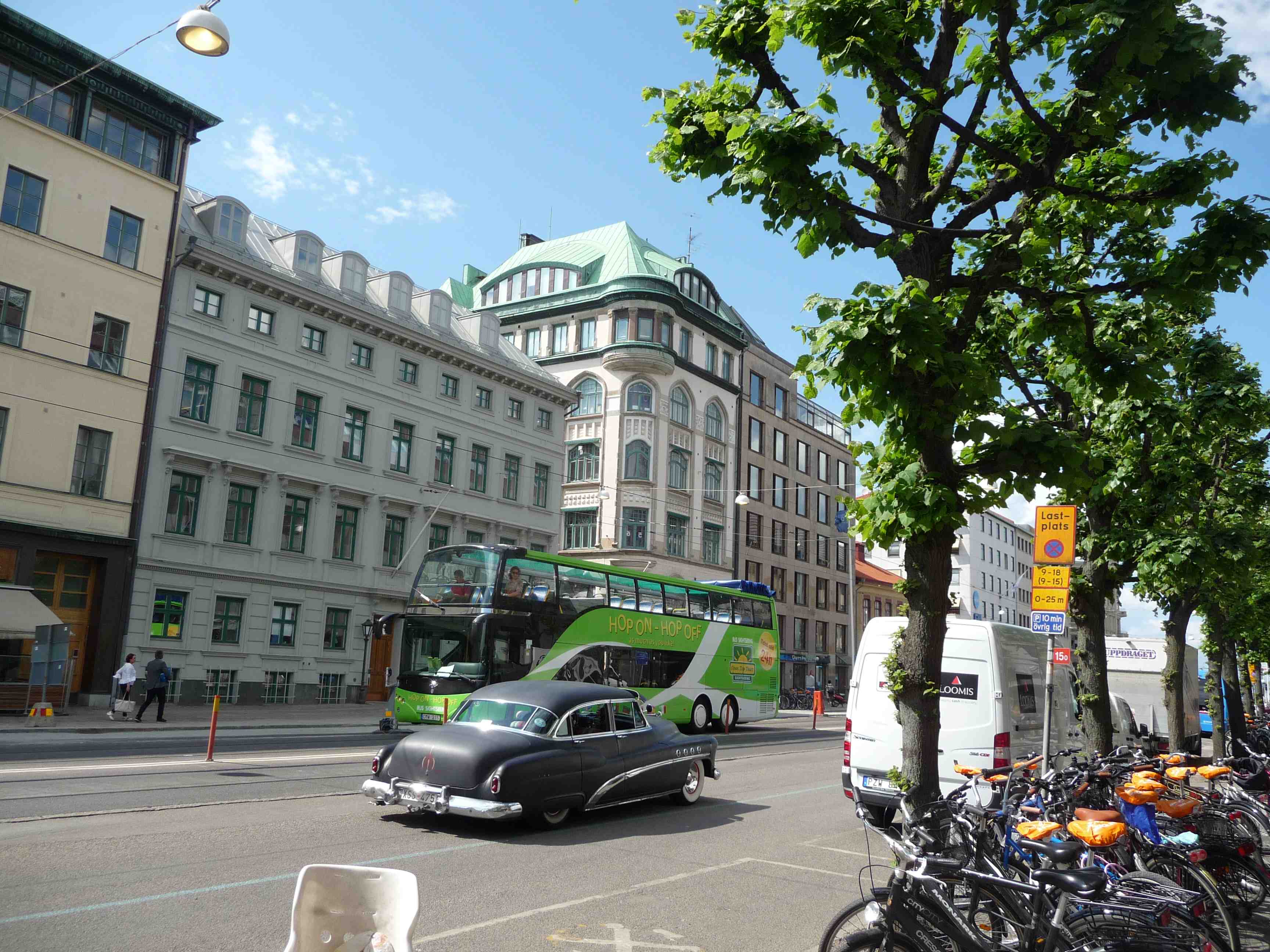 Buick Super 1952, HOP ON-HOP OFF Cabriolet och nyrenoverade Östra Hamngatan 17, numera med takkupor. Måndag 2 juni 2014 kl 15:13.