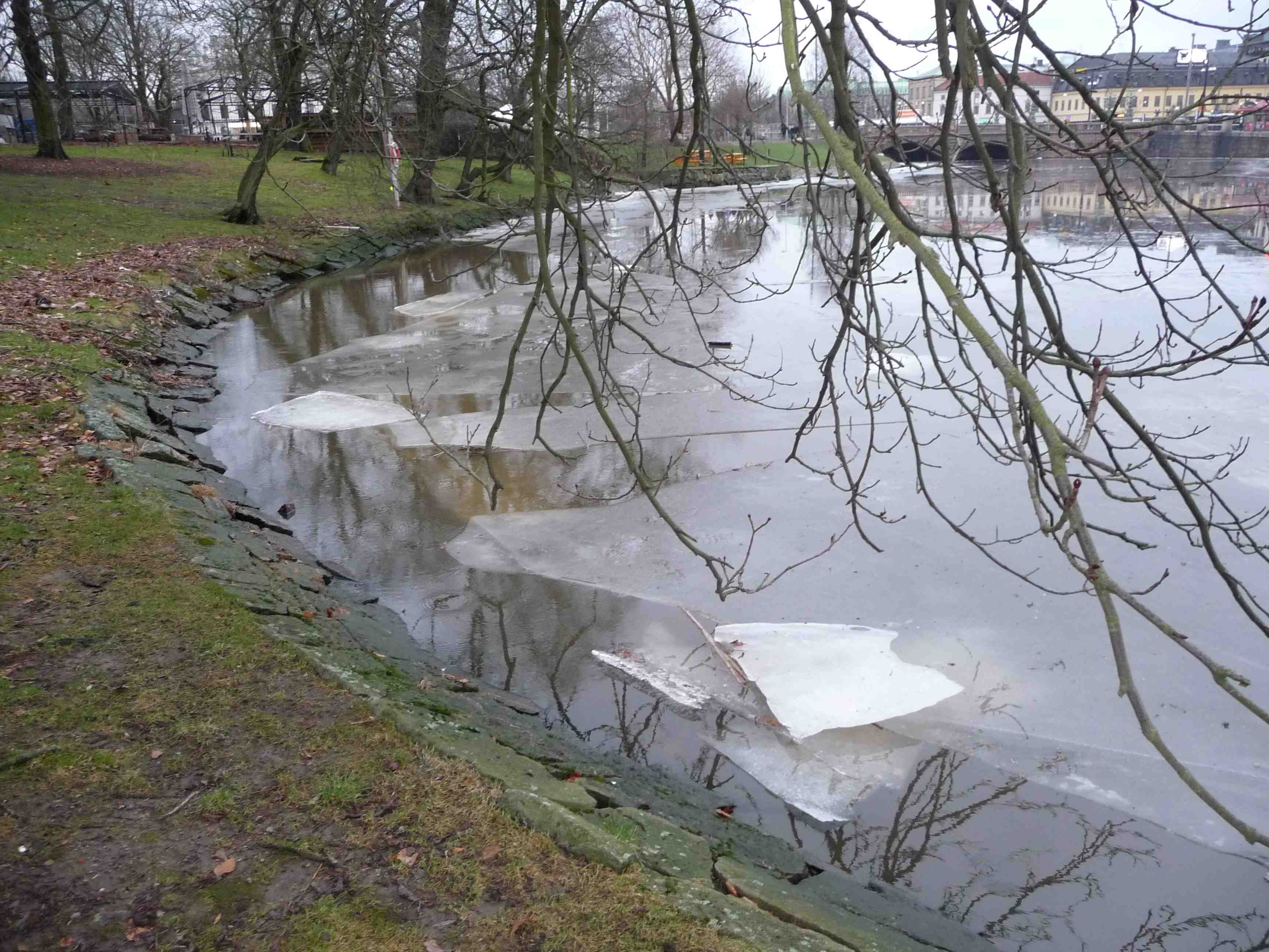 Nyisen breder snabbt ut sig i Vallgraven mellan Trädgårdsföreningen och Stora Nygatan och jagar vilt flyende andpar. Torsdag 23 januari 2014 kl 14:59.