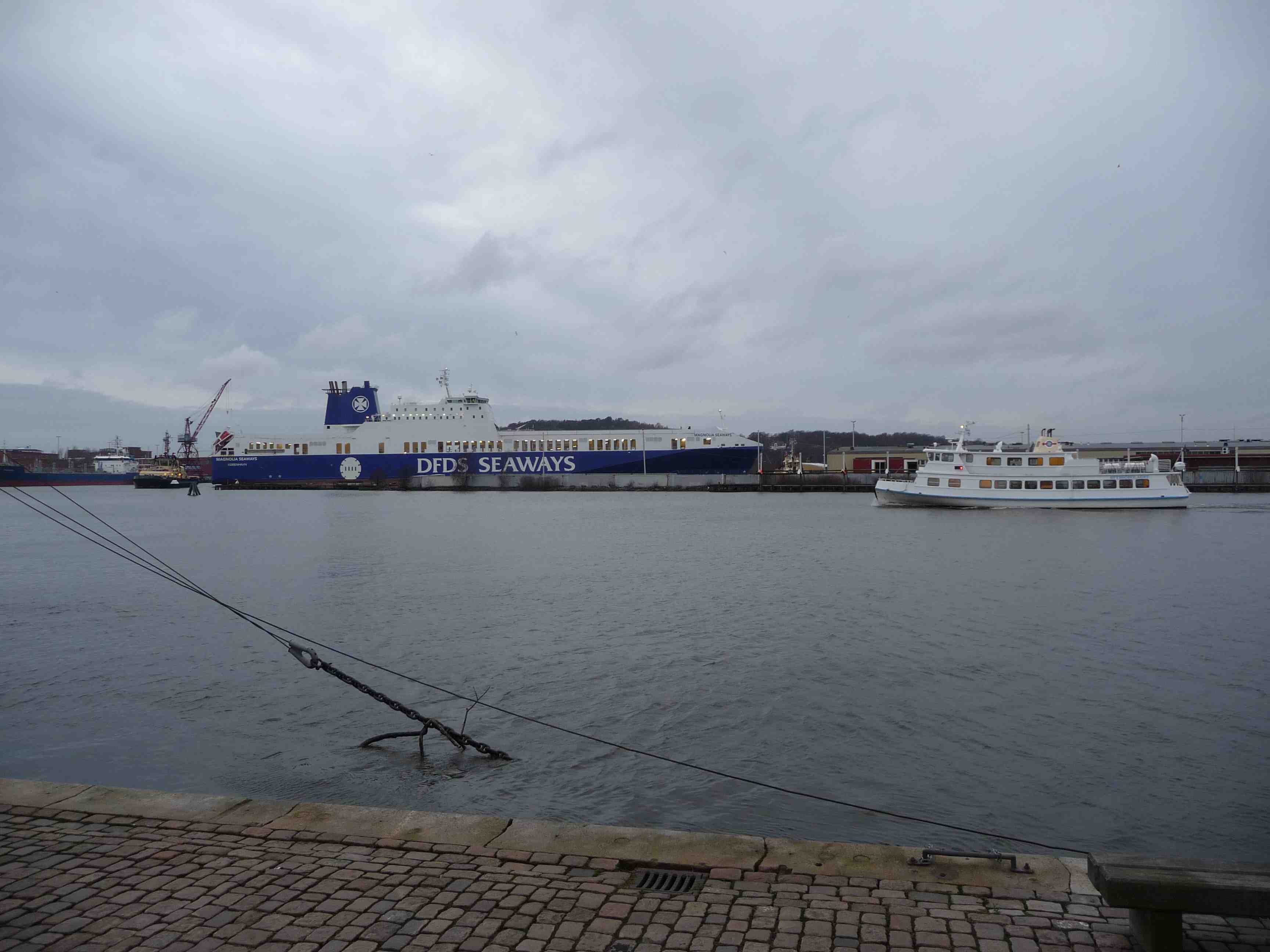Stena Saga, som går på traden Oslo-Frederikshavn, på väg ur Götaverkens docka. Fredag 11 april 2014 kl 17:44.