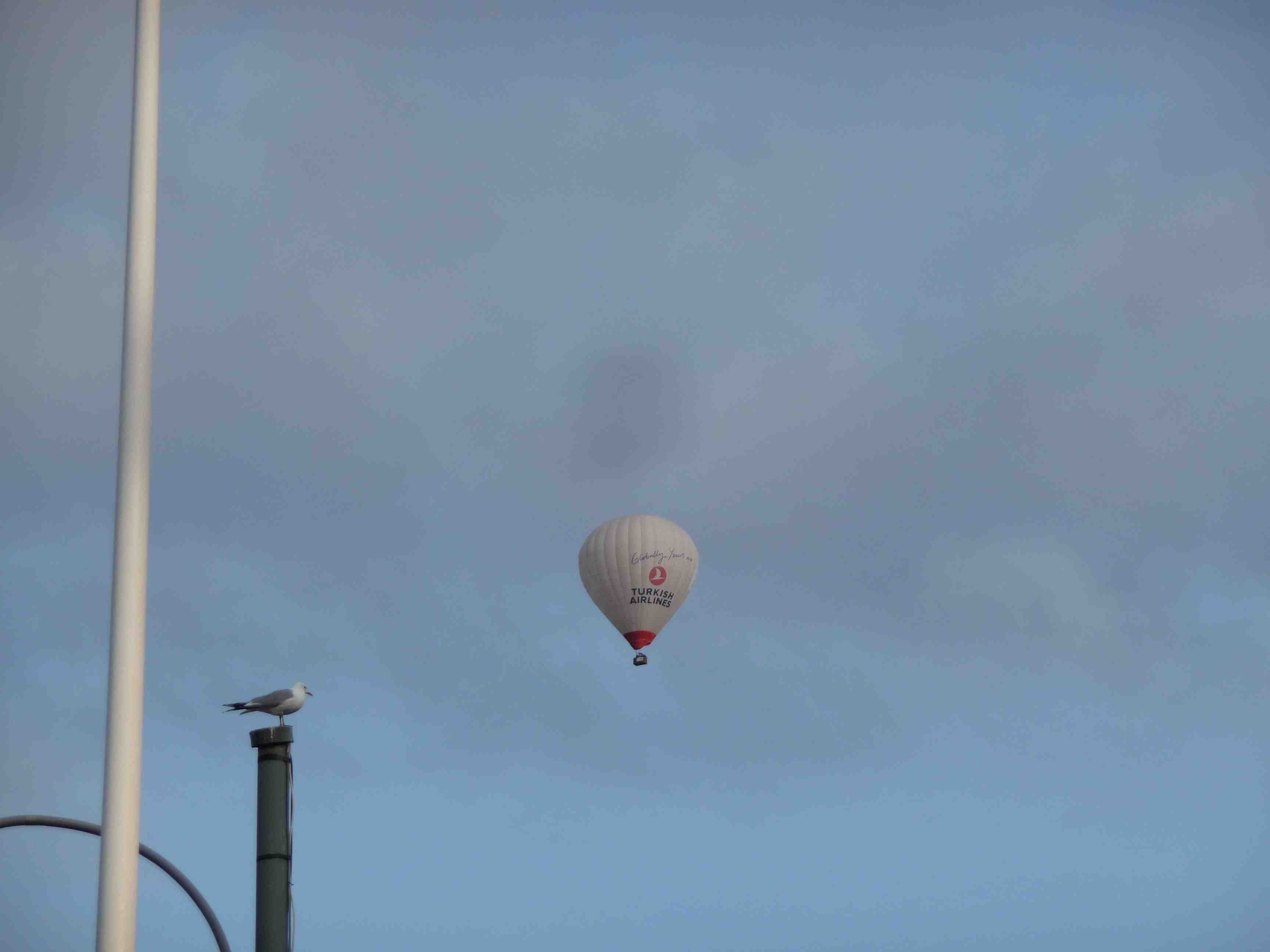 På stolpe vid Storan uppflugen fiskmås betraktar flygarkollegan Turkish Airlines’ luftballong. Torsdag 15 maj 2014 kl 19:35.
