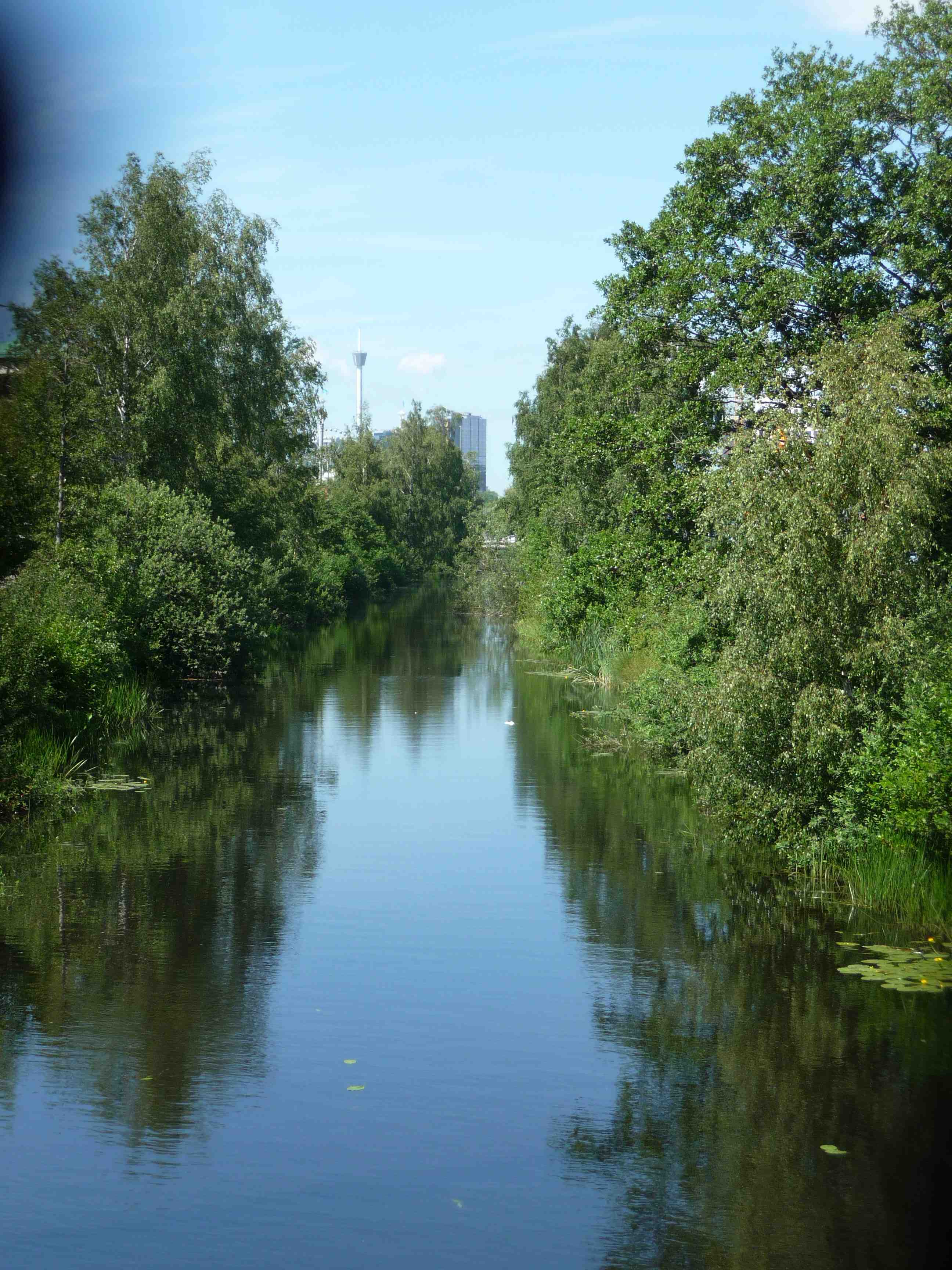 Mölndalsån mellan Mölndalsvägen och Grafiska vägen mot 116 meter höga Lisebergstornet och 100 meter höga Gothia East Tower vid Korsvägen. Onsdag 18 juni 2014 kl 14:39.