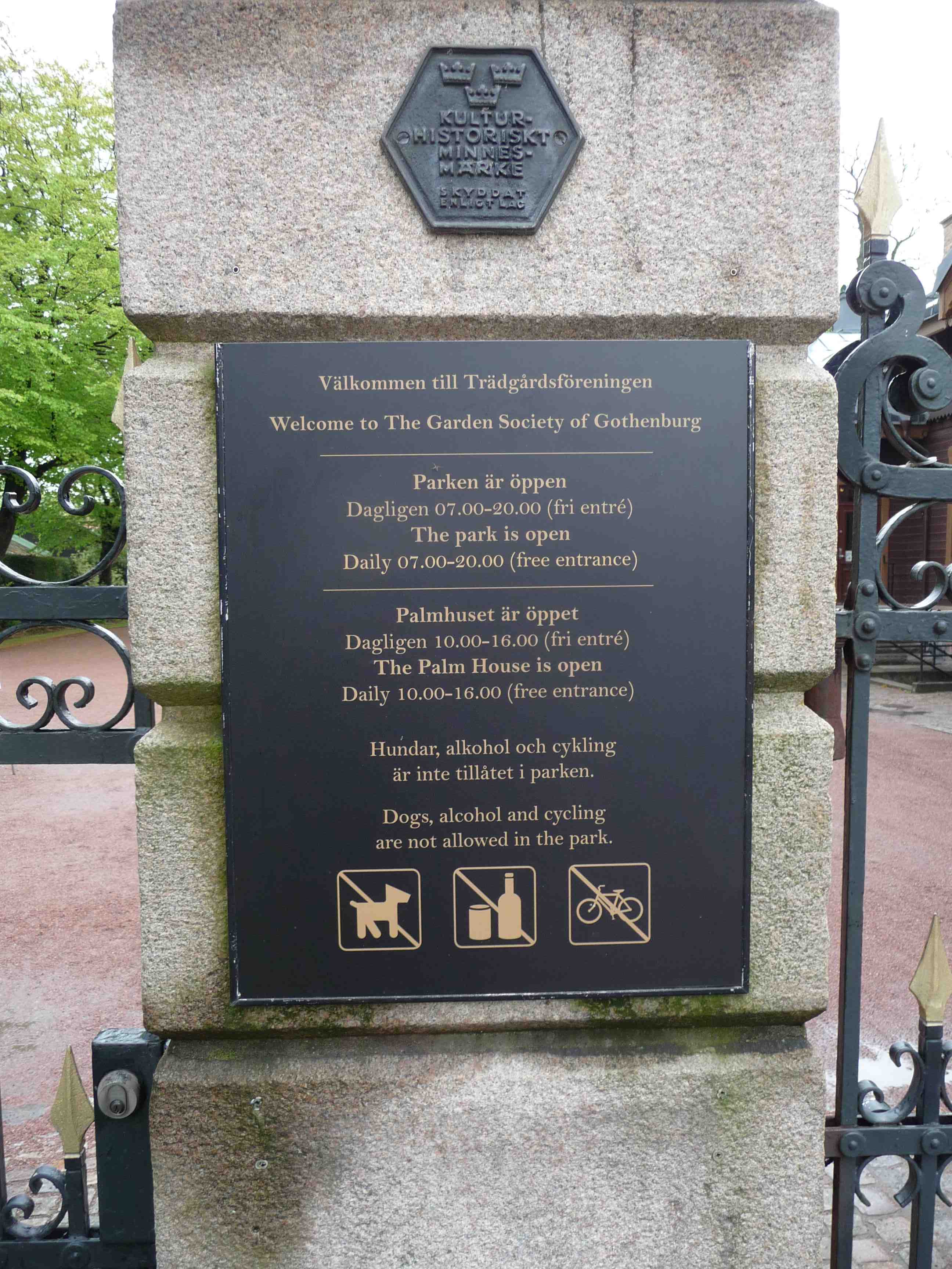 Inte en dag för tidigt! Men när det gäller misskötta Trädgårdsföreningen får man vara glad för det lilla. Sex dagar tog det alltså att få upp nya skylten åt Slussgatan där rätta stängningstiden står: 20.00. På den står också att hundar, alkohol och cykling är förbjudet, men det är precis vad som försiggår där sedan entréerna – och sommarjobben! – togs bort och Trädgårdsföreningen gjorts till en del av Kungsparken. Plus alla joggare som fåsar omkring och skrämmer änder. En gång var Trädgårdsföreningen en lugn oas för den som ville komma undan just det som nu pågår där. Tisdag 6 maj 2014 kl 17:54.