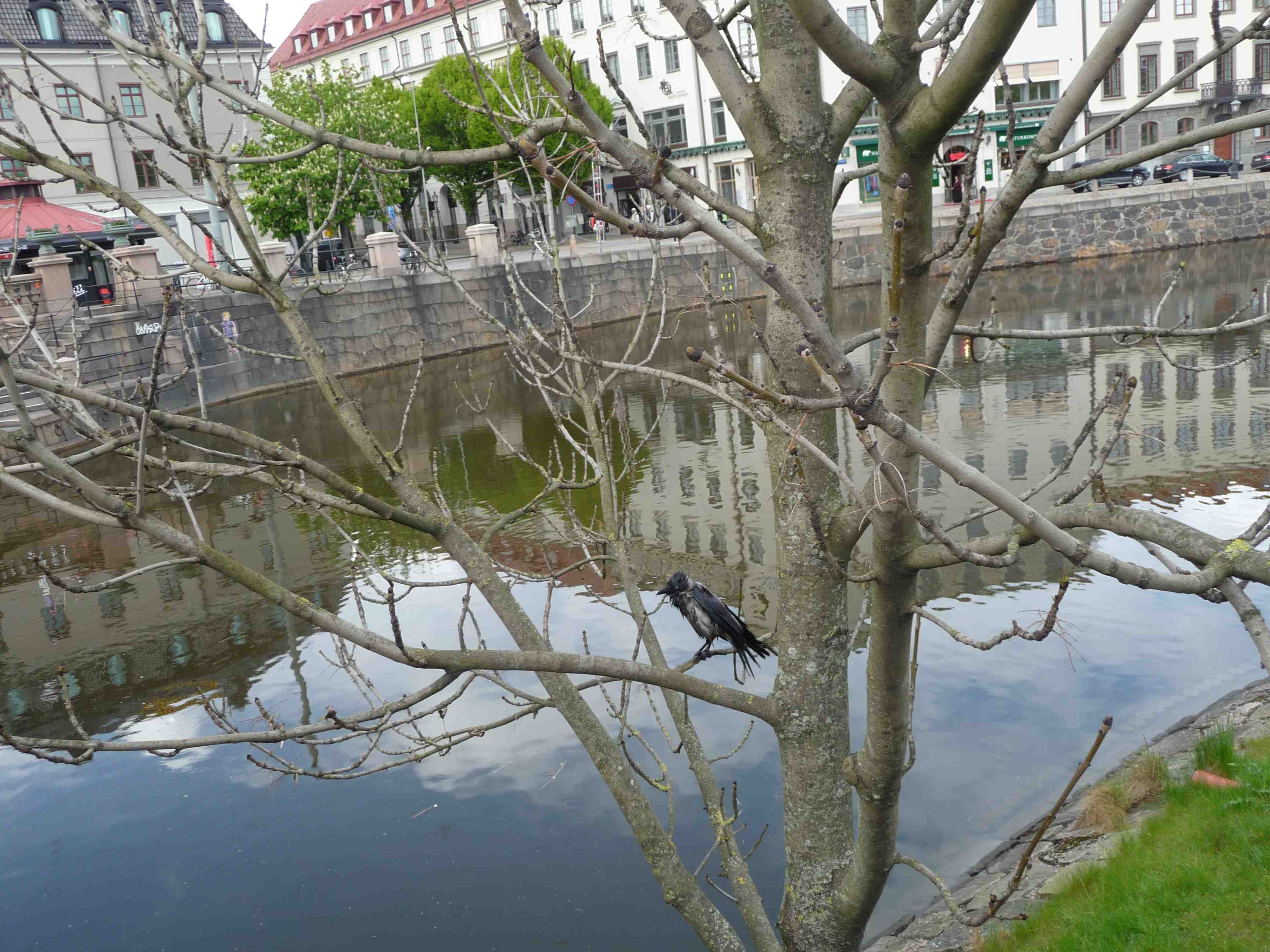 Nybadad kråka vid Kungsportsbron. Månne har den duschat i Bältespännarparkens nya fontän? Fredag 9 maj 2014 kl 16:35.