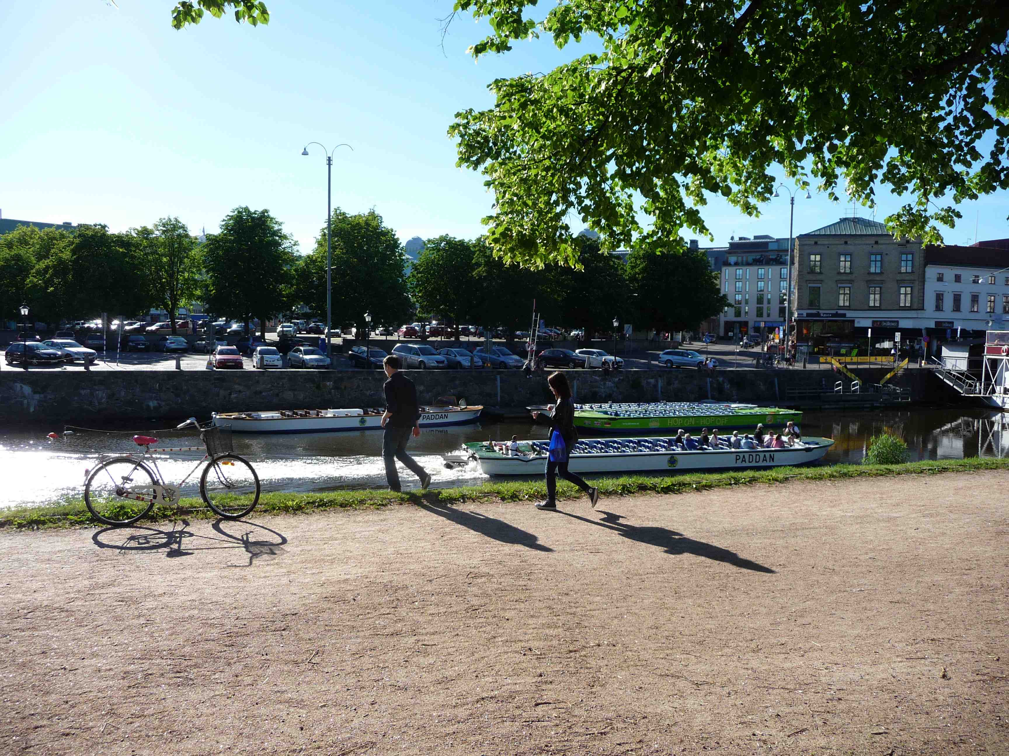 Nya eldrivna Städbåten M/S Ren-Ström extraknäcker som musikbåt och sprider ljudvågor över Vallgraven vid Trädgårdsföreningen. Paddan 1 drejar bi. Från Slussbron måndag 30 juni 2014 kl 17:04.