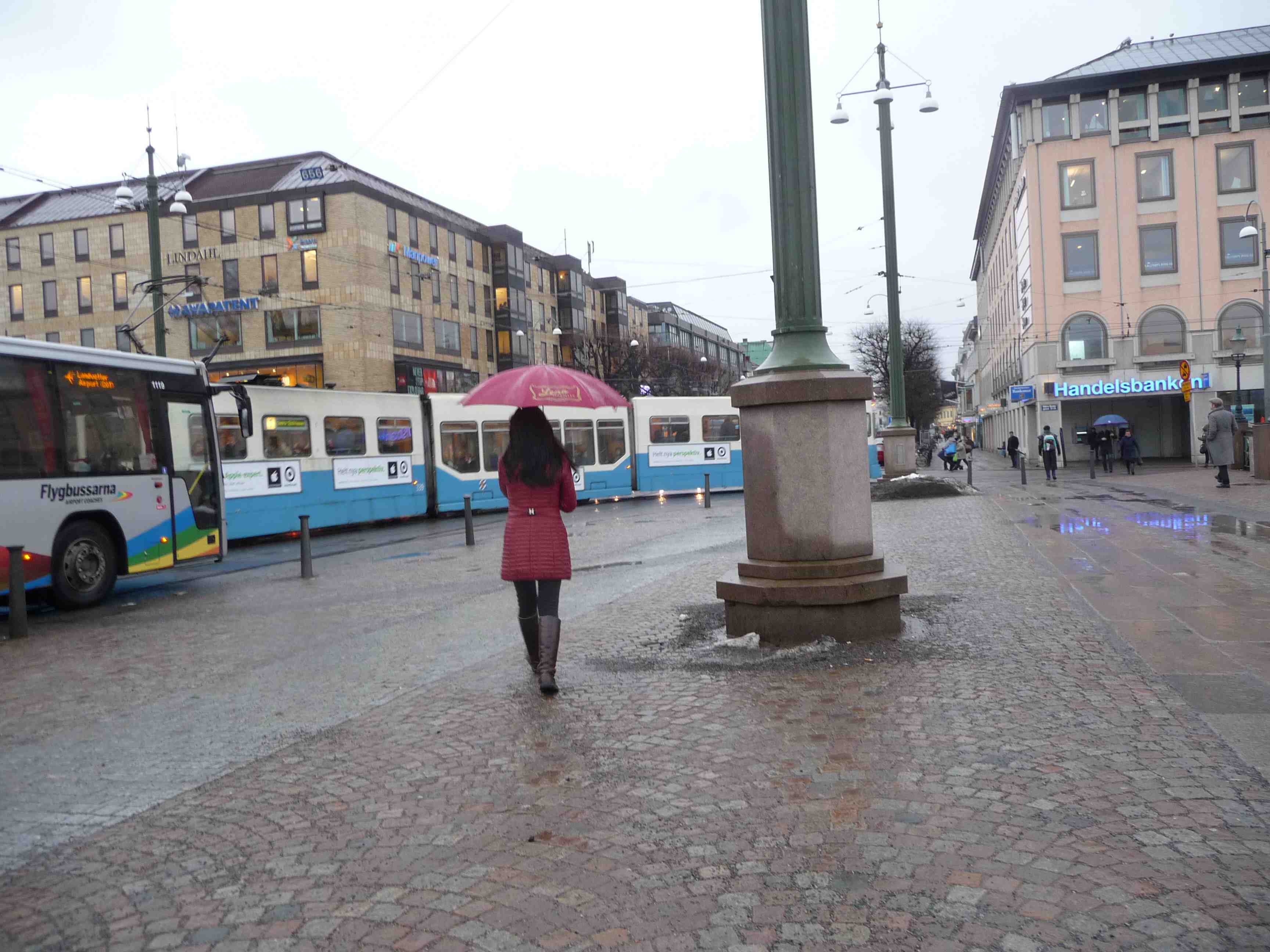 Regnstänkt utsikt från 5:ans spårvagn vid Vågmästareplatsen på spår mot Biskopsgården. Lördag 5 april 2014 kl 15:48.