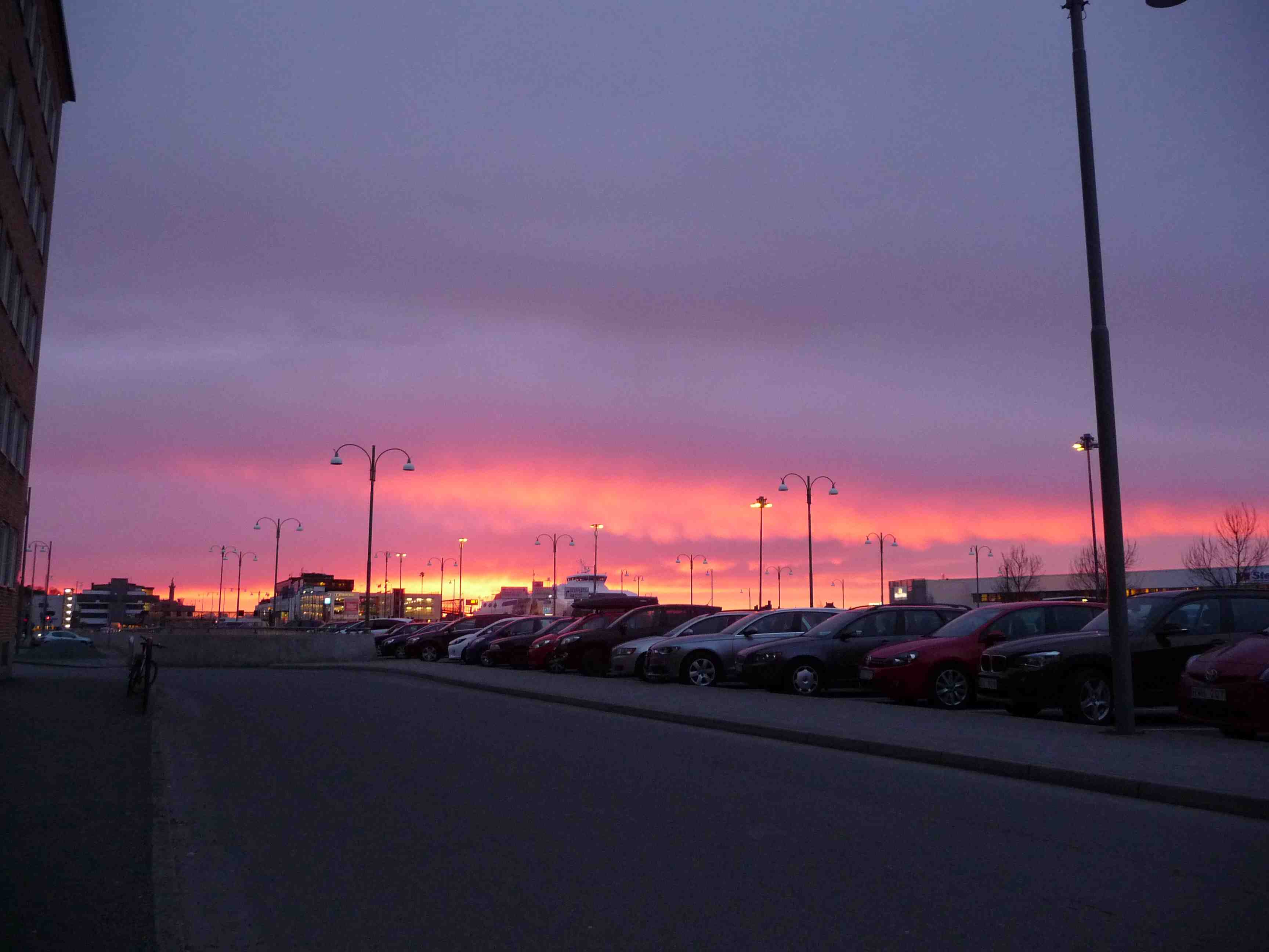 Solen går ner över Stenaterminalen vid Masthuggskajen. Men i rosenrött! Och sakta – borta 2020. Tisdag 25 mars 2014 kl 18:40.