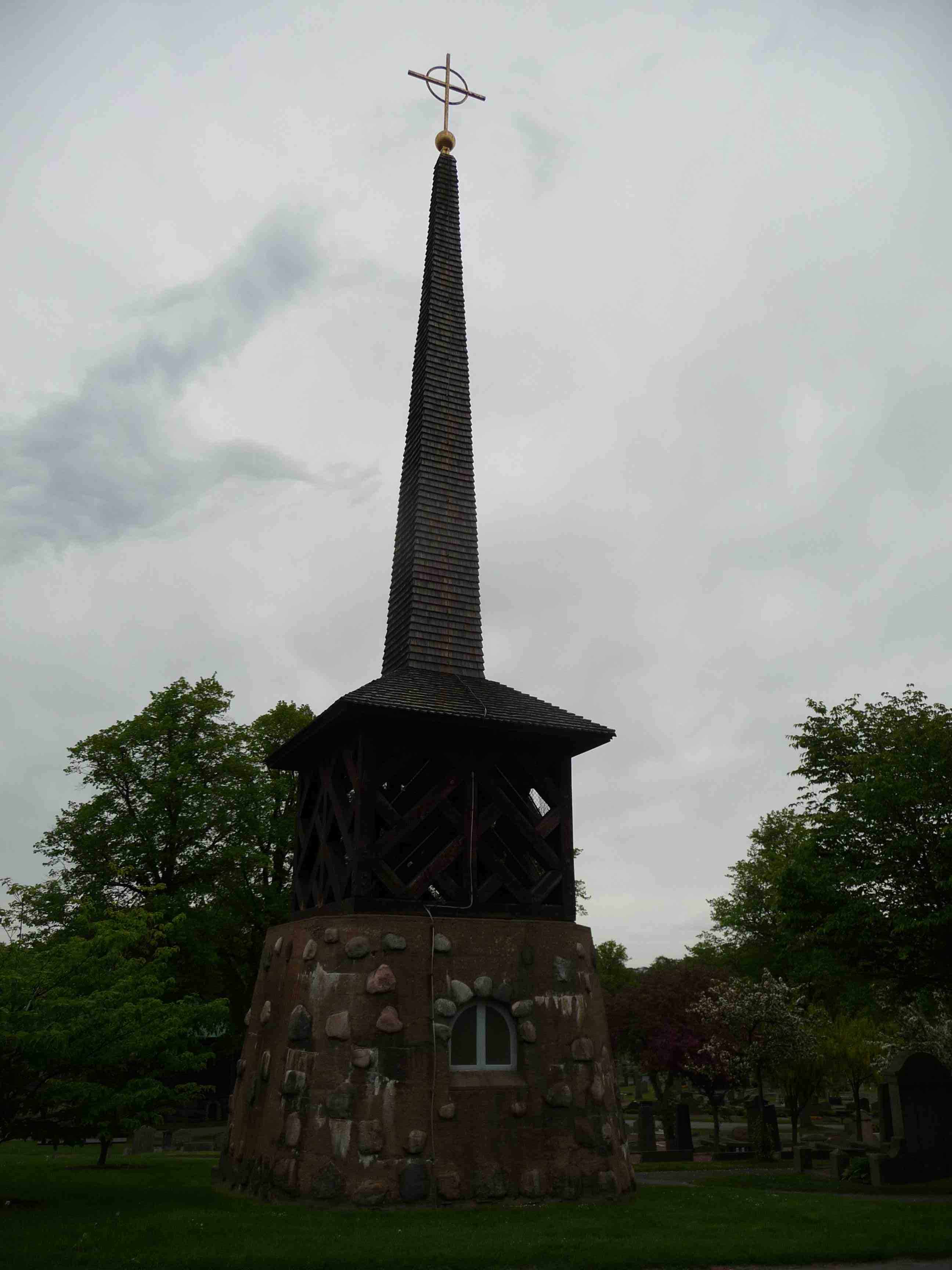 Sankt Matteus’ klockstapel från 1956 på Västra kyrkogården en helg då många pyntade sina gravar. Söndag 18 maj 2014 kl 18:41.