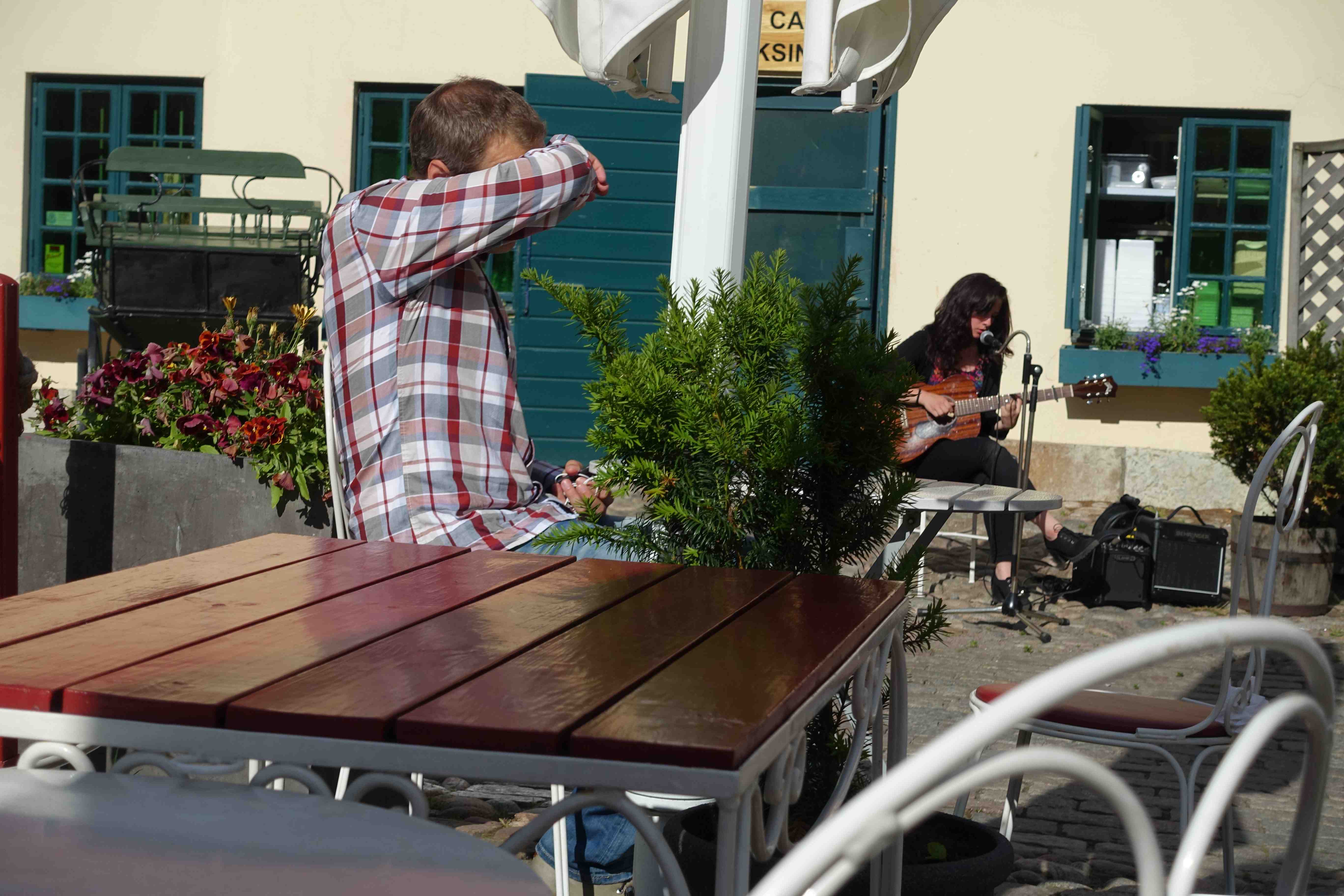 Harry Perssons spårvagn passerar Café Festival. Lustigt nog ser Harry på under en paus i spelningen! Måndag 19 maj 2014 kl 15:47.