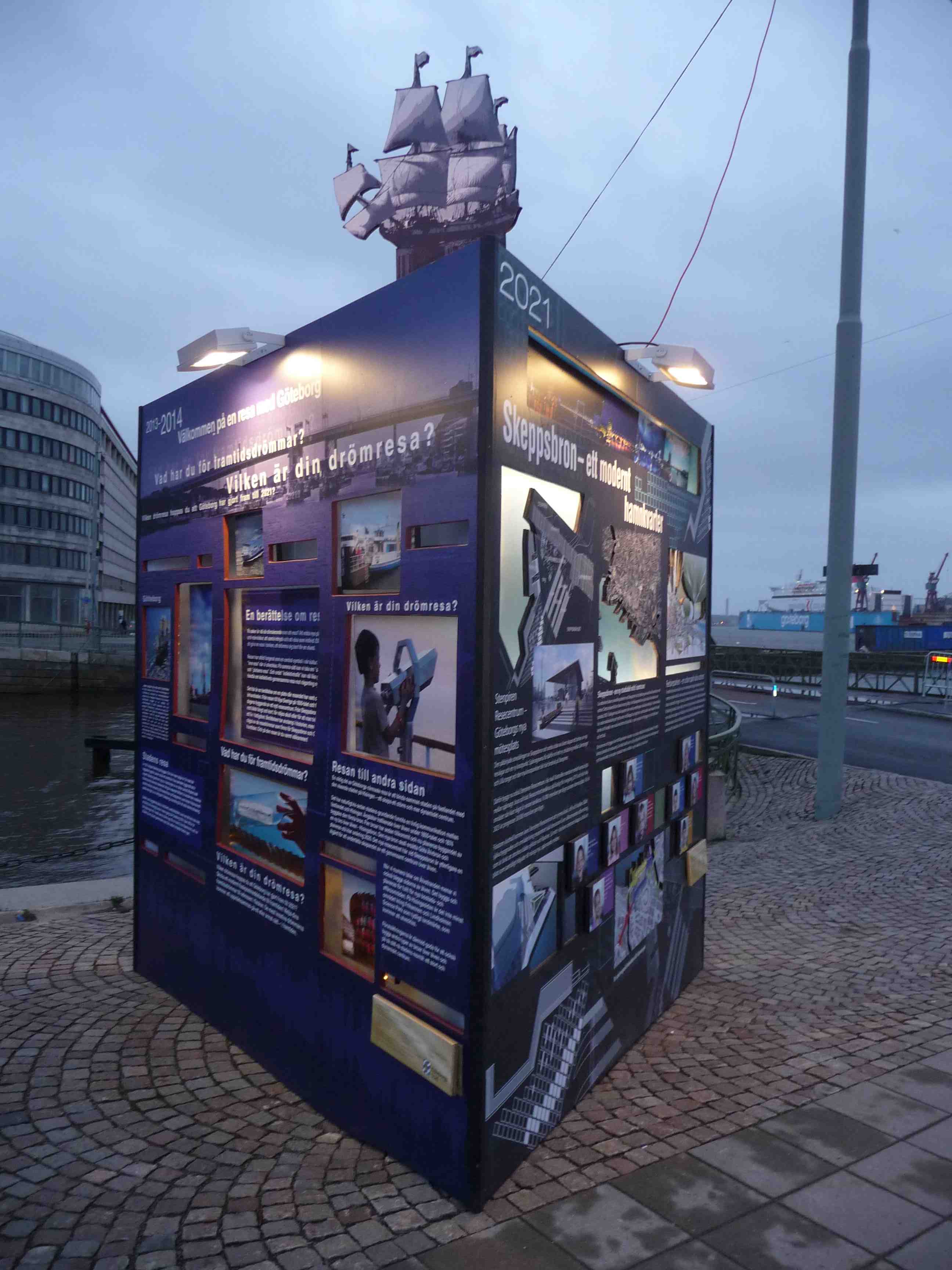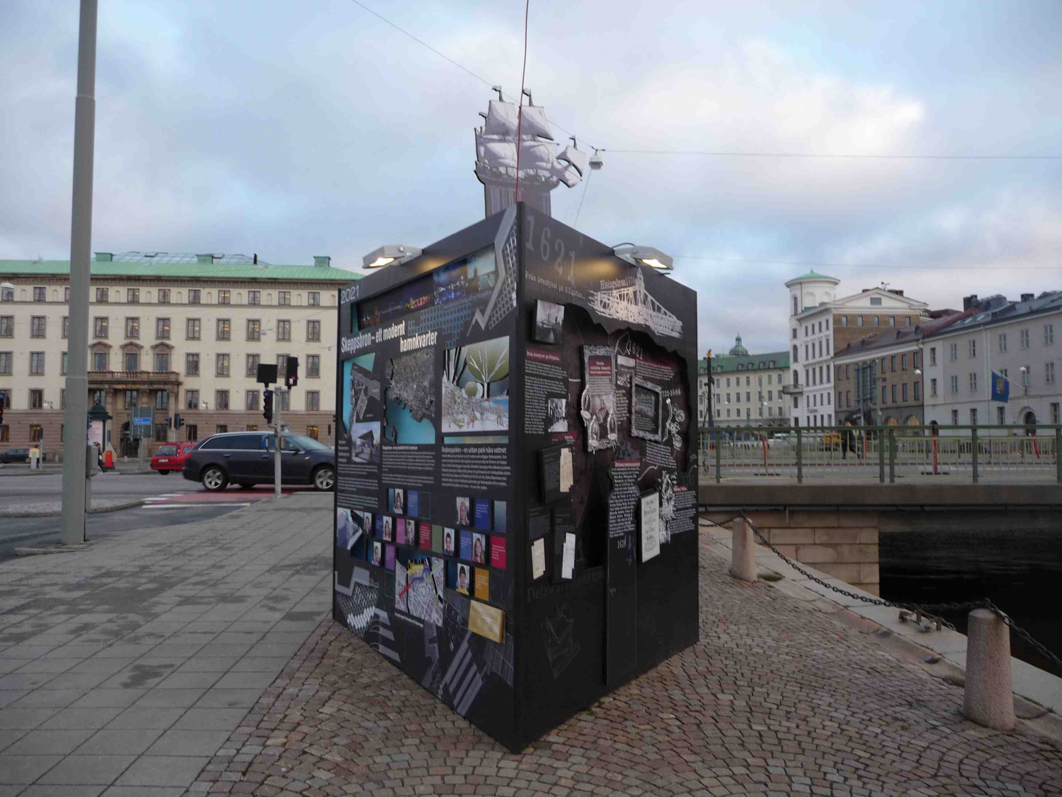 Skeppsbrons informationstrekant från öster vid Packhuskajen. Evert Taube sjunger just. År 2021 fyller Göteborg 400 år. Onsdag 8 januari 2014 kl 15:11.