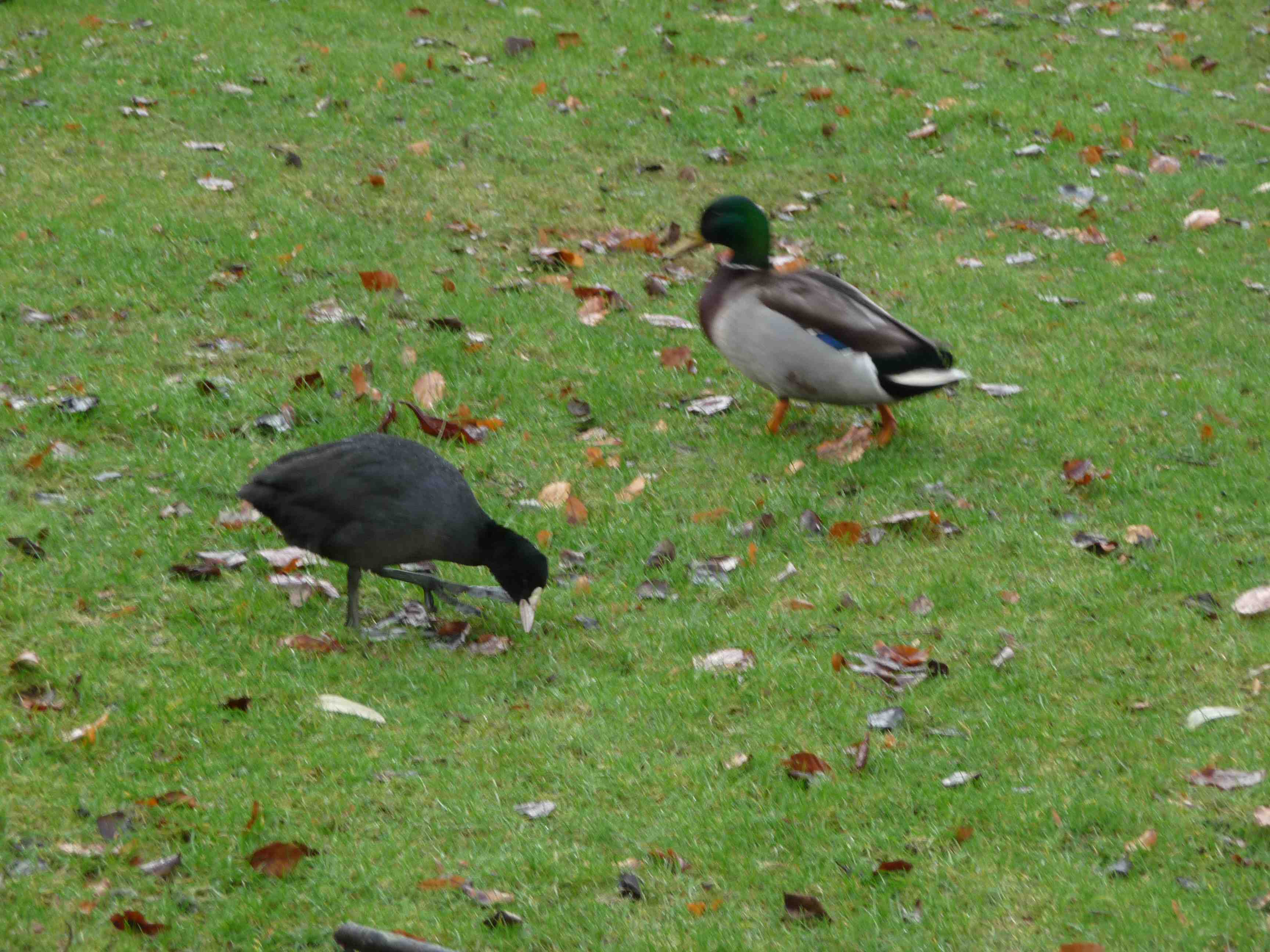 Andmamma med åtta små ungar betittas av nyfikna fränder. Trädgårdsföreningen vid Vallgraven söndag 13 april 2014 kl 17:32.