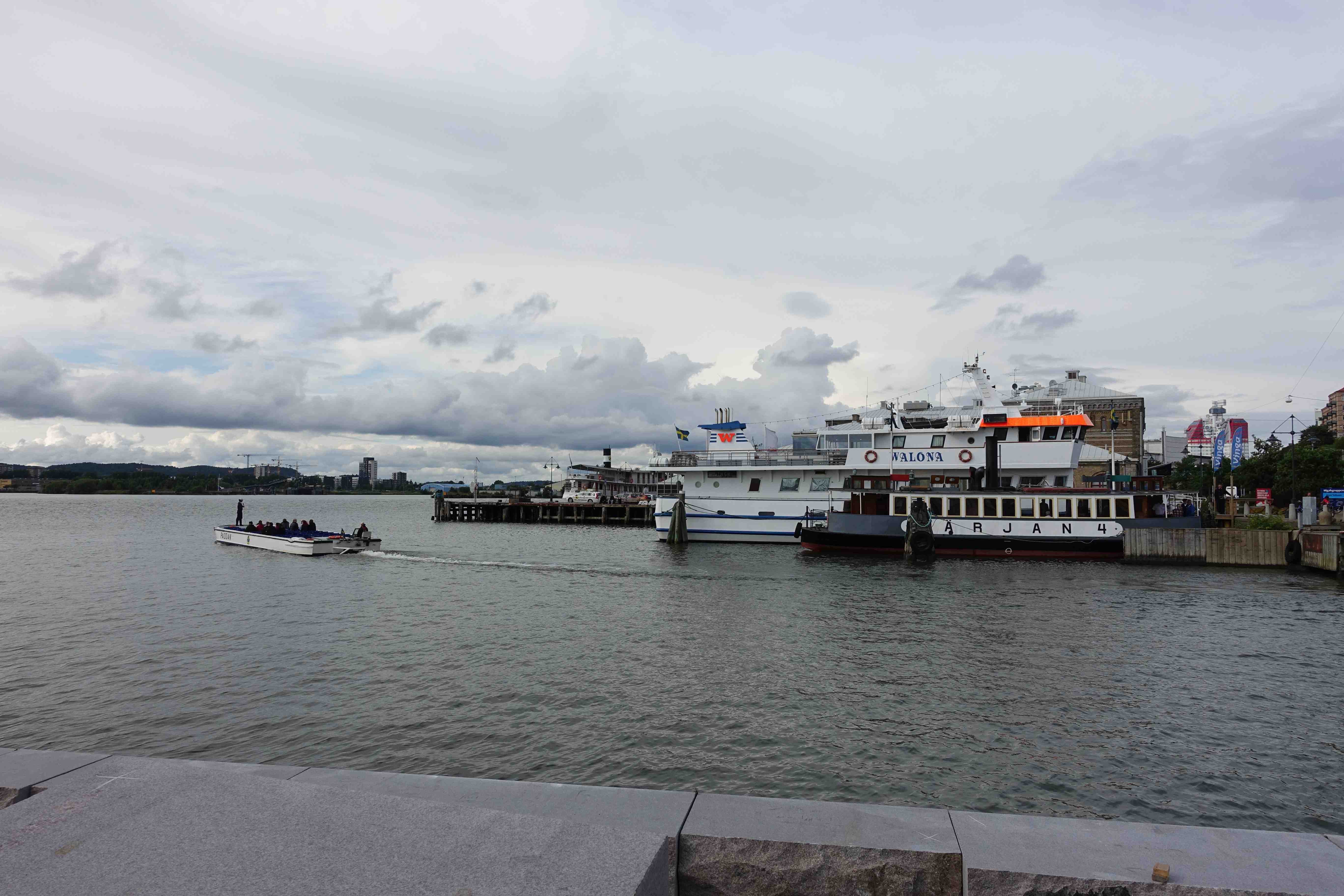 Paddan 11, Walona och Färjan 4 vid Stora Bommen och Packhusplatsen där Göta kanal-båten Diana skymtar. Från Stenpiren lördag 28 juni 2014 kl 17:42.