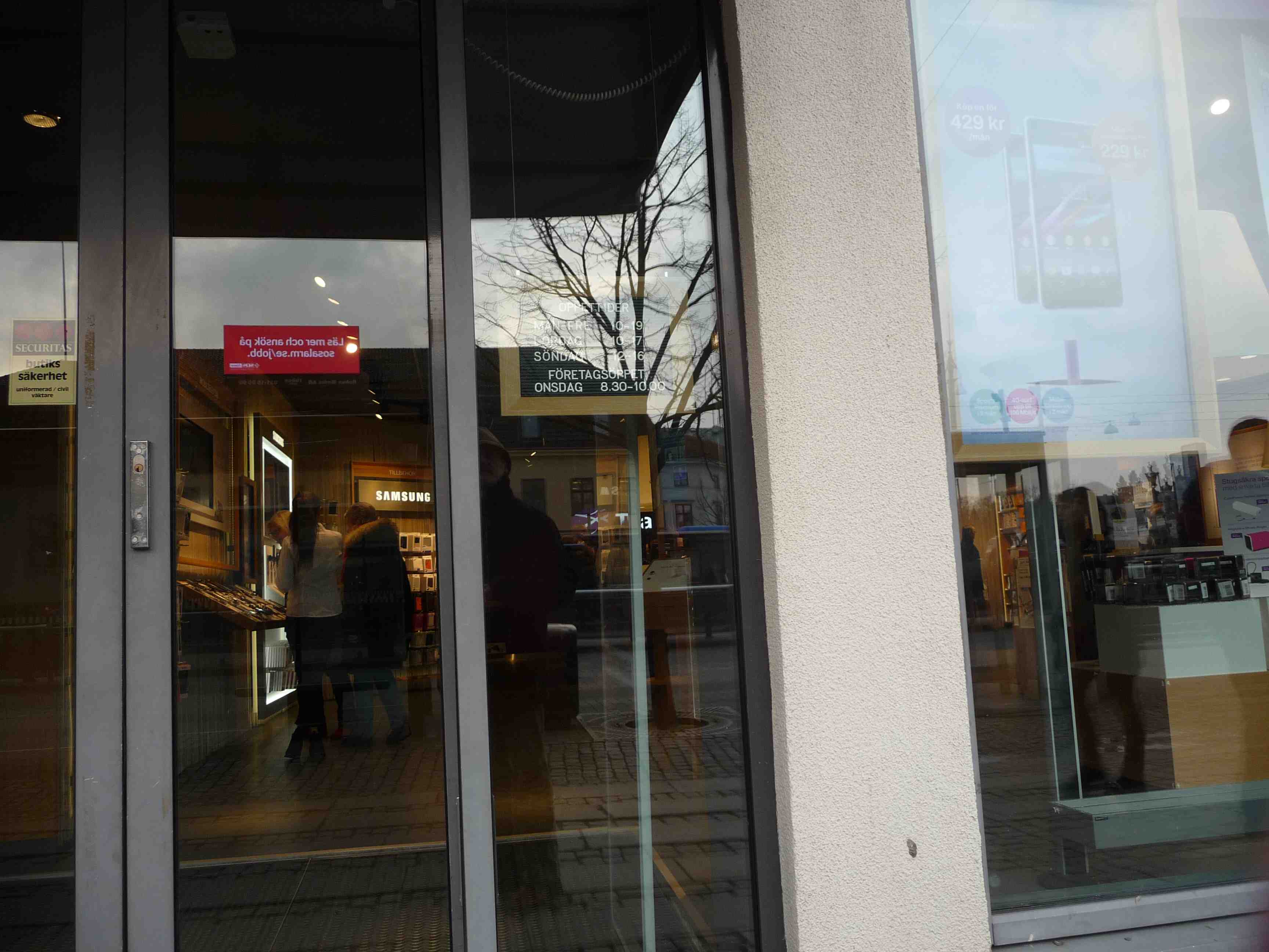 Telia vid Kungsportsplatsen med bakvänd skylt för fönstertittare. Torsdag 27 februari 2014 kl 16:28.