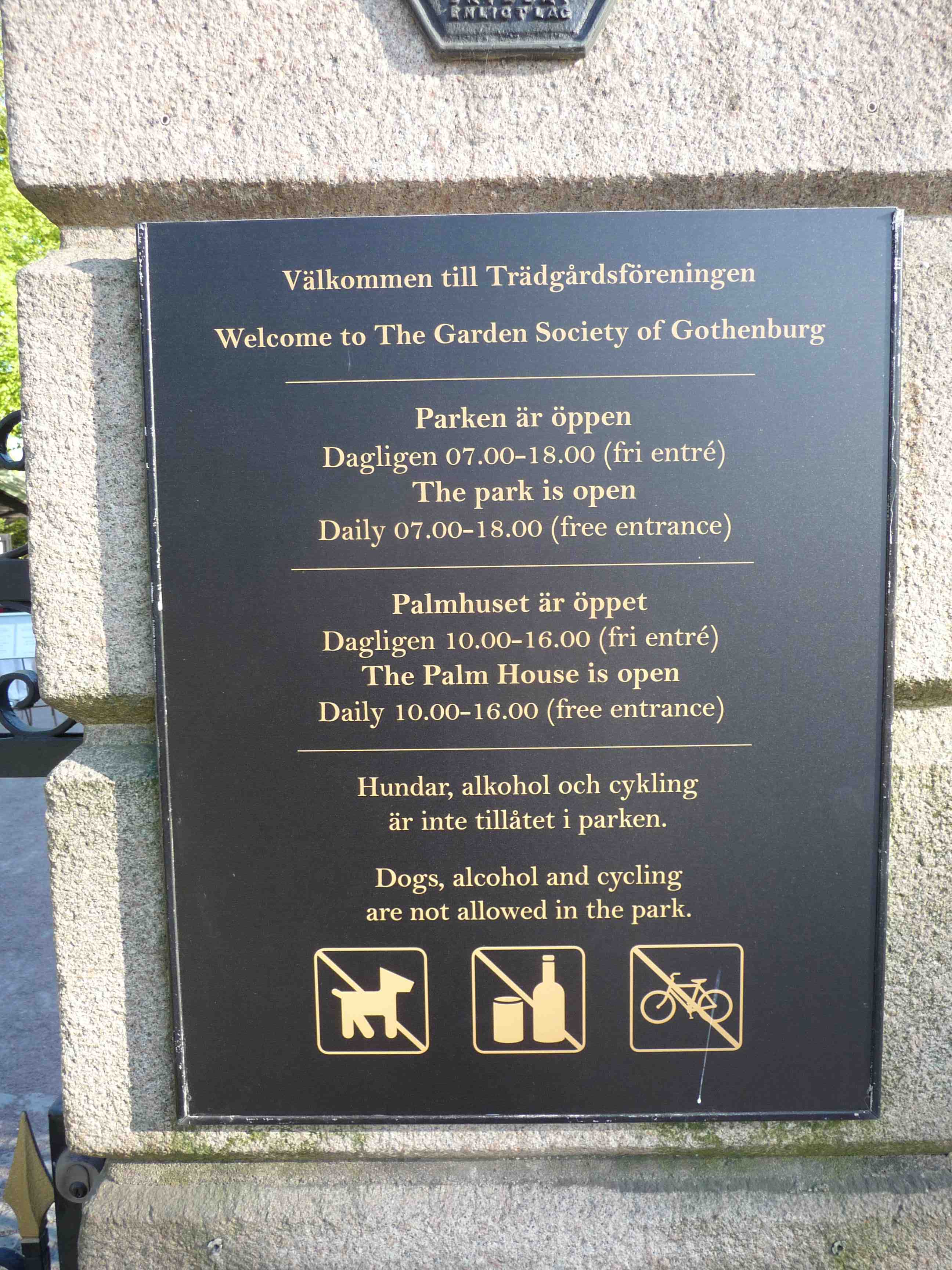 Trädgårdsföreningens skylt vid Slussen fortfarande inte bytt, så inför den tror man att parken stänger 18.00, när det är 20.00. Söndag 4 maj 2014 kl 18:38.