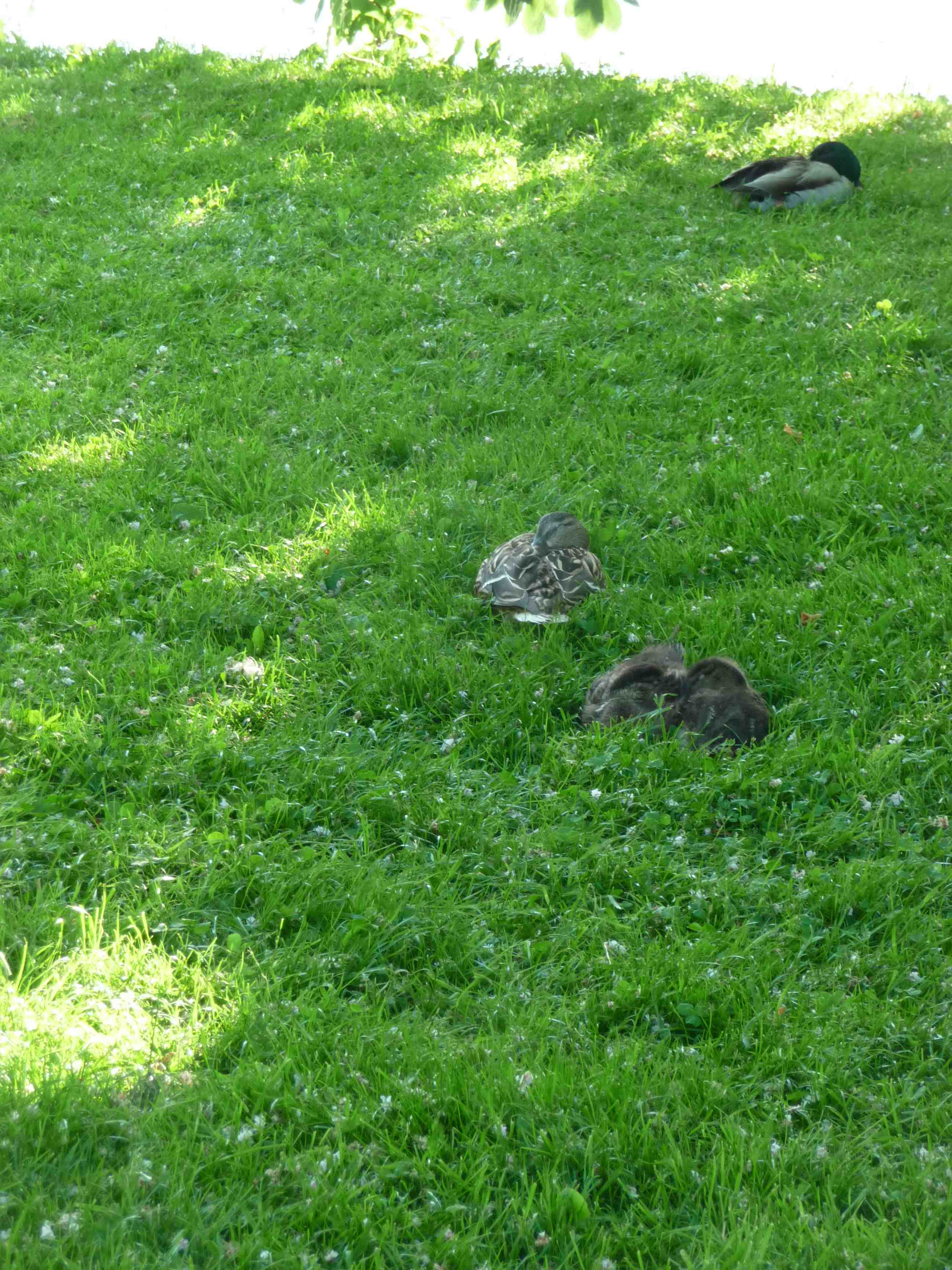 Sovande andungar – alla fem? – med mamma. Och pappa? Trädgårdsföreningen söndag 25 maj 2014 kl 18:49.