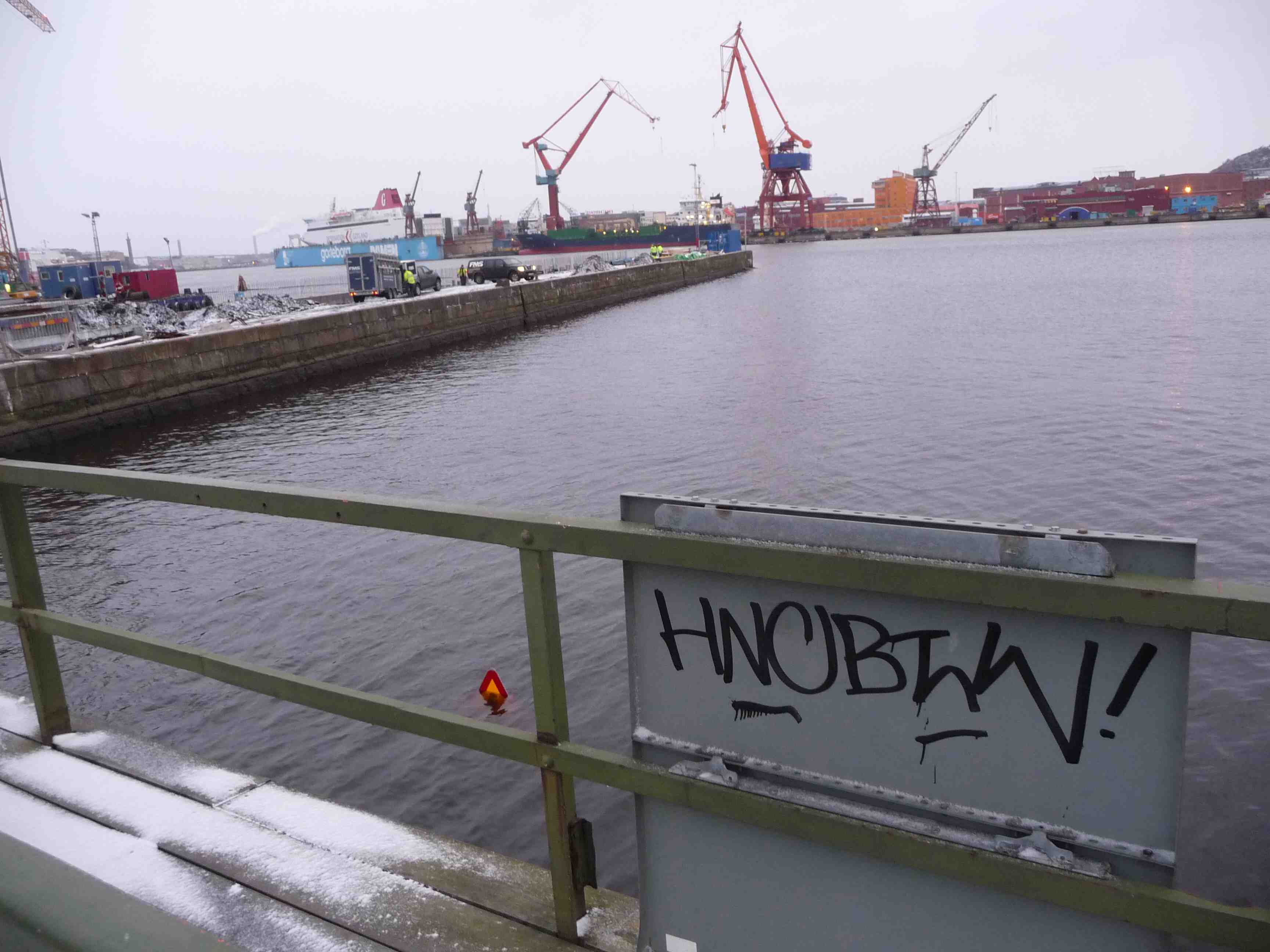 Stenpiren har fått vila några veckor, men i morgon startar lidandet och förintandet igen. Vid Stora Bommens bro Trettondedag jul måndag 6 januari 2014 kl 14:26 i regnigt och blåsigt femgradigt äkta Göteborgsväder.