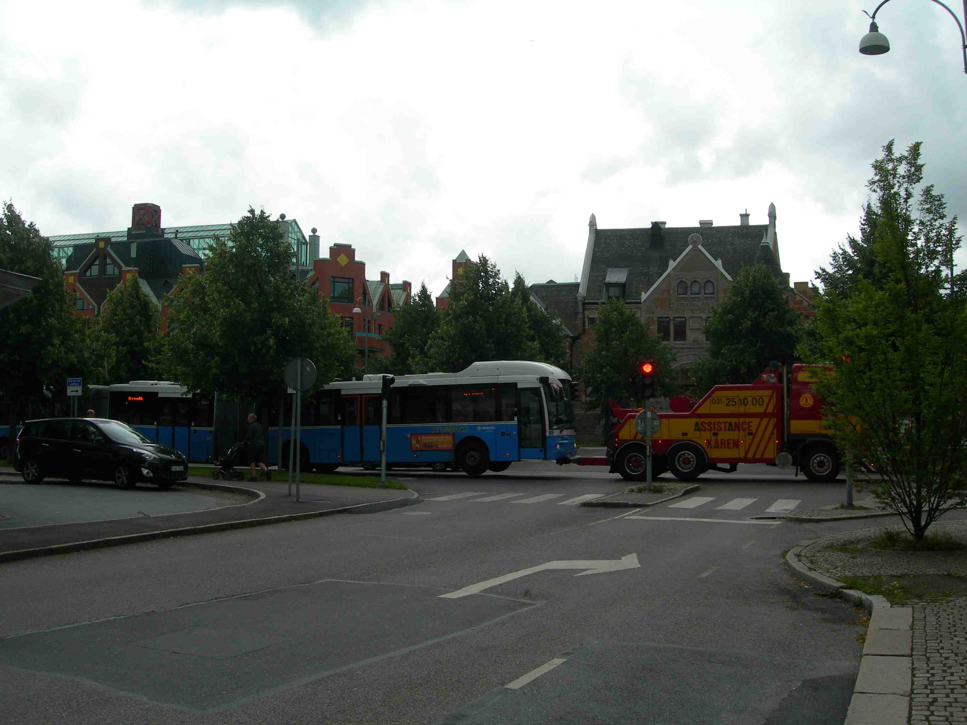 Bärgad buss på Norra Allégatan vid Pustervik med gamla Dicksonska folkbiblioteket, numera Allégården, i bakgrunden på Södra Allégatan. Måndag 8 augusti 2011 kl 13.41.