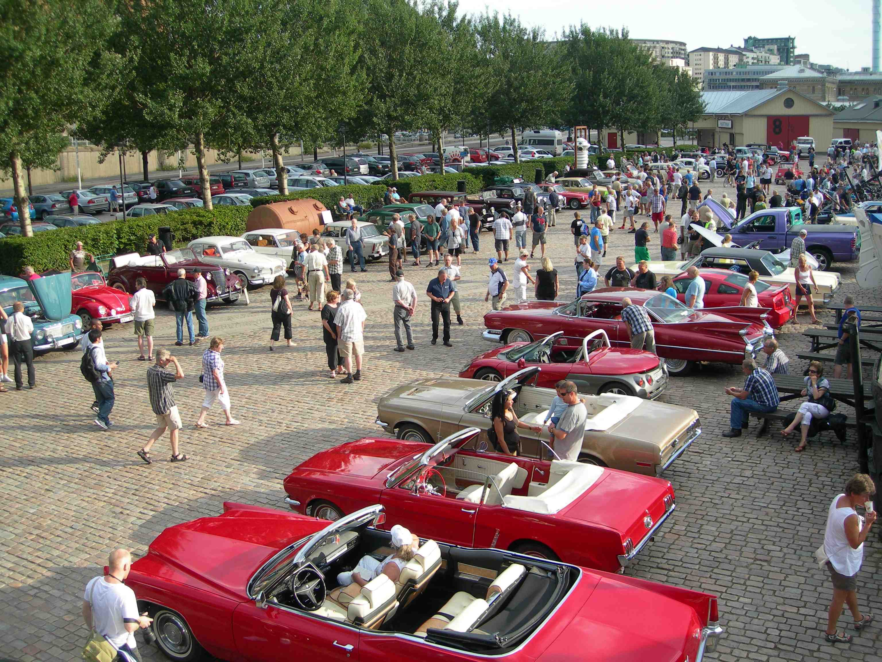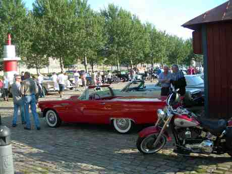 Bilar på Packhuskajen vid Maritiman med Ford Thunderbird 1957. Onsdag 27 juli 2011 kl 18.34.