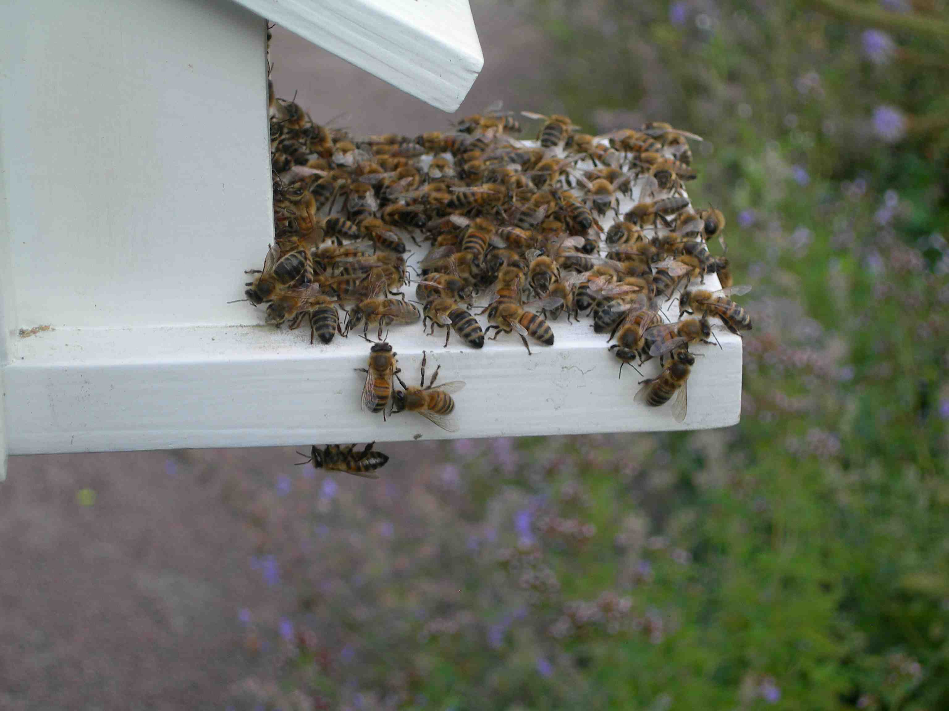 Bin på flustret till sin fönsterförsedda bikupa i Trädgårdsföreningen. Söndag 31 juli 2011 kl 19.03.