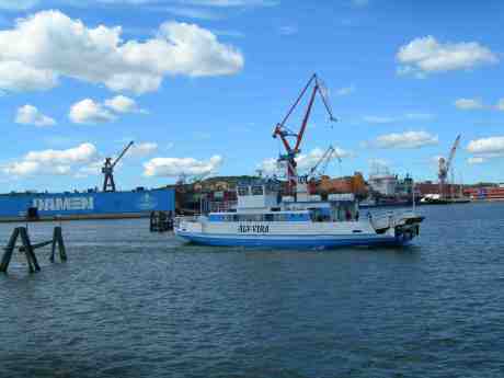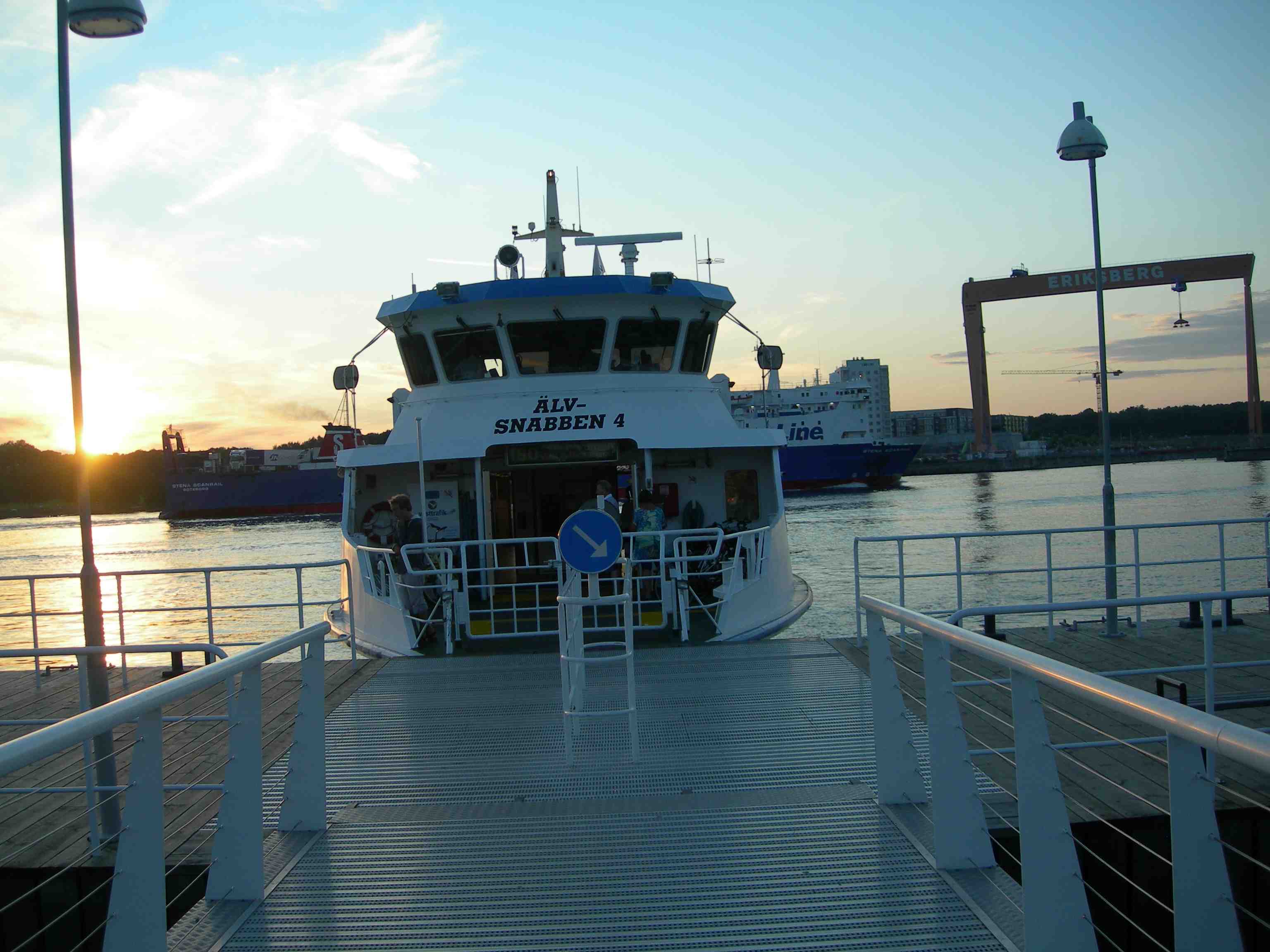 Älvsnabben 4 med Stena Scanrail på tvärs akterut och Eriksbergs bockkran i fonden. Tisdag 2 augusti 2011 kl 20.58.
