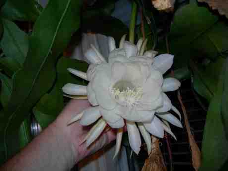 Nattens drottning (Epiphyllum oxypetalum?) blommar på Kronhusgatan. Lördag 16 juli 2011 kl 01.02.
