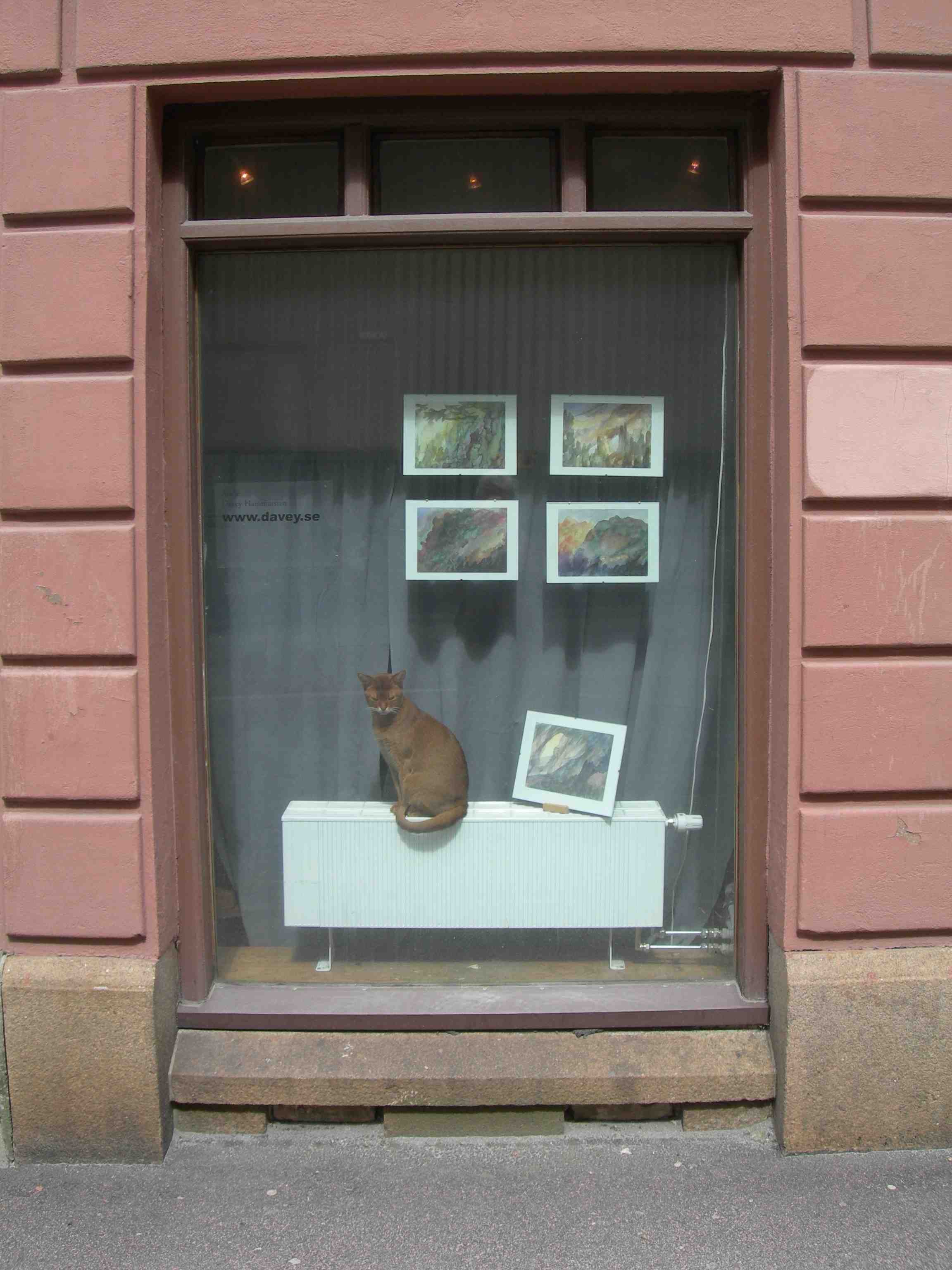 Levande skyltkatt på Surbrunnsgatan. Fredag 24 juni 2011 kl 14.39.