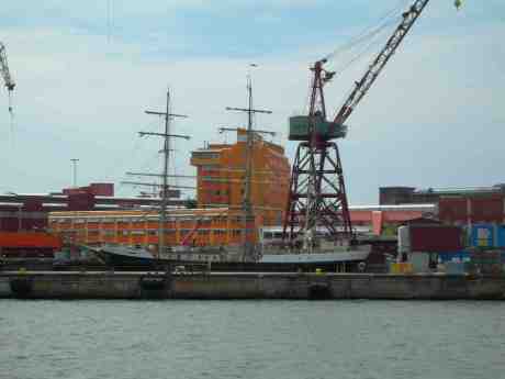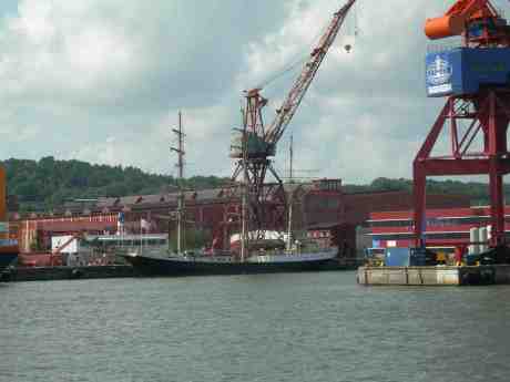 Barken Gunilla har lämnat Götaverken Cityvarvets flytdocka. Lördag 9 juli 2011 kl 15.33.