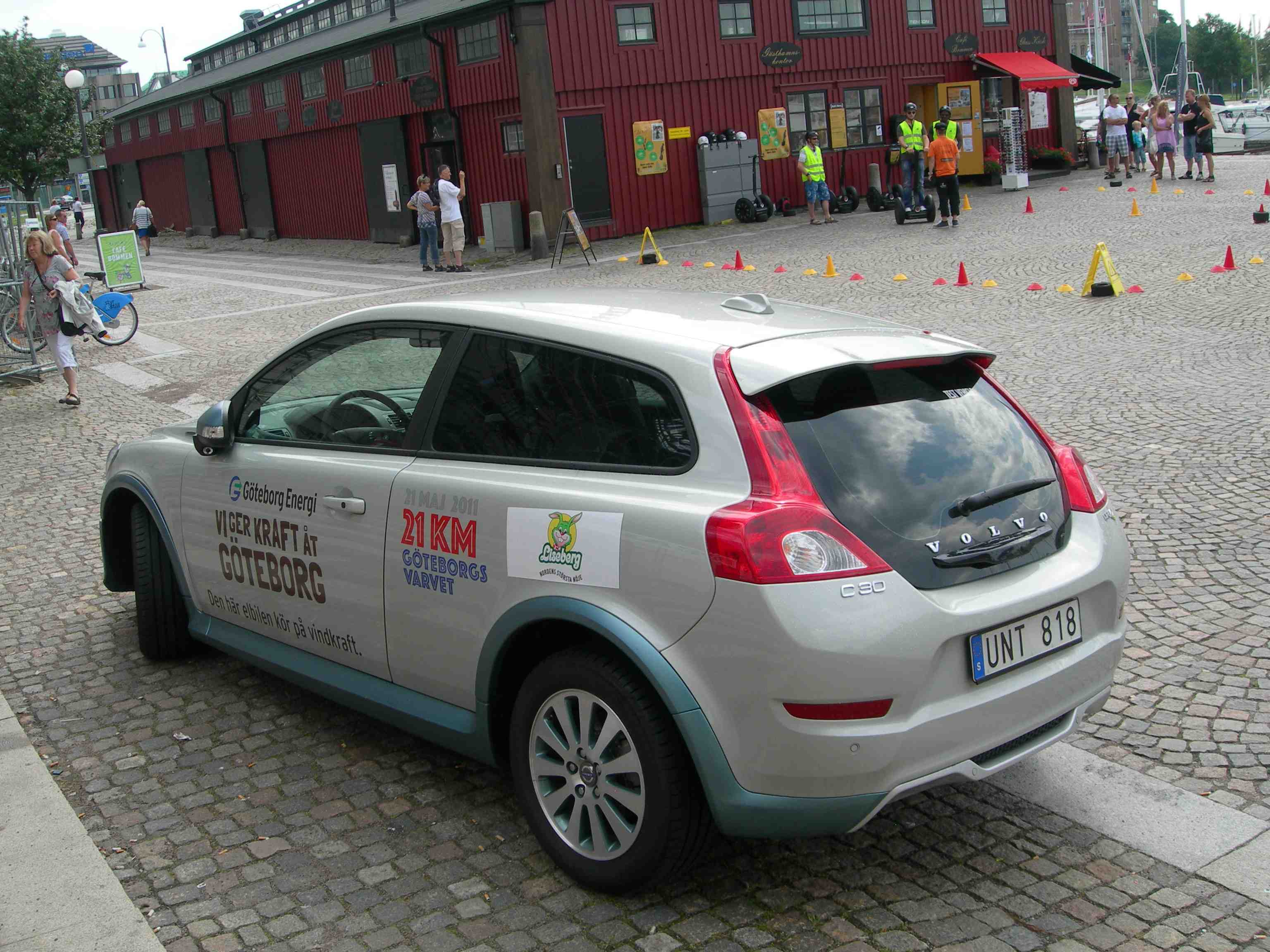 Volvo C30 Electric på Lilla Bommens Torg med Segwayuthyrning i bakgrunden. Måndag 1 augusti 2011 kl 14.56.